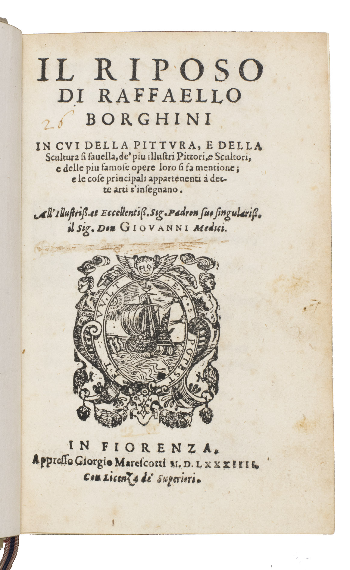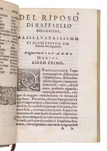 First edition, in the original Italian, of a classic account of the history and science of Renaissance art and artists: "the first art treatise specifically directed towards a lay audience" (Ellis, p. 2). Written by Raffaele Borghini (1537-1588), a Florentine poet and art historian, the work is an important record of the Counter-Reformation views of art, contesting Vasaris positive view of Mannerism, and includes a philosophical background on the merits of painting and sculpture, technical information, art theoretical criteria and their art critical application, and an art historical survey.