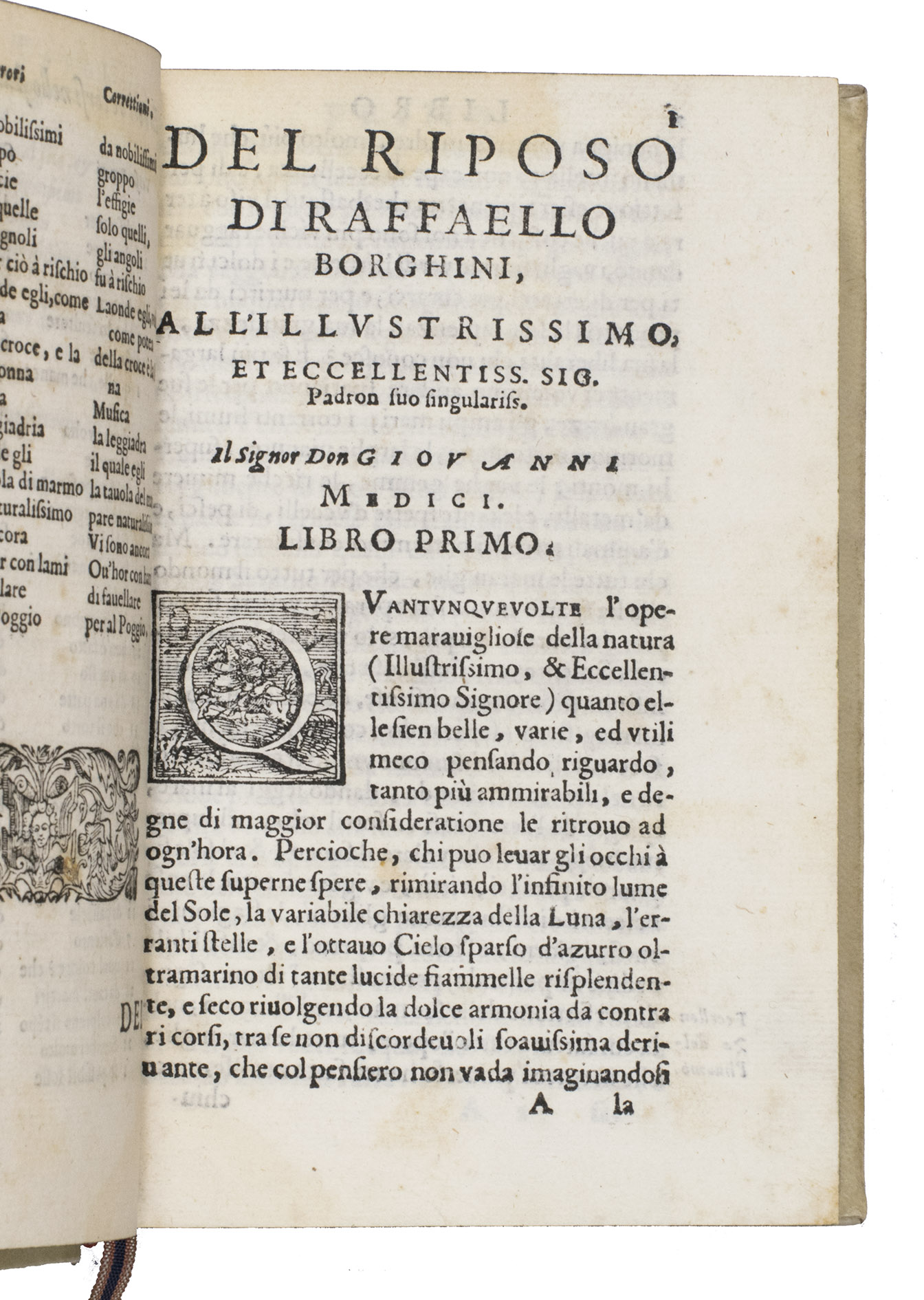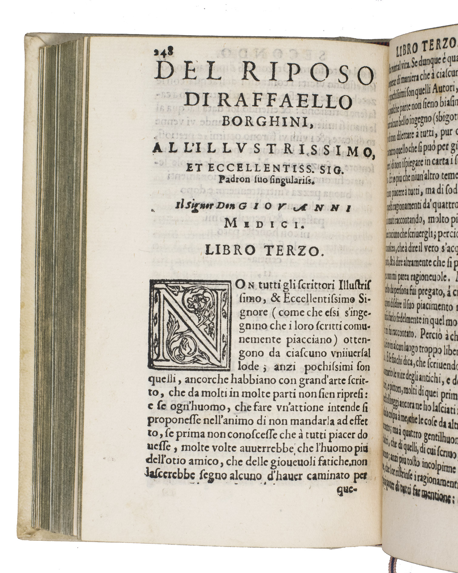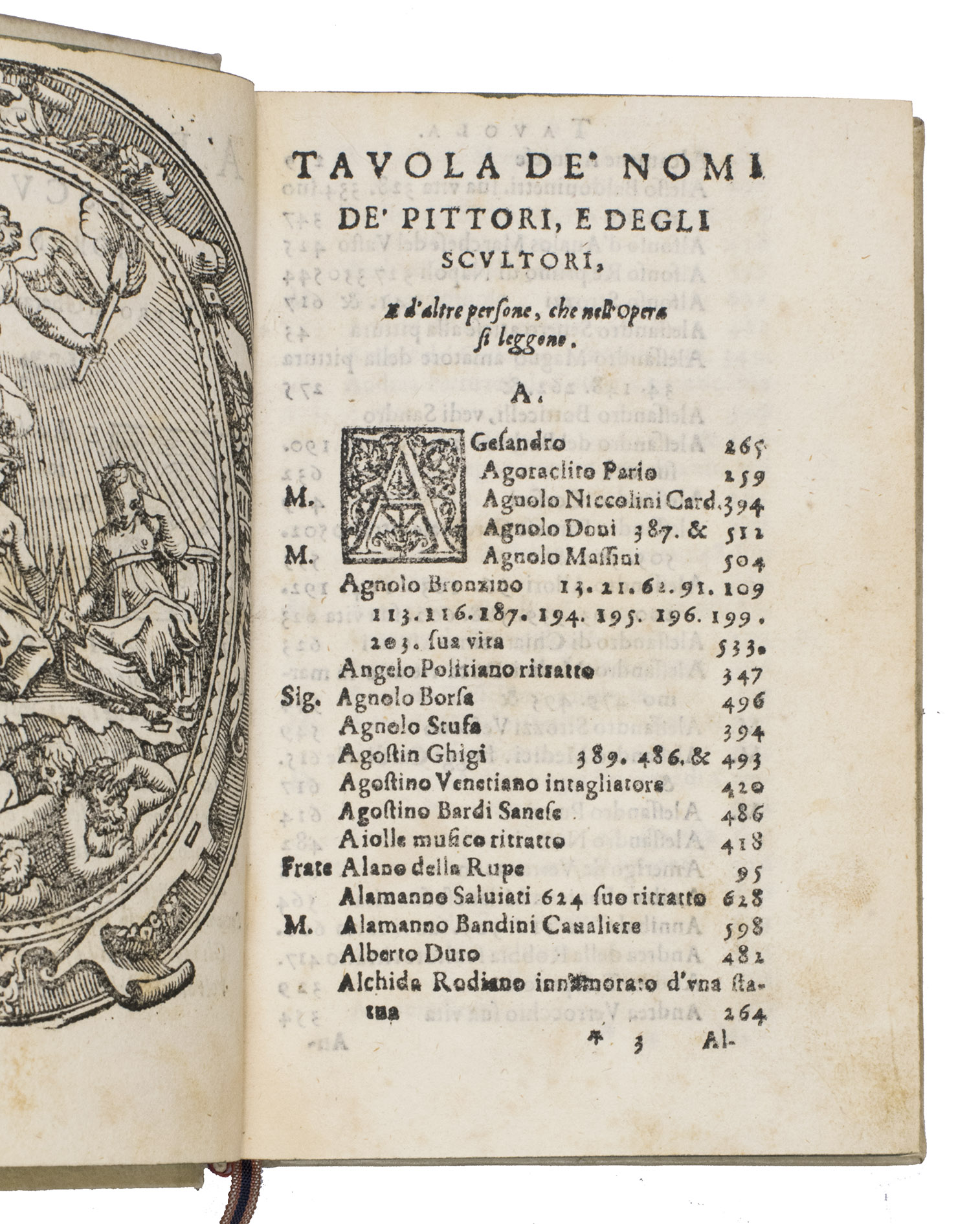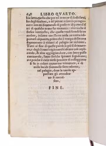 With a few contemporary annotations, and an early owners name struck through and erased on the title page. From the collection of Count Giacomo Manzoni (1816-1889) in Milan, with his small armorial bookplate on the front paste-down, recorded in the 1893 auction catalogue of his library, and with the purchasers name C. R[?]oebel and price on a free endleaf. Washed, with the cartouche of the allegorical woodcut shaved at the fore-edge and with an occasional minor and usually marginal stain, but otherwise in very good condition. An essential source for any study of art history and especially of the formation of standards of taste among art collectors. Adams B2495; Cicognara 22117; EDIT 16, 7120; Gamba, Testi lingua Italiana (1839), 241; Cat. Jacques Manzoni II (1893), 4443 (this copy); Moreni, Bibl. Toscana I, p. 149; Razzolini, Bibl. testi lingua a stampa (1878), p. 71; Schlosser, Littérature artistique (1984), p. 376; STC Italian p. 120; USTC 816377; Verga, Bibl. Vinciana, 124; cf. Lloyd H. Ellis, introduction to Raffaello Borghini, Il riposo (2007), pp. 1-39.