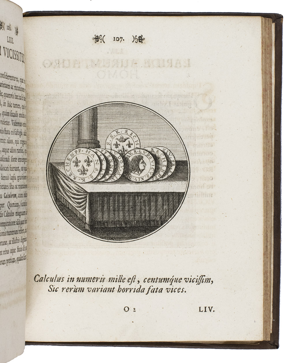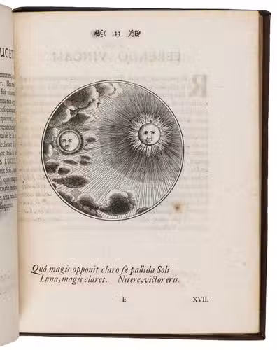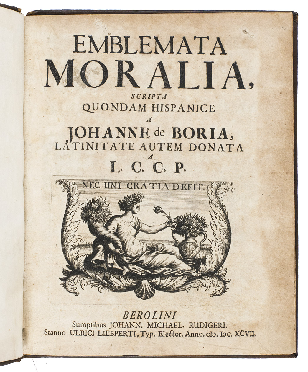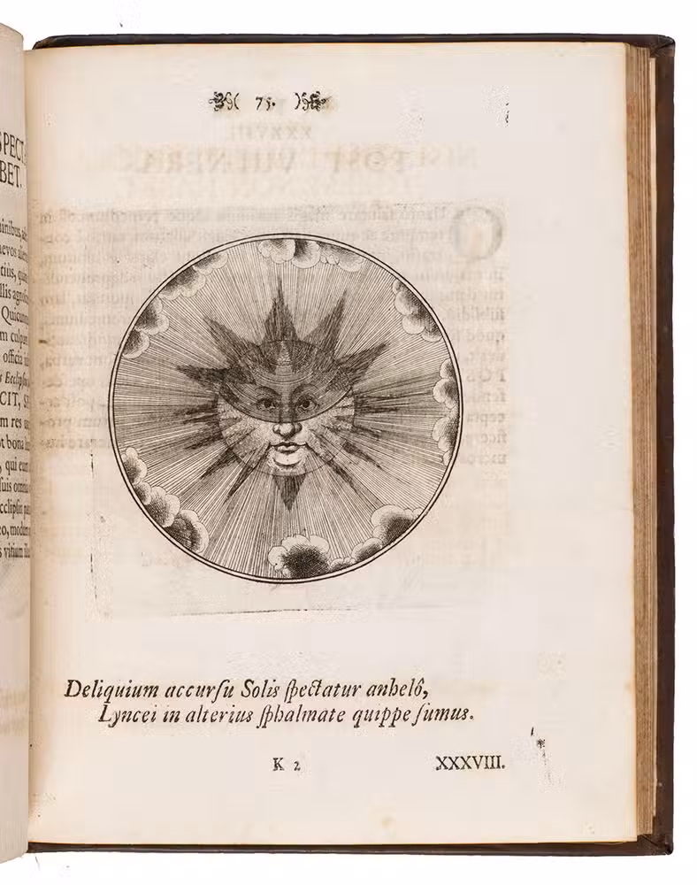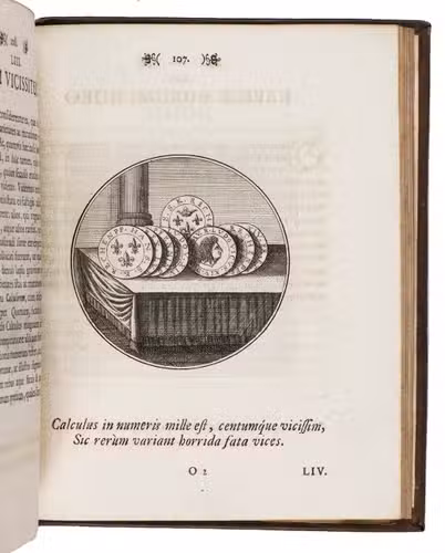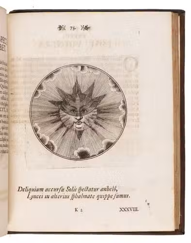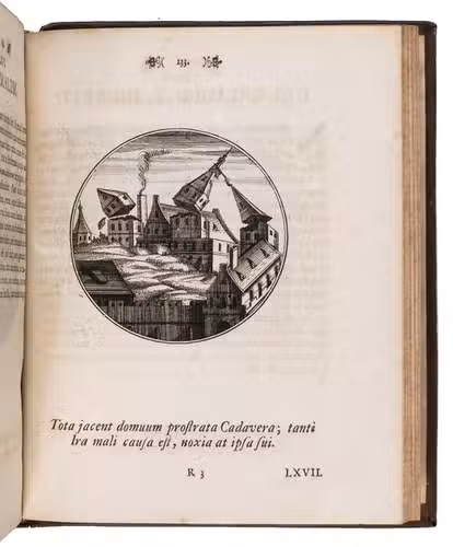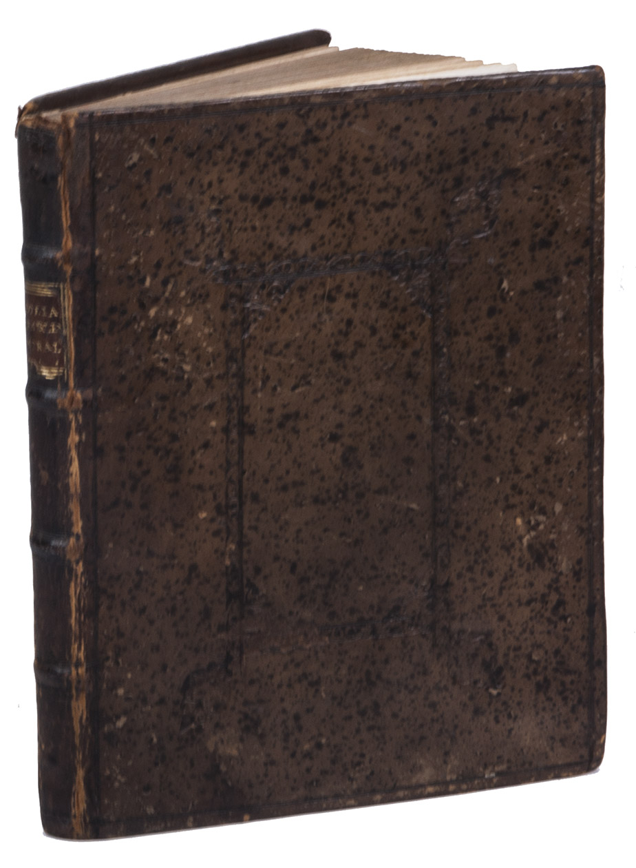 Berlin, Johann Michael Rudiger, Ulrich Liebpert, 1697. Small 4to. With large engraved device on title-page, 100 finely engraved circular emblems by J.C. Schott. 18th-century blind-tooled mottled sheepskin. [6], 201, [1 blank] pp.