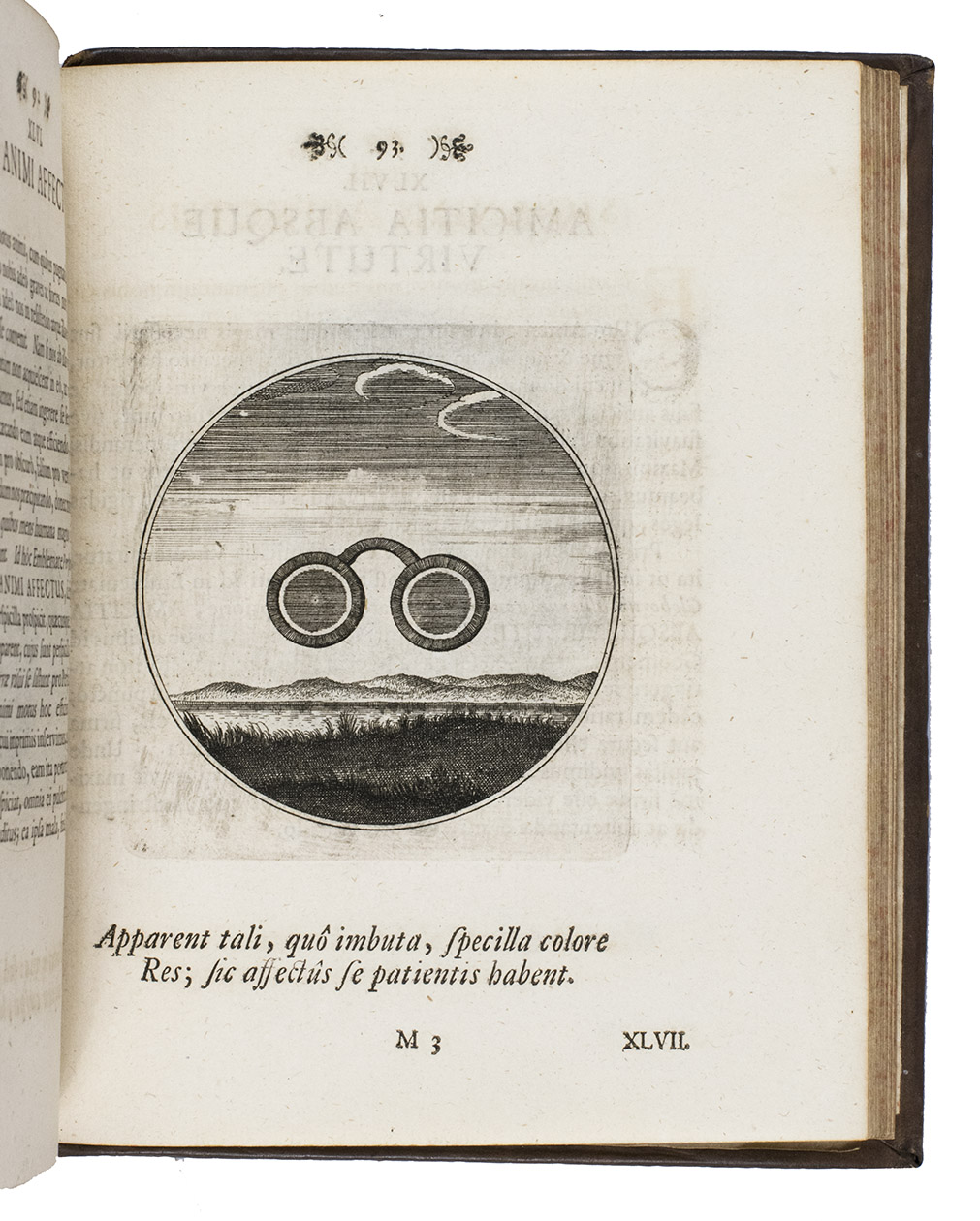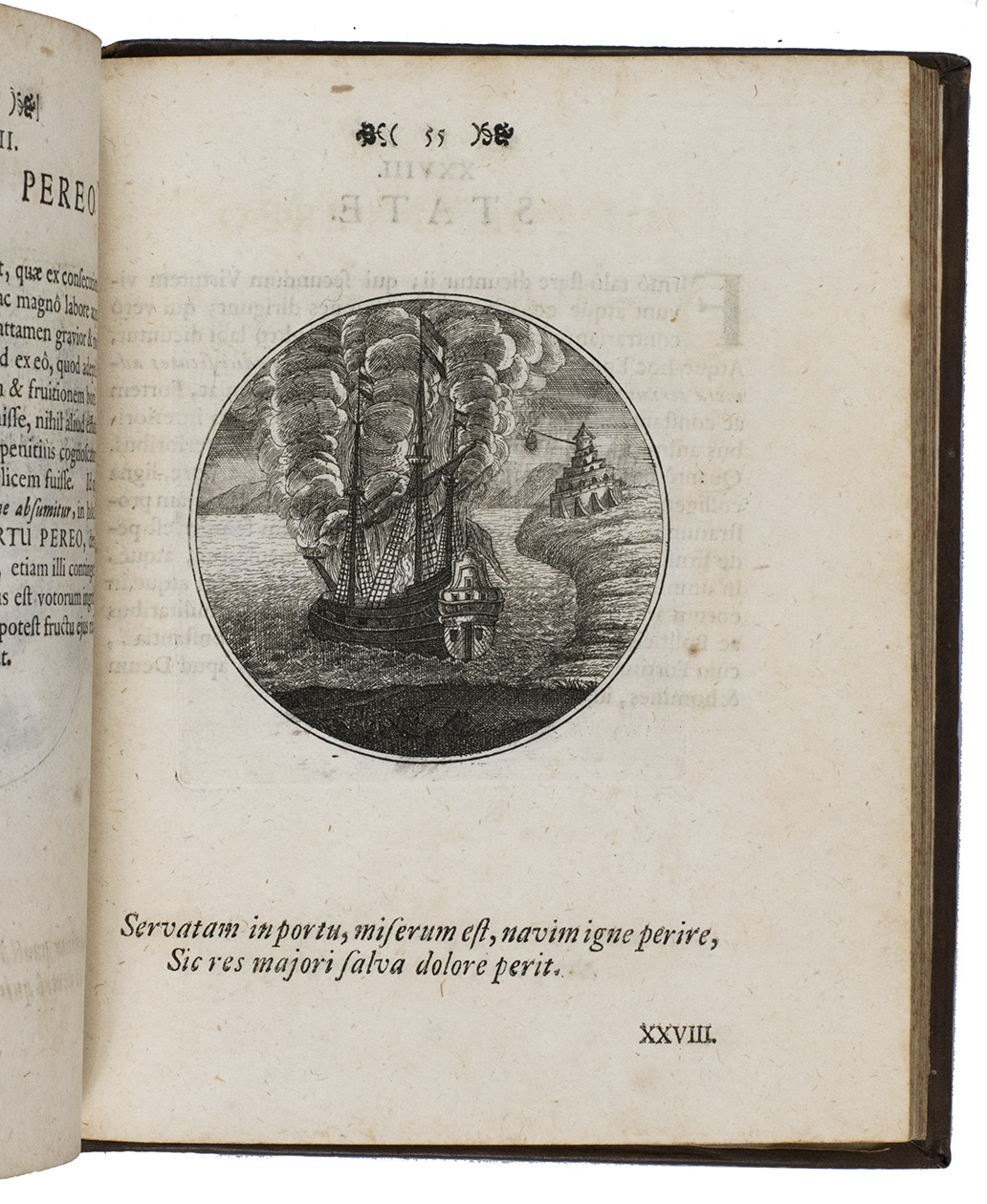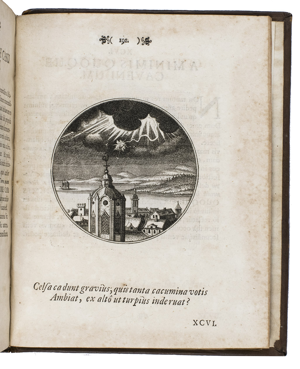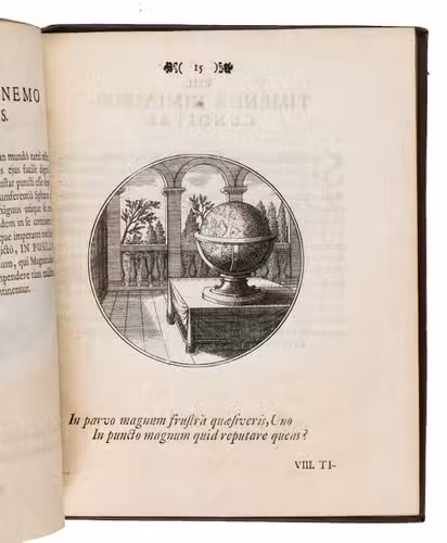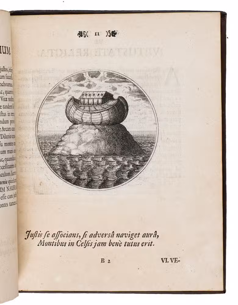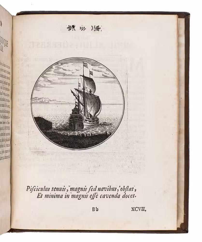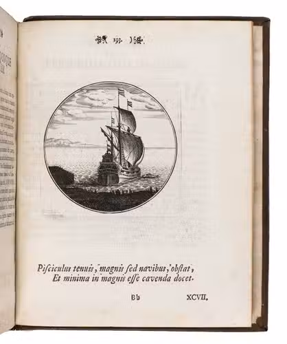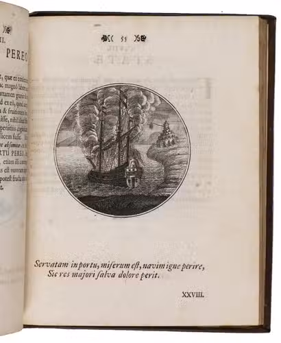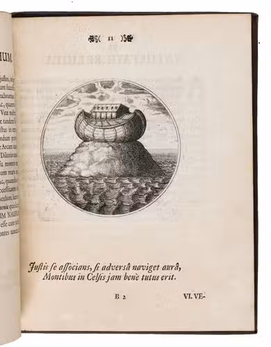 First Latin edition of a Spanish emblem book, translated by Ludovicus Camerarius, first published in Spanish at Prague in 1581. Each of the 100 moralistic emblems appears on a recto with a 2-line verse below it and a motto and Latin prose explanation on the facing page. The emblems depict all sorts of subjects: animals, trees and other plants, vases, buildings, the elements, lightning hitting a temple, lamps, a cobweb, a sword, sailing ships, a terrestrial globe, Heracles in his lionskin holding a celestial globe, Noah's Ark on mount Ararat, a huge pair of glasses in the sky above a landscape, and many more.
