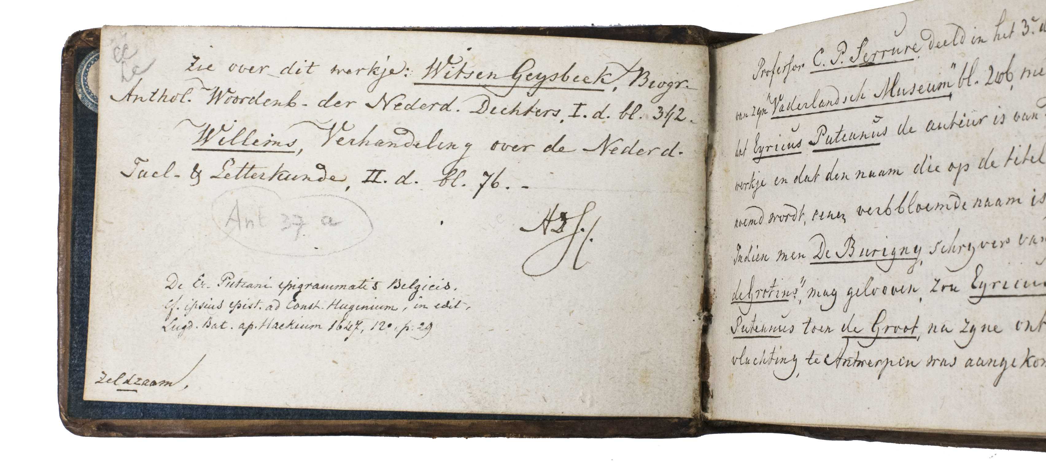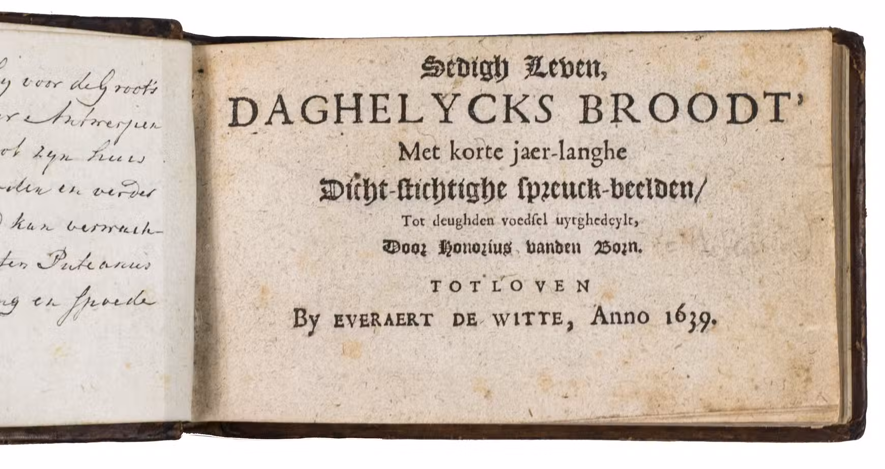 With the bookplate of the great Dutch book collector Isaac Meulman (1807-1868) mounted on the front pastedown, the bookplate of the Belgian bibliophile Jules Capron (1829-1897) mounted on the recto of the first flyleaf, some 19th-century annotations in pencil on the verso of the first flyleaf and the recto and verso of the second flyleaf, and a green stamp on the recto of the final flyleaf. The work has been re-backed with the original backstrip laid down, the corners and edges of the boards are slightly scuffed, some leaves are shaved (only slightly affecting the text of the first line on the first page of the dedication), some minor spots and a couple restorations. Otherwise in good condition. Bibl. Belgica IV, p. 809; BCNI 9254; STCN 314546219 (2 copy); STCV 3135387 (5 copies, incl. 4 incomplete); WorldCat 1089693161, 1063582881, 943863632, 902295311 (5 copies, incl. 1 incomplete); cf. Dehennin (ed.), Puteanus (Henricus van den Born), Sedigh leven, daghelycks broodt (Ghent, 1999).
