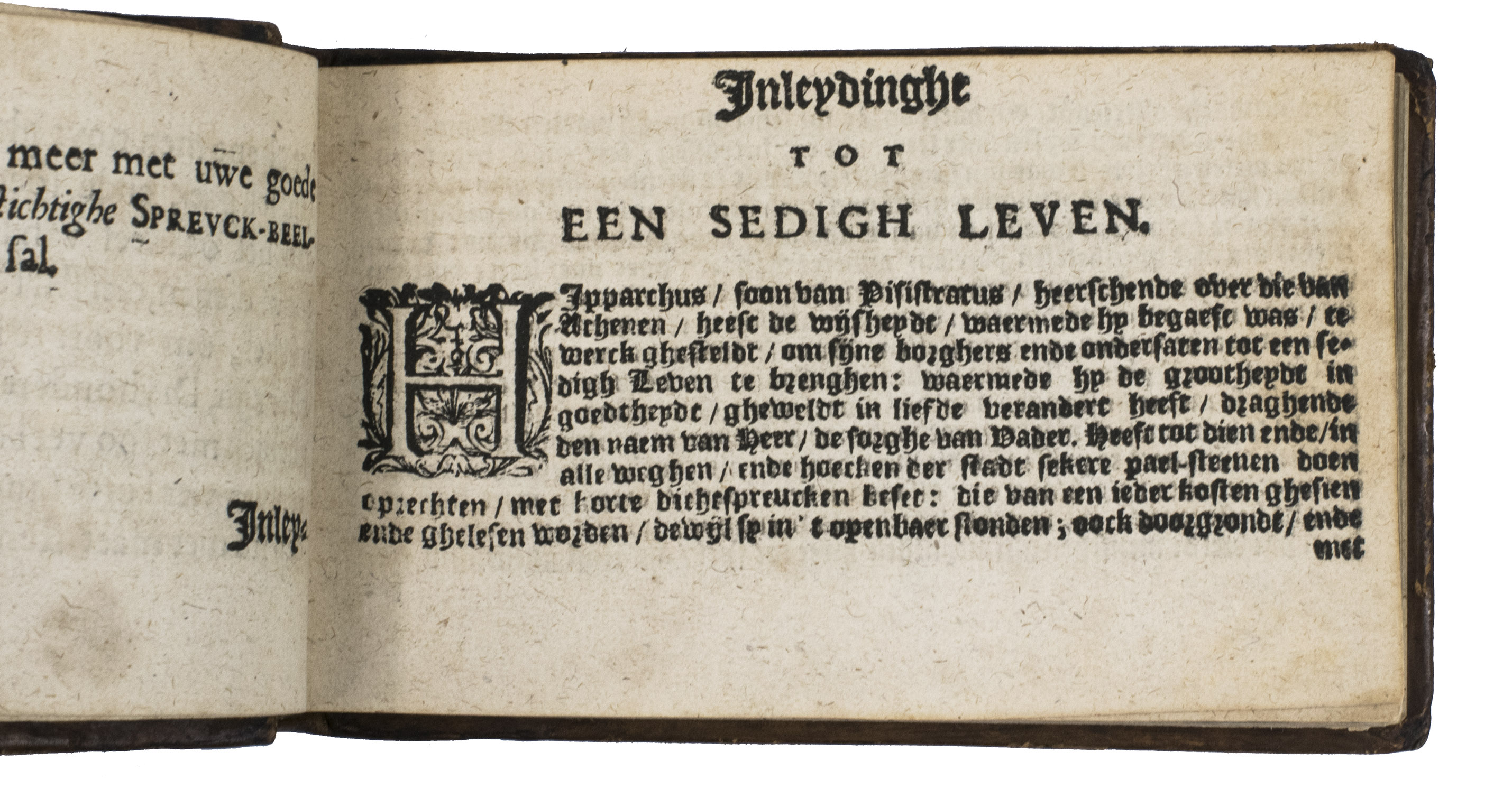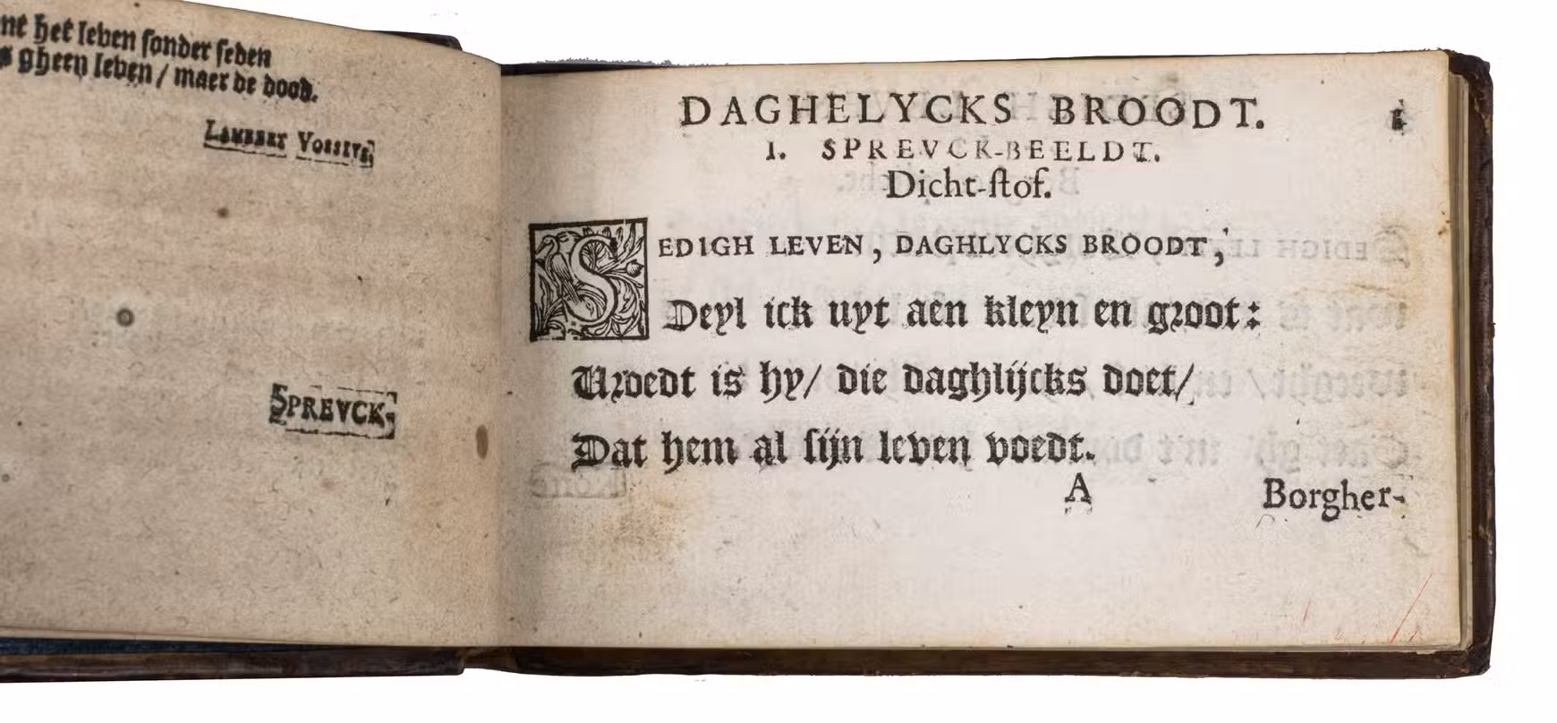 The work was published under the pseudonym Honorius van den Born, which belonged to Erycius Puteanus (Eric de Put and other variations of his name, 1574-1646). Puteanus taught Latin and rhetoric for 40 years at the University of Leuven. In 1612, he was appointed as honorary councellor to and by Archduke Albert of Austria. Puteanus published over 100 works, almost exclusively in Latin. With the publication of these verses in his mother tongue, the author wanted to promote the Dutch language. The verses show the influence of stoic philosophy and are devoted to a wide variety of themes, ranging from the education of children to descriptions of professions.