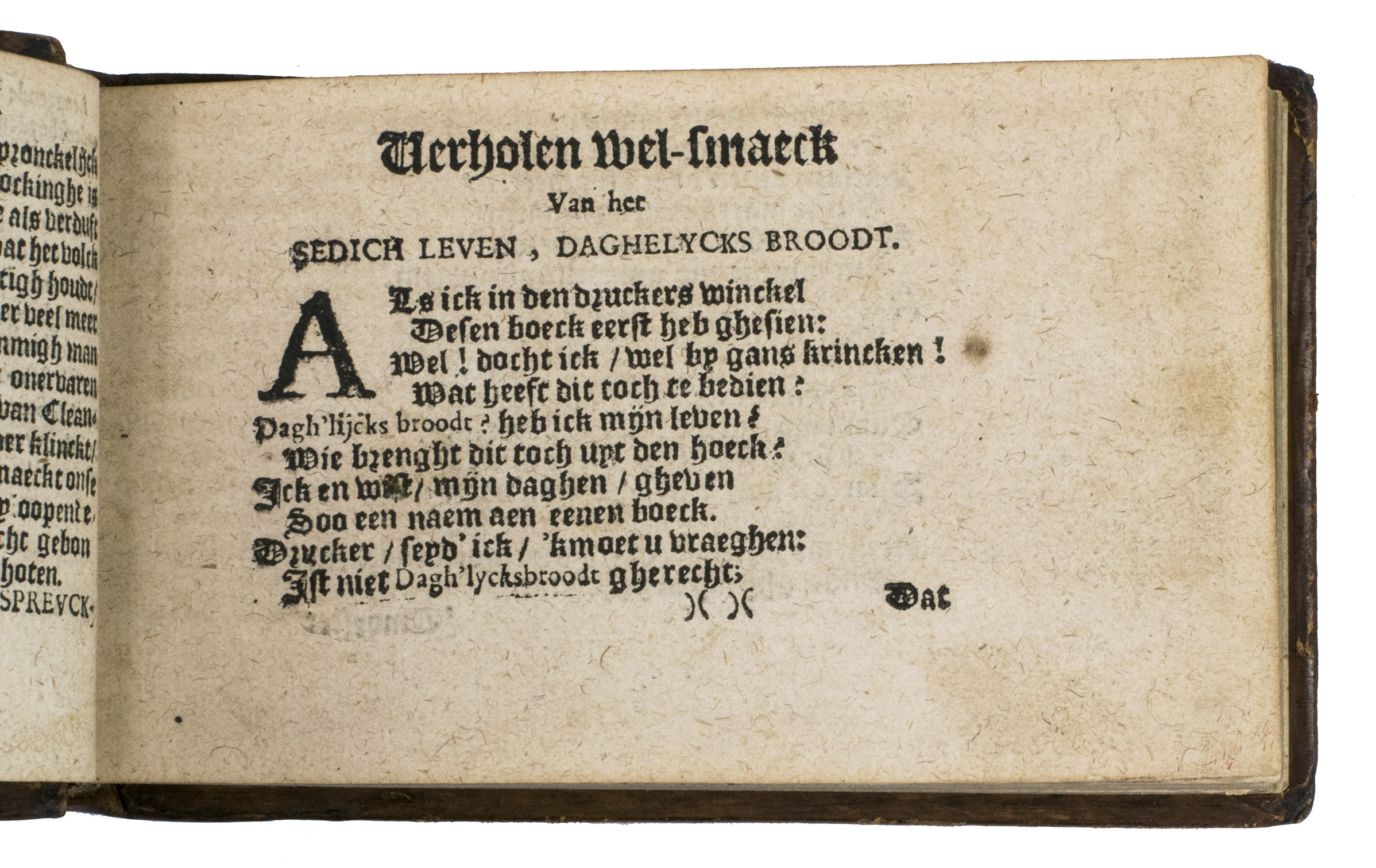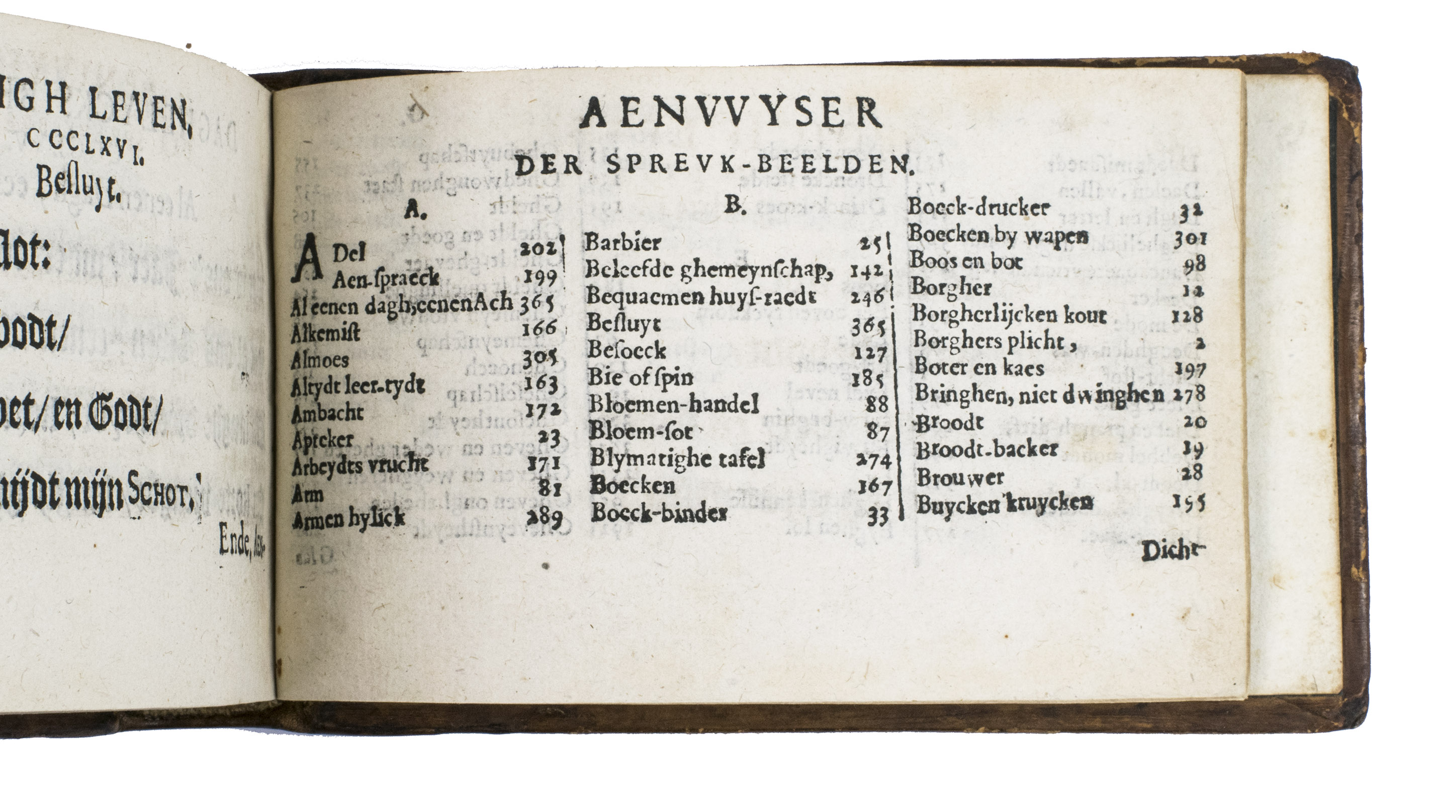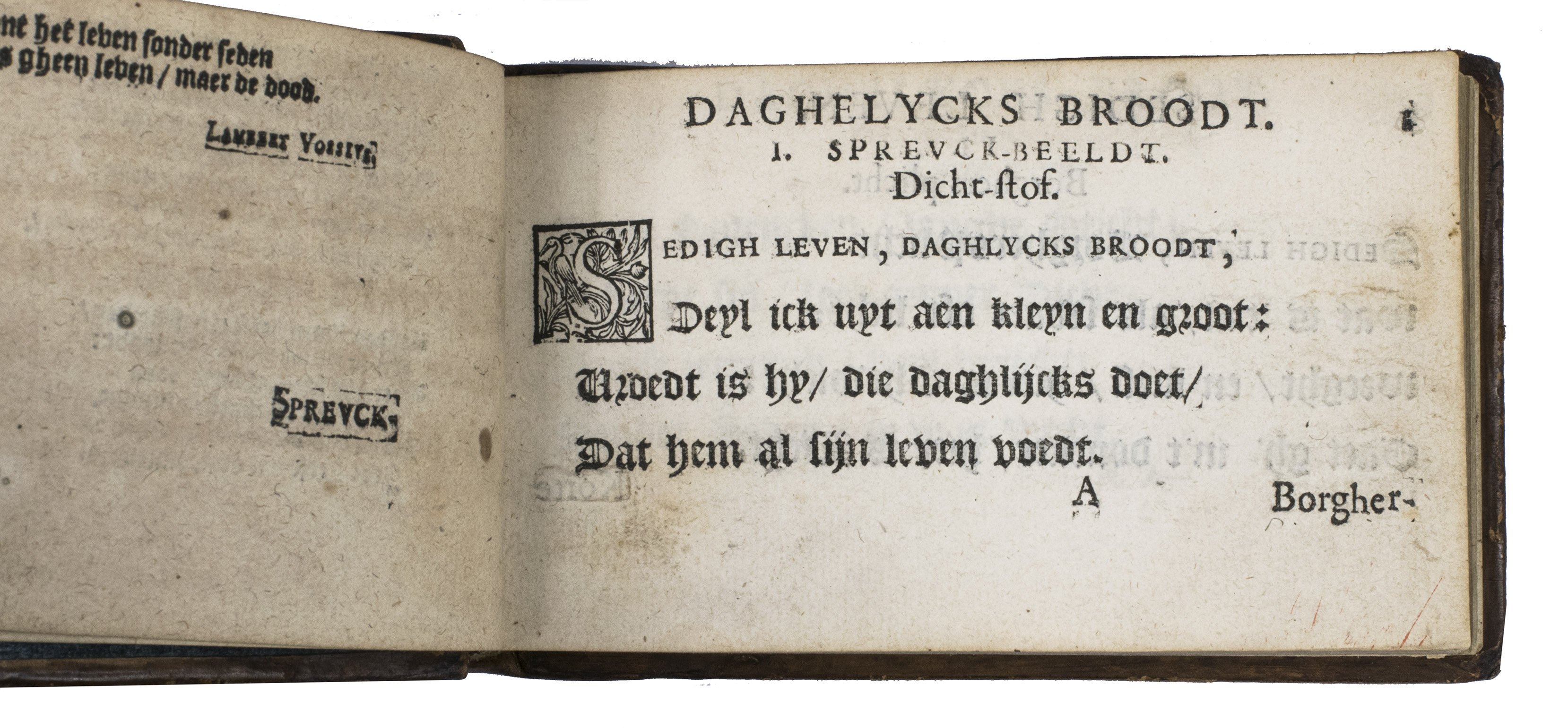 A delightful little volume containing 366 moralistic Dutch epigrams, one for each day of the year. This is the second and much enlarged edition; the first was published the previous year and contained only 255 epigrams.