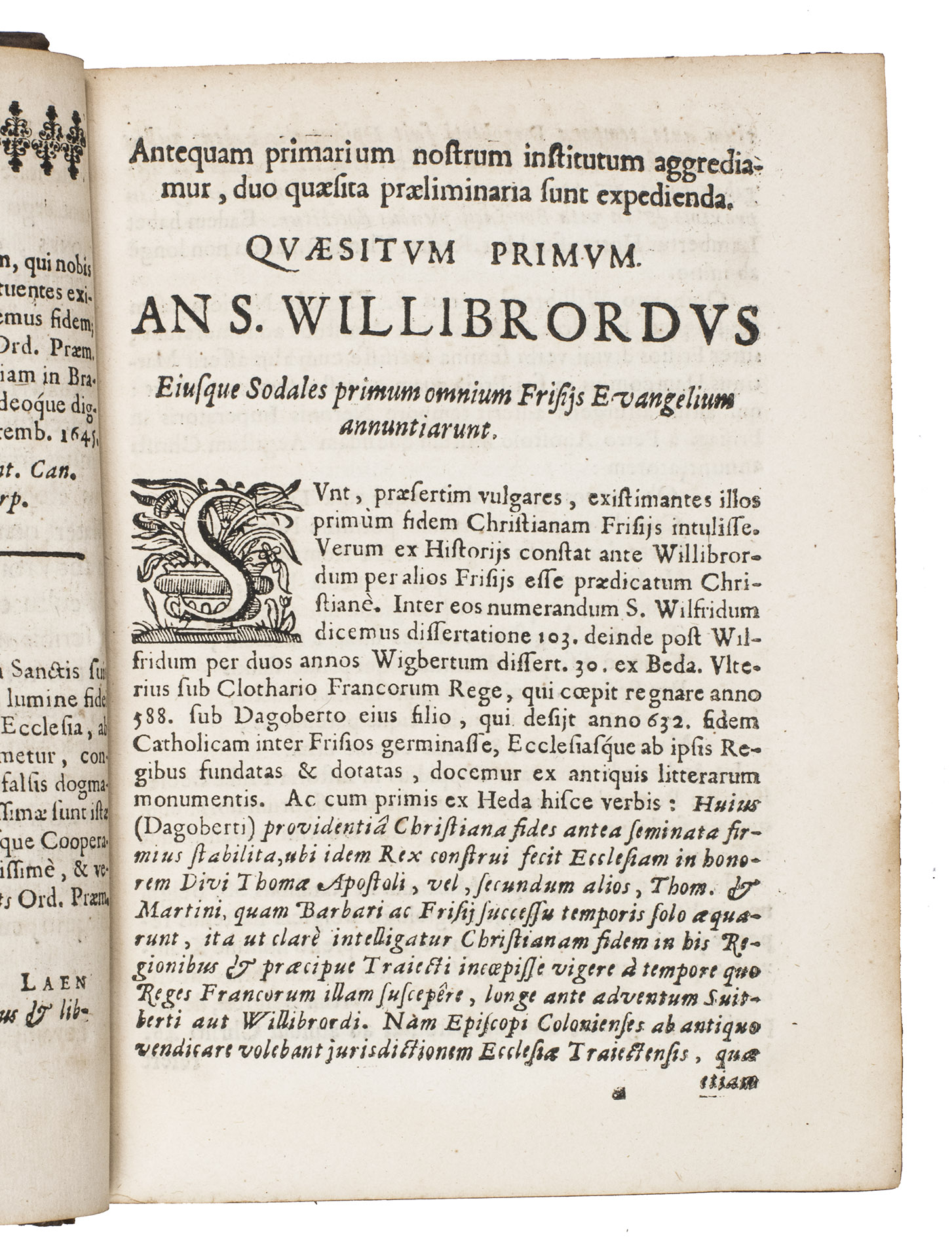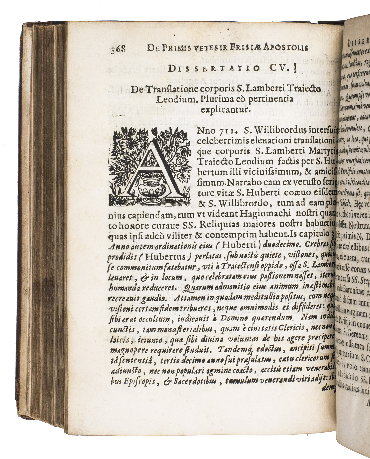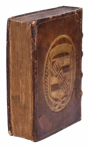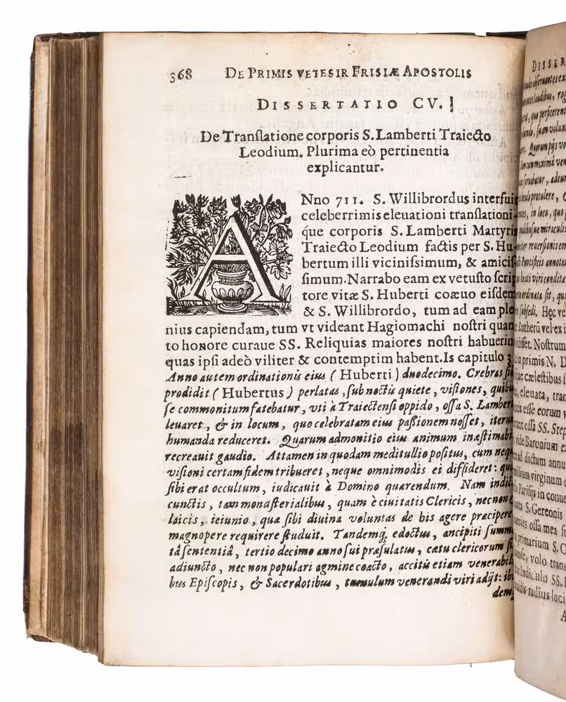 First and only edition on the life and work of the first Roman Catholic missionaries in Friesland, the Netherlands, in an unusual contemporary armorial binding, with the arms of Jean Baptiste Daneels (?-1659), the first Baron of Attenrode, Wever, and Corbeeck-over-Loo, in Flanders. The work was written by Willibrord Bosschaerts (1577-1657), a Premonstratensian monk at Tongerlo, and was the result of both profound scientific research and a shrewd mind, according to Knuttel. In the preliminaries a letter is present, addressed by Erycius Puteanus to the Abbot of Bosschaerts' monastery, and at the end a genealogy of the Bishops of Utrecht, parallel with a genealogy of the Counts of Holland, is added, together with a hymn to the author by Cornelius Musius, and some epigrams, by J. van Westerlaken. The work is rare on the market, as we have only been able to trace two other copies in sales records of the past hundred years.