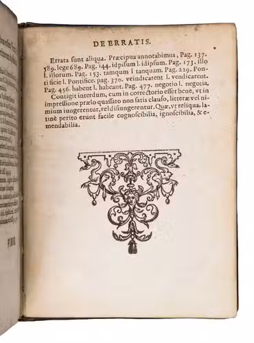 Mechelen, Robert Jaye, 1650. Small 4to. With a woodcut printer's device on the title page, and numerous decorated woodcut initials. Contemporary gold-tooled calf, sewn on 4 supports with the corresponding raised bands on the spine, a fleuron in each compartment on the spine, the large gilt coat of arms of Jean Baptiste Daneels, Baron of Attenrode and of Corbeeck-over-Loo on both boards, within a single fillet frame, gilt edges. [2], [28], 604, 26, [2] pp.