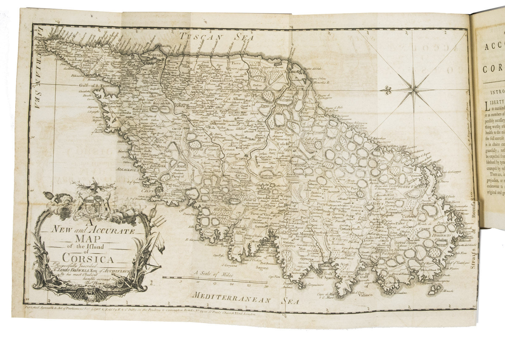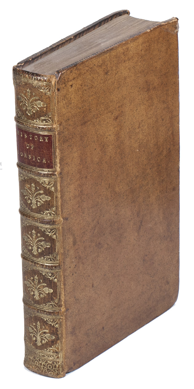 London, for Edward & Charles Dilly in the Poultry, 1768. 2 parts in 1 volume. 8vo. With an engraved coat of arms on the title page, and a large engraved folding map of Corsica. Contemporary gold-tooled sprinkled polished calf. XII, [2], 384 pp.