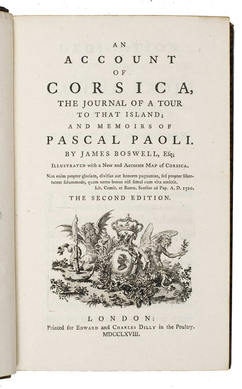 Second edition of a delightful and important travel book by James Boswell (1740-1795), best known as the friend and biographer of Samuel Johnson. His first major publication, it includes a journal of his 1765 visit to the new Republic of Corsica, which had declared its independence from the Republic of Genoa in 1755, as well as his memoires of the Republics founding father and president, Pasquale Paoli (1725-1807). Boswells work made the new republic and its leader famous and helped give them legitimacy. It proved so popular that three more editions appeared before the end of 1768. It is divided into two parts, the first giving a detailed description and history of Corsica, and the second containing a journal of Boswell's voyage to and travels on the island. It was especially this latter part that excited the public, being a lively account of Boswell's quixotic adventures in Corsica and his association with President Paoli.