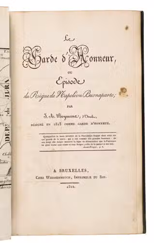 Dedication copy of the first edition of an account of Napoleon's "Garde d'honneur", partly based on the Dutch author's personal experience, as he was one of the young noblemen who were enlisted in 1813 to join Napoleon's Russian army. The present copy is dedicated to G. van der Brugghen, who is otherwise unknown, but was also a member of the nobility and may therefore have been enlisted in Napoleon's army as well. The work offers a fascinating insight into the Dutch experience during Napoleon's campaigns.