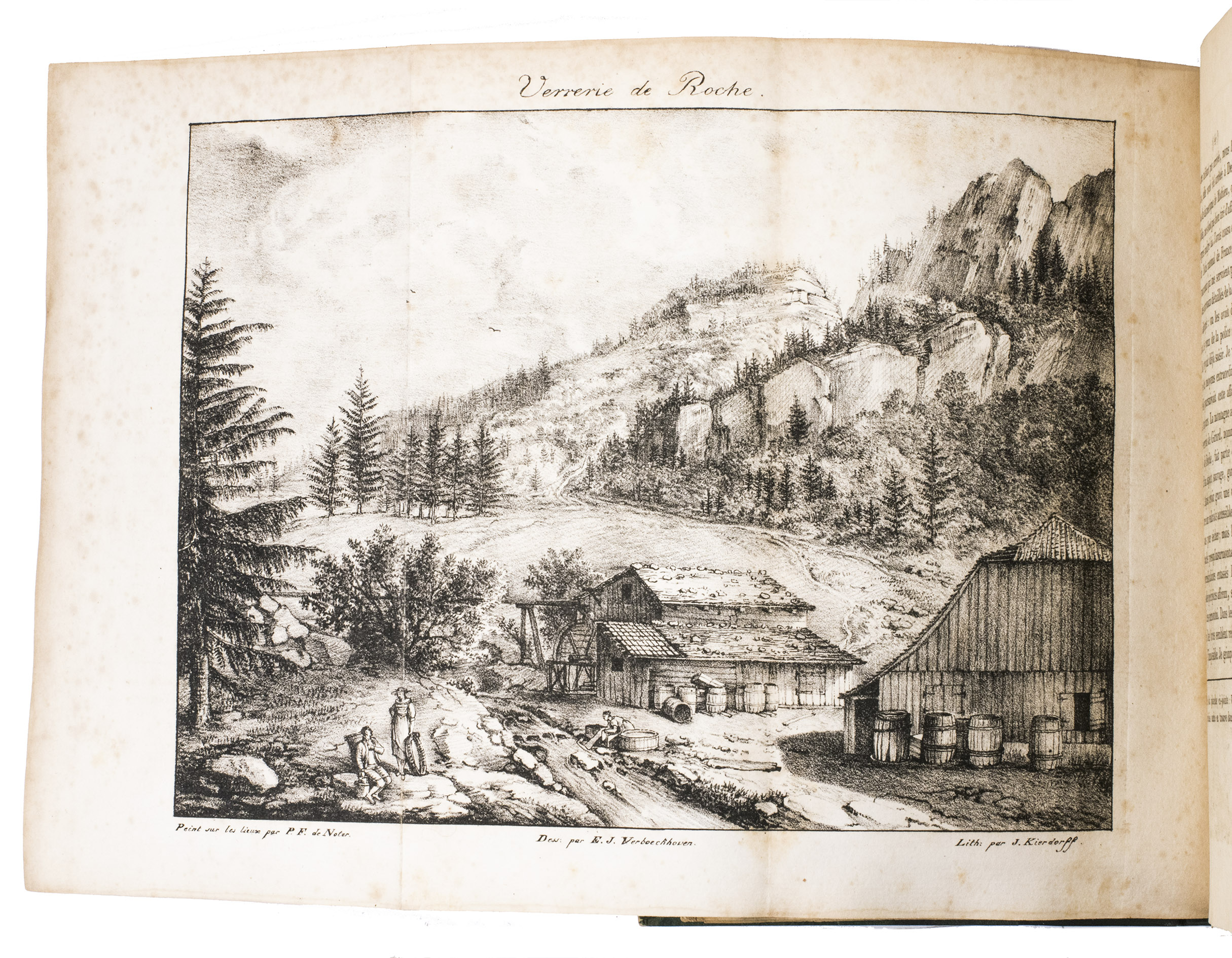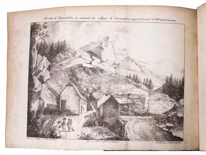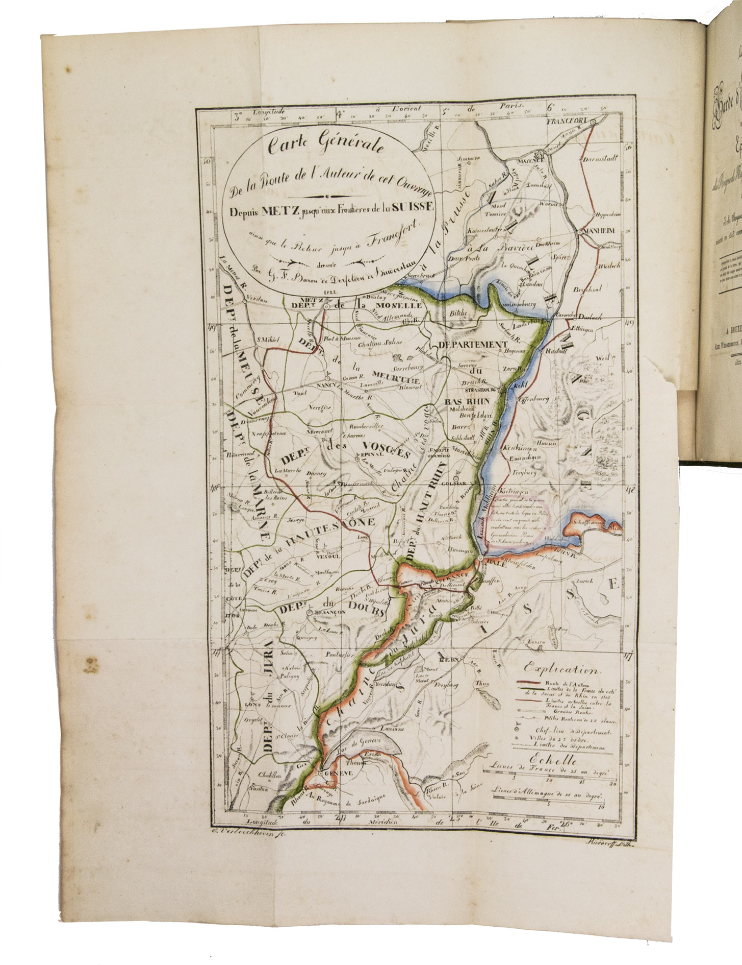 Bruxelles, Weissenbruch, 1822. 8vo. With 2 large folding maps after designs by G.F. Baron de Derfelden de Hinderstein, partly coloured by hand, a white on black phantasmagoric folding lithographed plate, and 4 folding lithographed views by Kierdorff after E. van Boeckhoven. Later gold-and blind tooled half green calf, with the author and title lettered in gold on the spine, green decorative paper sides, green decorative paper end papers. XXXIV, 69, XLI, XVIII, [2], [1 blank] pp.