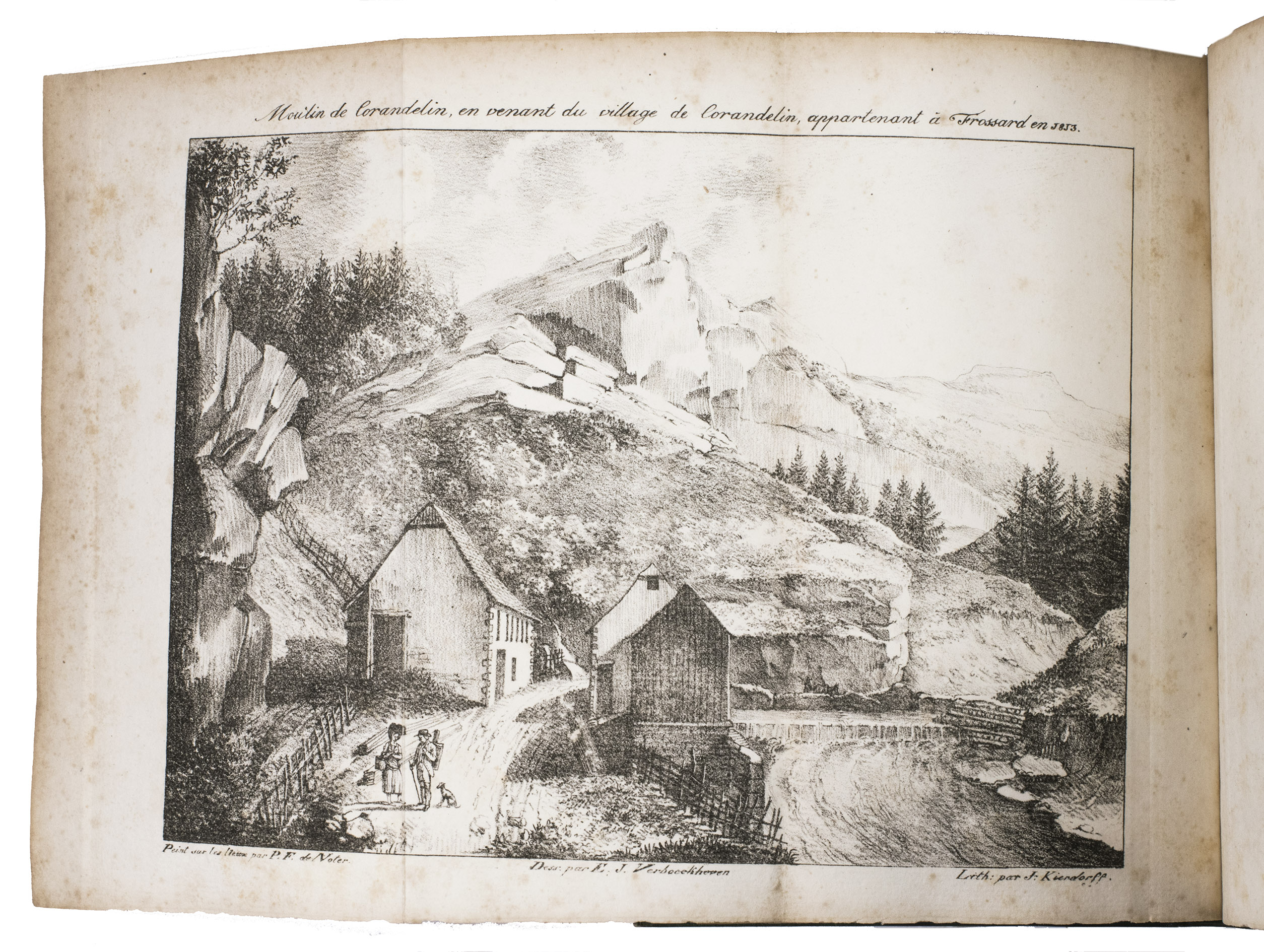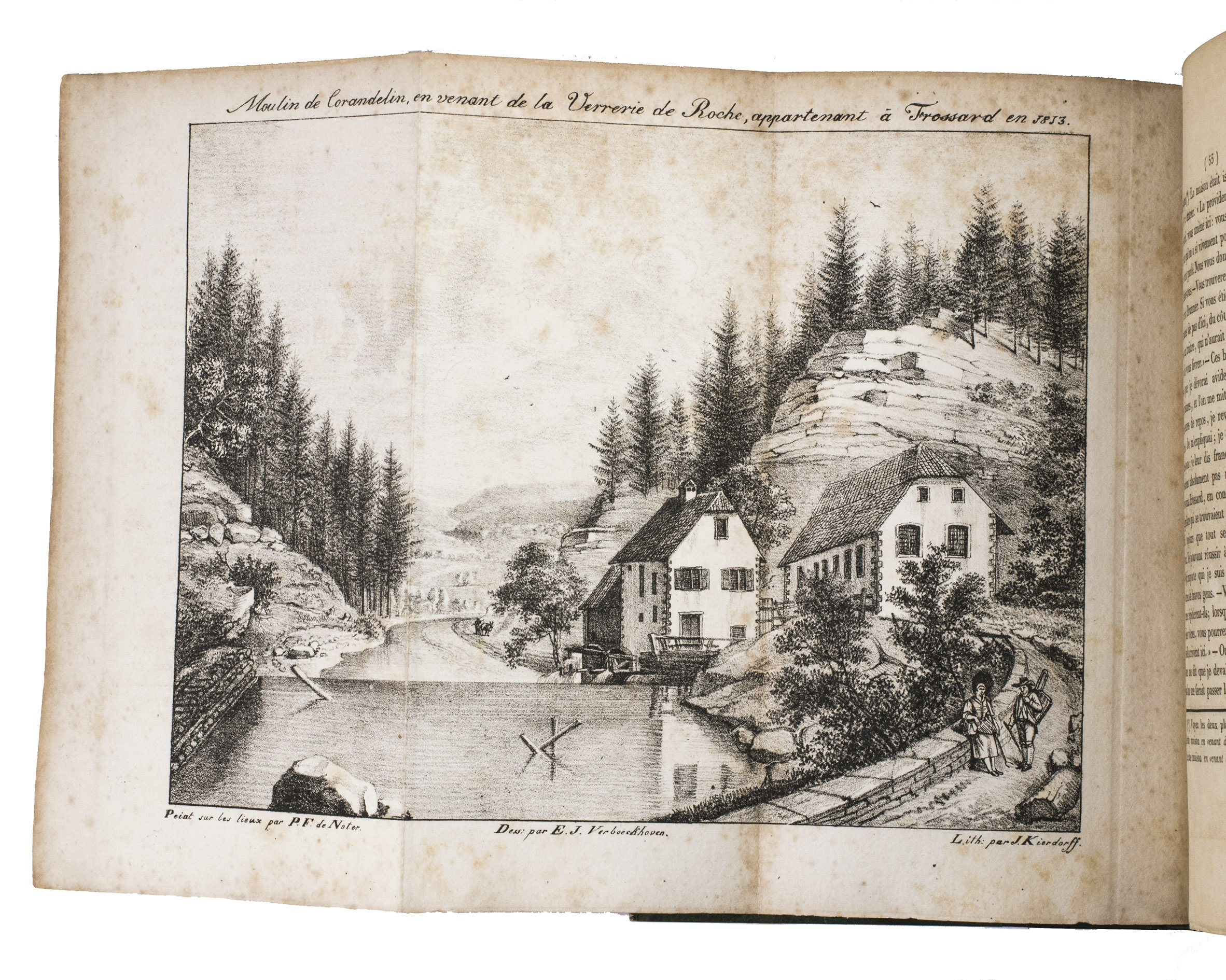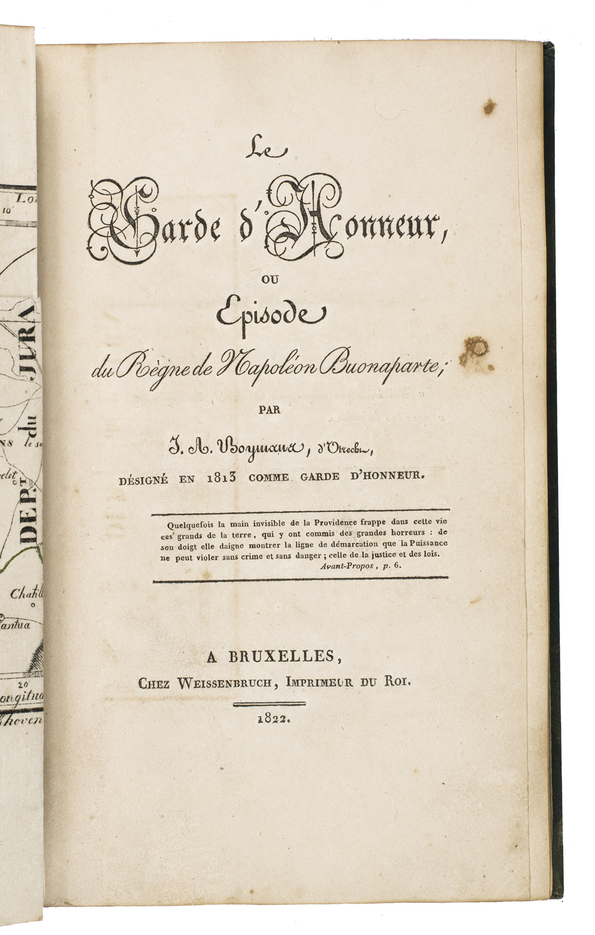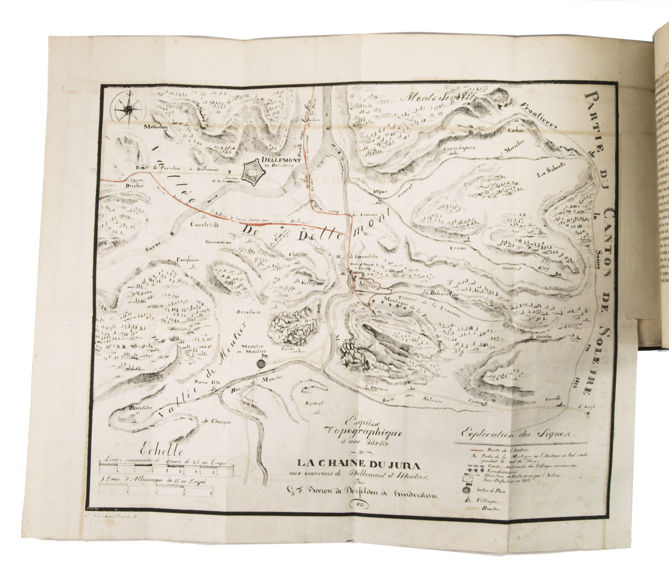 As the son of a fervent Utrecht orangist, who had fled to Prussia during the so-called "Patriot Government" in Utrecht in the 1780s, Johannes Andreas Boymans (or Jan André, 1788-1832) obstructed the Emperial order as best he could. When the army had crossed the Rhine, near the Ardennes, he fled and tried to pass into Switzerland. One of the maps in the present work shows the route the author took from Metz to the Swiss border and back to Frankfurt. The other map shows a part of the Jura. They were both designed by the author's friend and companion Baron de Derfelden de Hinderstein, to which the author also dedicated the work. The plates show views of La Roche and Corandelin. The author also included a number of interesting source documents, and some statistical material. At the end a letter addressed by the author to Dirk Donker Curtius (1792-1864) is added. The latter had complained about the author's description of him as a voluntary and very enthusiastic soldier in the Garde d'honneur, which after the fall of Napoleon must have been rather damaging to his career.