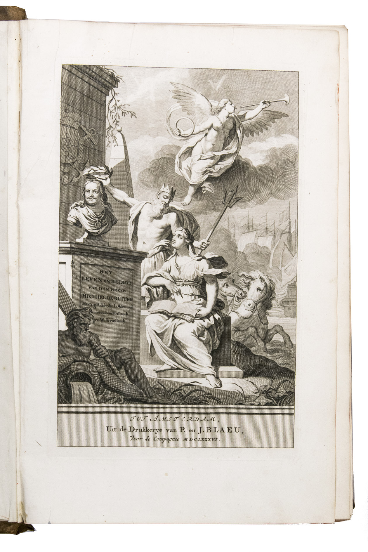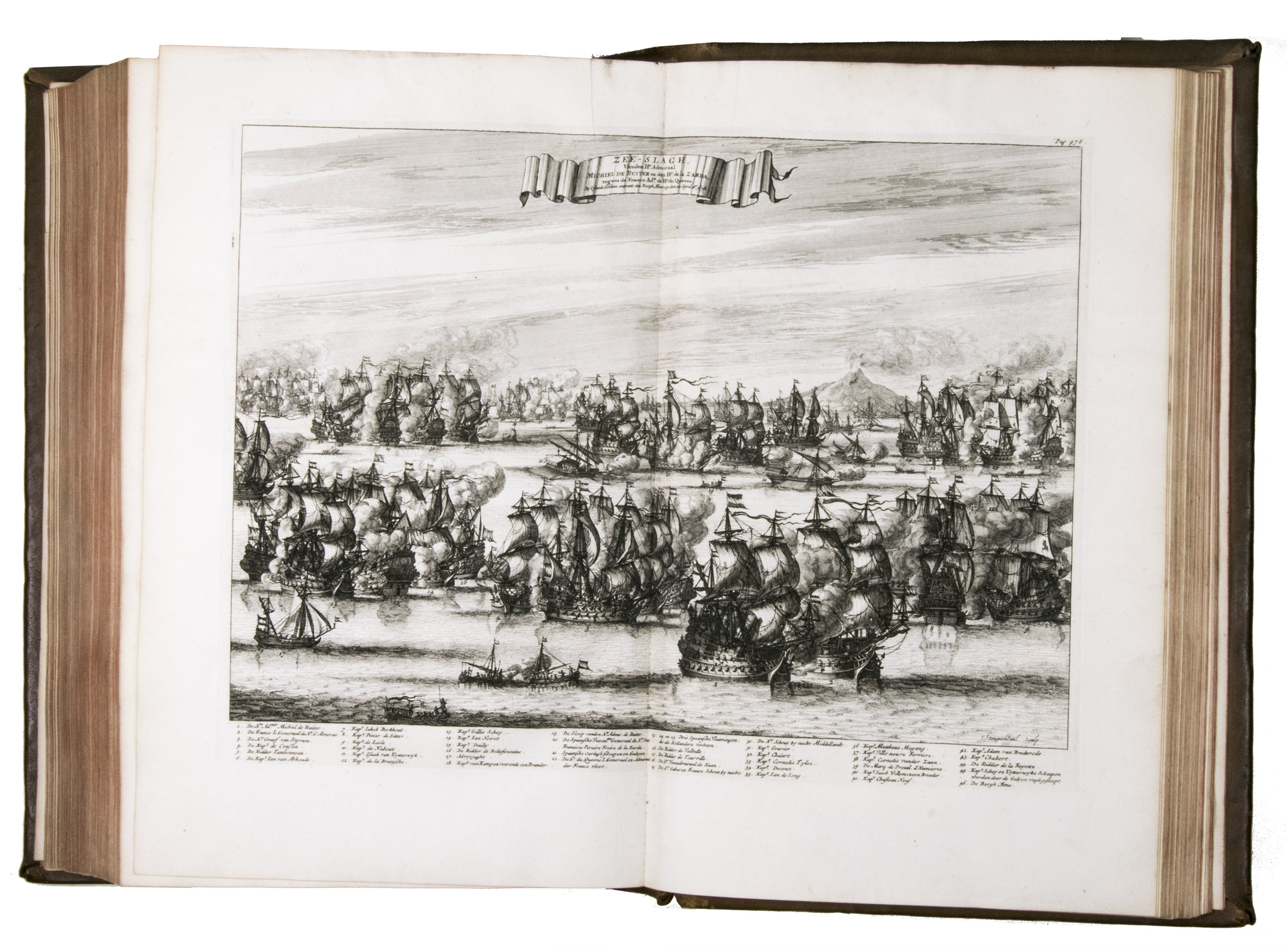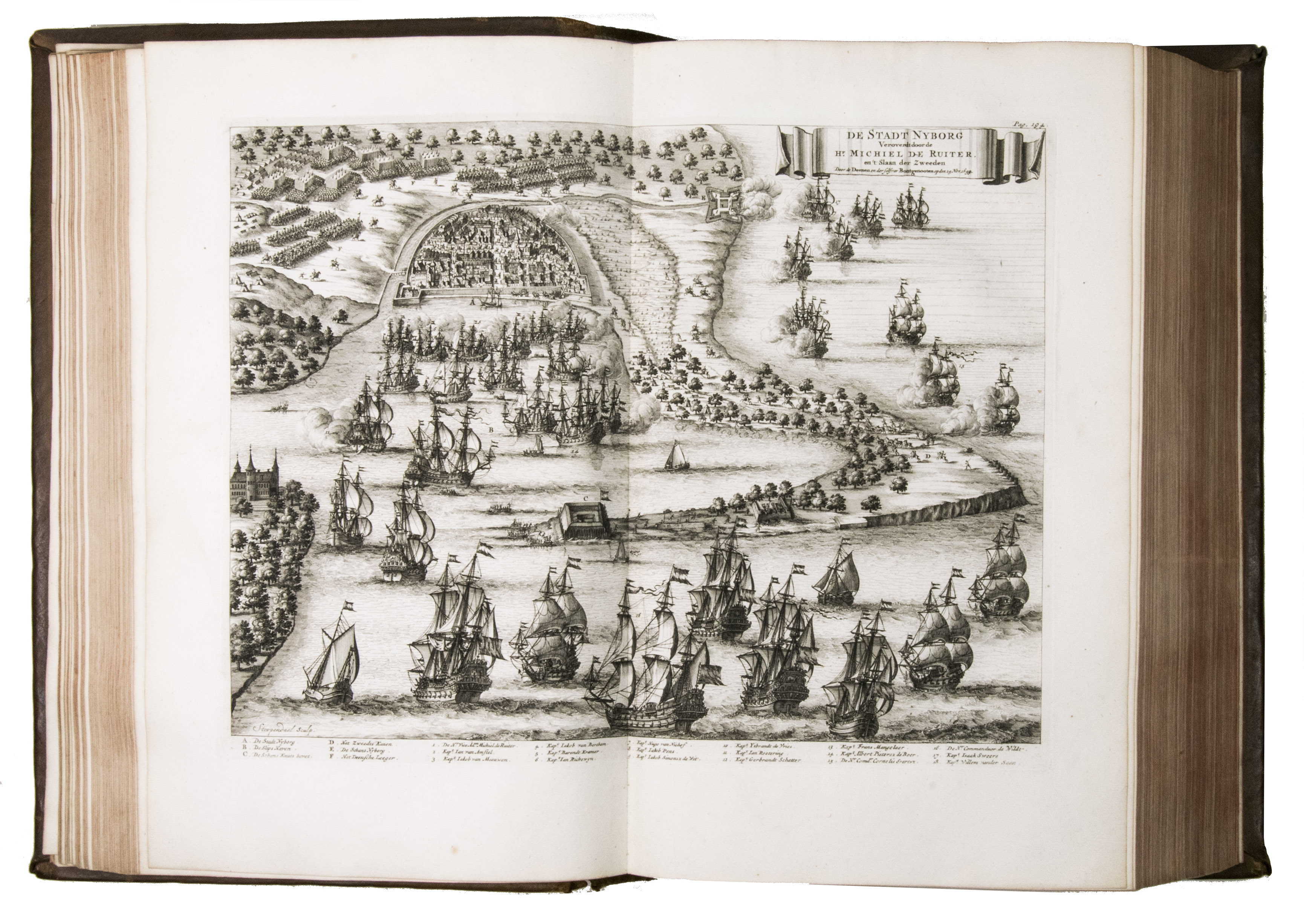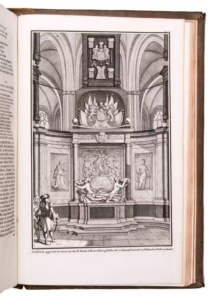 Amsterdam, for Wolfgang, Waesberge, Boom, van Someren and Goethals, 1687 (engraved title-page: printed by Pieter and Joan Blaeu, 1686). Folio (34.5 x 22.5 cm). With engraved title-page, engraved portrait of De Ruyter, 7 engraved double-page plates by Sebastiaen Stoopendaal and 1 engraved plate by Joseph Mulder. Late 18th-century calf, gold-tooled spine. [10], "1063" [=1065], [23] pp.