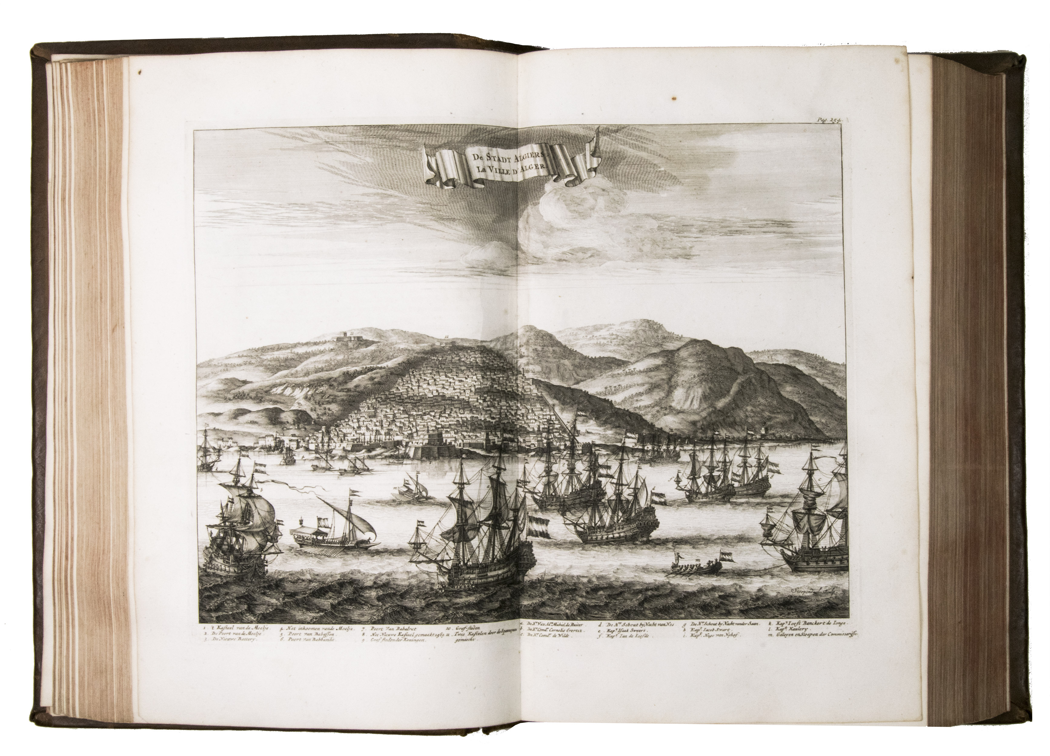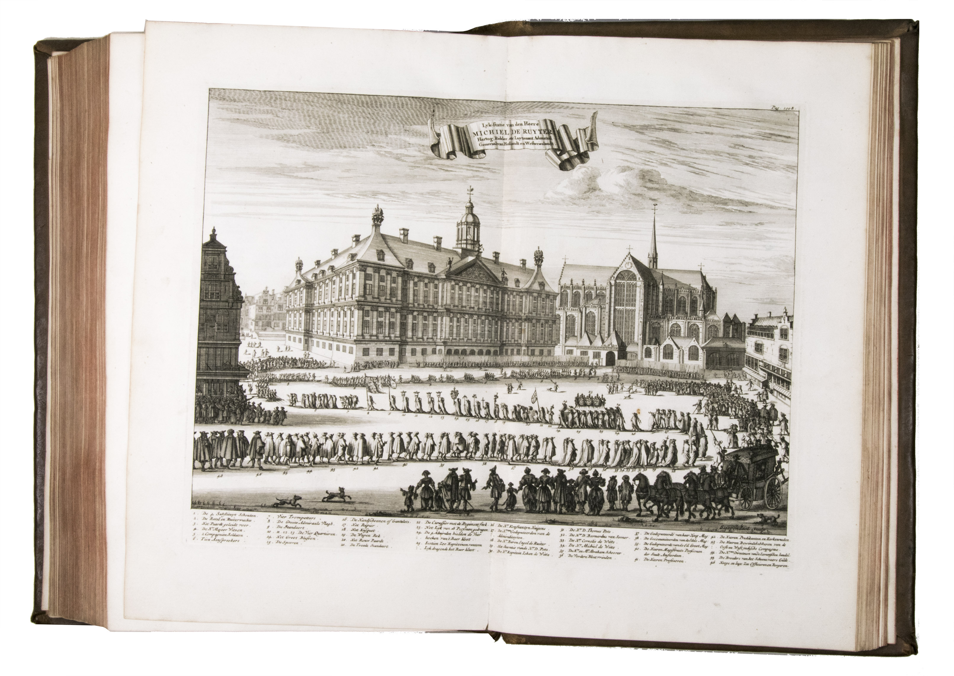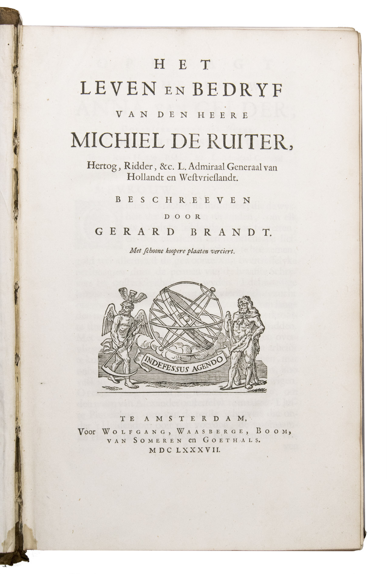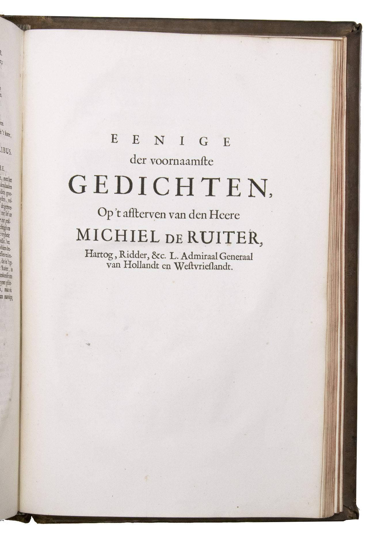 Amsterdam, for Wolfgang, Waesberge, Boom, van Someren and Goethals, 1687 (engraved title-page: printed by Pieter and Joan Blaeu, 1686). Folio (34.5 x 22.5 cm). With engraved title-page, engraved portrait of De Ruyter, 7 engraved double-page plates by Sebastiaen Stoopendaal and 1 engraved plate by Joseph Mulder. Late 18th-century calf, gold-tooled spine. [10], "1063" [=1065], [23] pp.