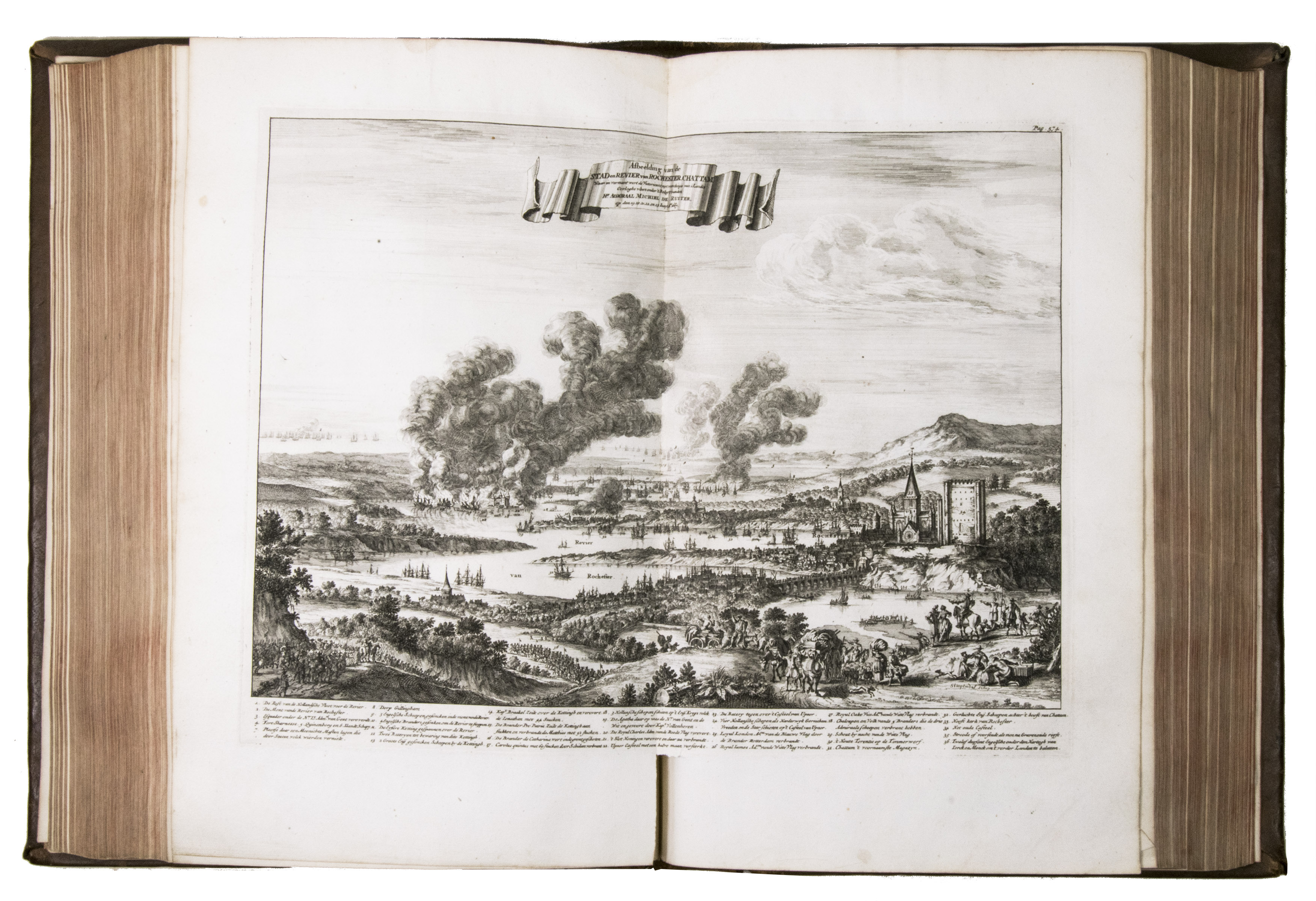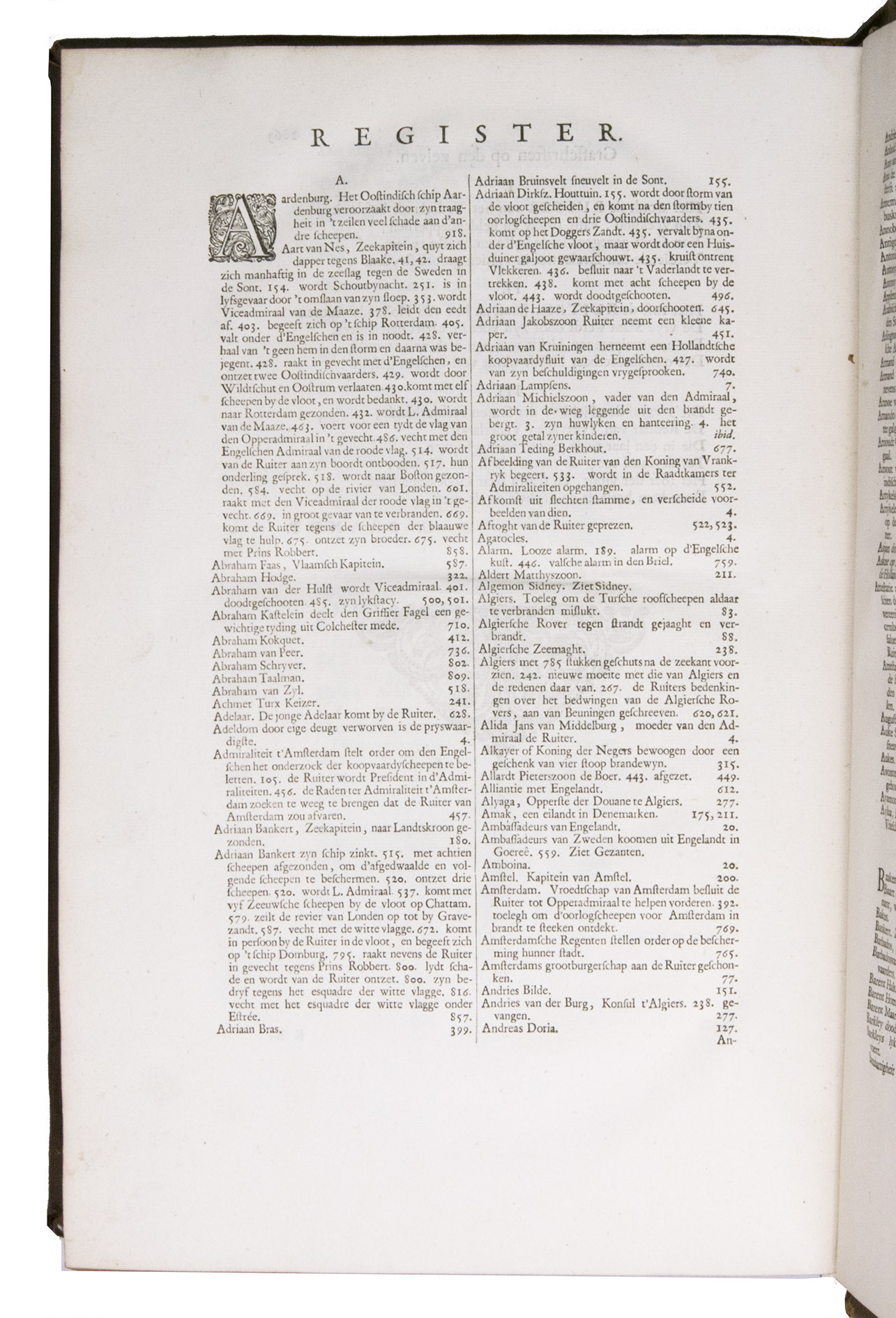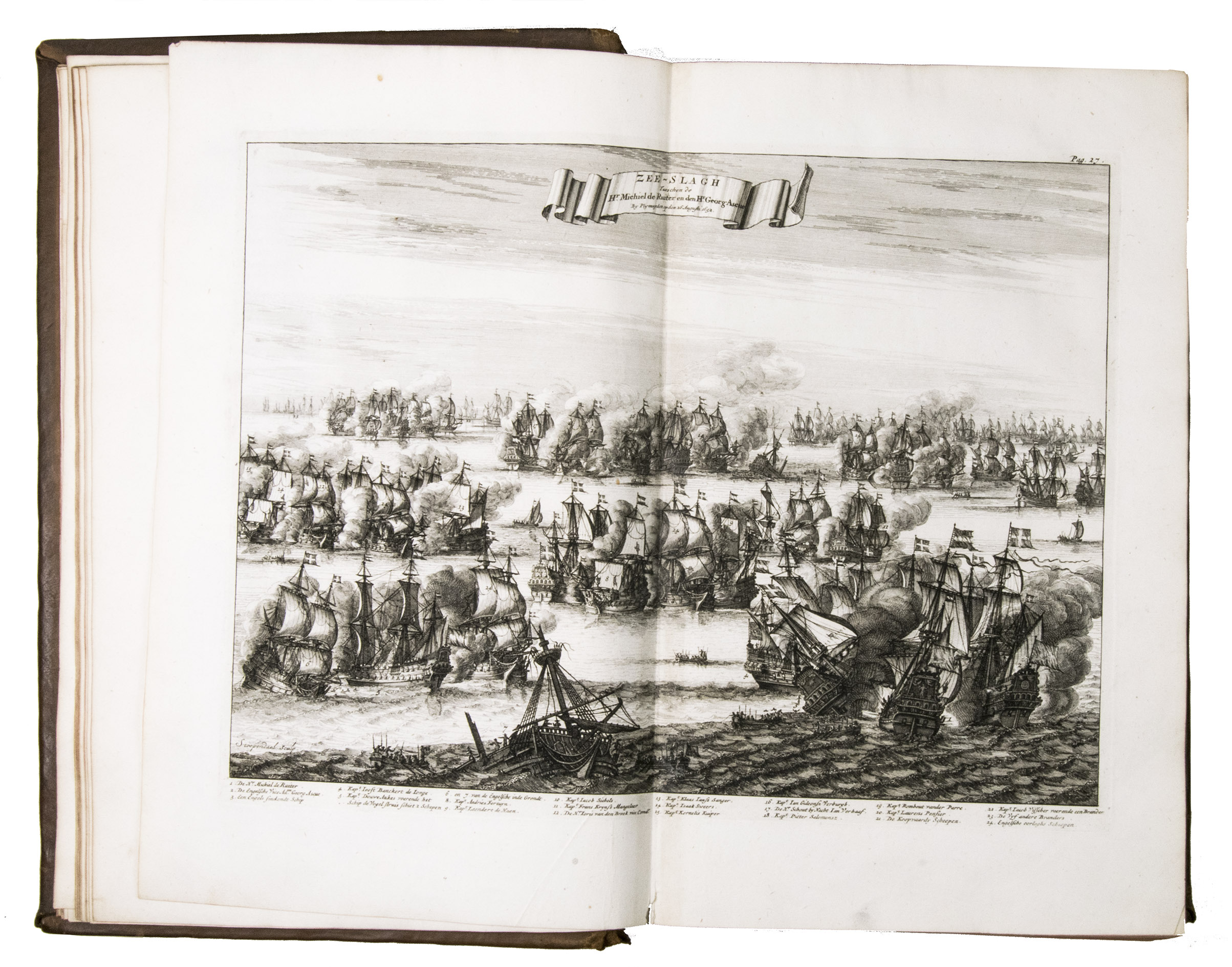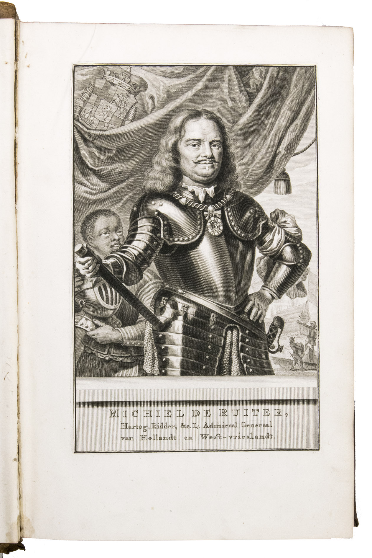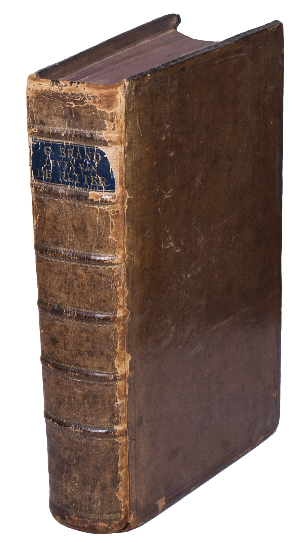 Large paper copy of the first edition, in the original Dutch, of the standard biography of the great Dutch naval hero Admiral Michiel Adriaansz. de Ruyter (1607-1676), who scored several major victories against the French and English, the best known abroad being the Raid on Chatham, one of the worst defeats of the British Royal Navy. For the present work Brandt used numerous original documents from De Ruyter's son and other private individuals, as well as from official government sources. "This resulted in a book that was not only based on good information, but through his exalted, lucid and engaging style also became a true folk-book in the best sense of the word" (NNBW).
