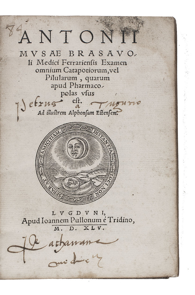 Rare second edition of an examination of all the pills that were commonly used in apothecaries, written by Brasavola and dedicated to Alphonso d'Este, then the son of the duke of Ferrara, Italy. The first edition was publsihed in 1543 in Basel. The Italian botanist and physicist Antonio Musa Brasavola (1500-1555), was an expert on the works of Galen and was heavily influenced by his work. Galen's work set the template voor Islamic medicine.