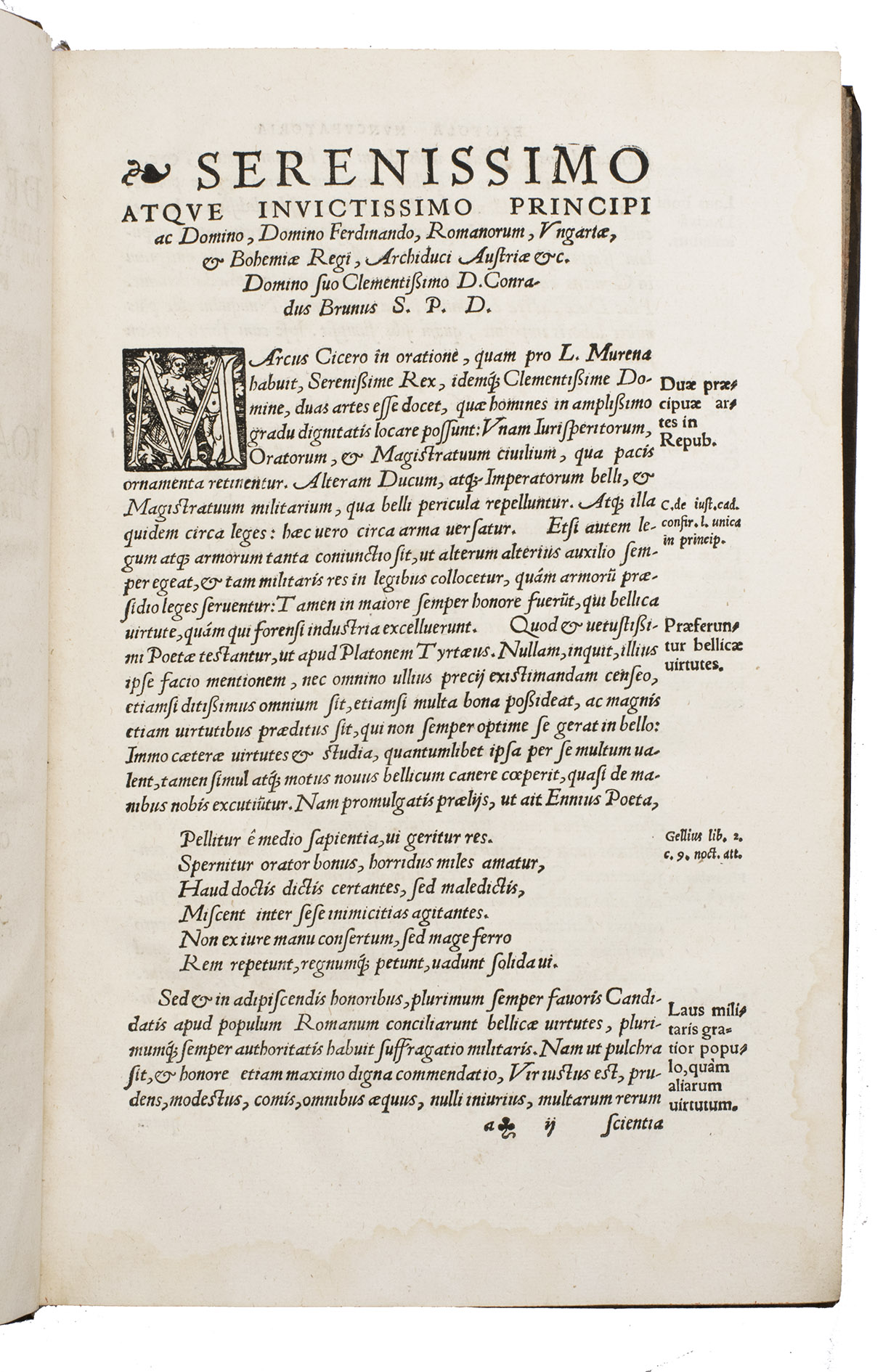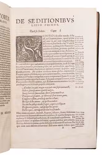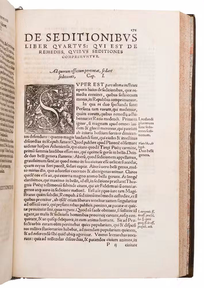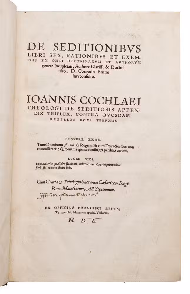 First edition of a significant work on rebellion and political order by the German jurist Konrad Braun (1491-1563). This substantial treatise examines the phenomenon of sedition and revolt in 6 books, addressing their nature, causes, consequences, remedies, punishment, and prevention. Braun, one of the leading Catholic jurists and political thinkers of the mid-16th century, approaches the subject from the perspective of both canon and civil law, drawing extensively on historical examples. The work is dedicated to Ferdinand I (1503-1564), Archduke of Austria, situating it firmly within the political and religious tensions of the Holy Roman Empire during the Reformation.