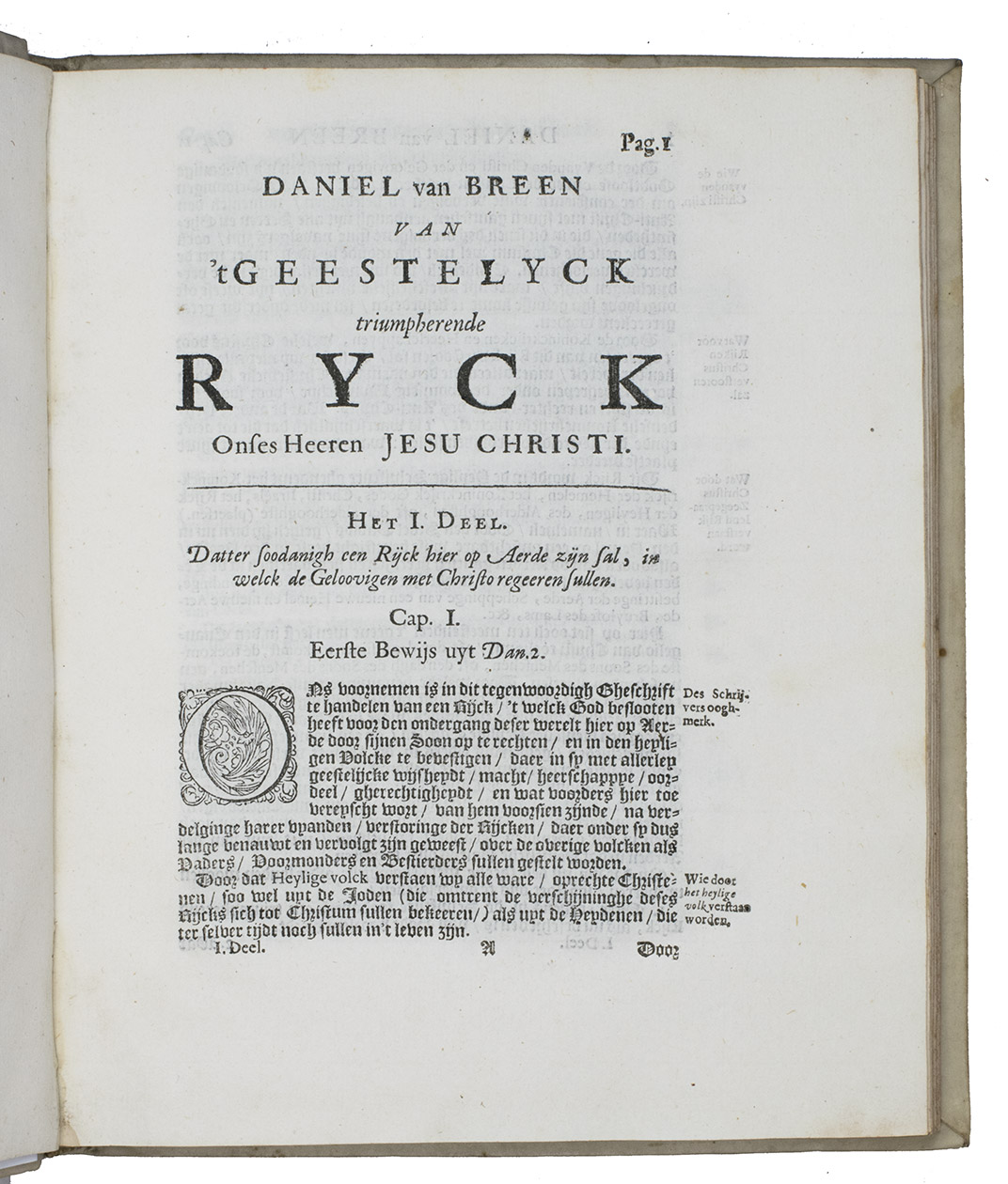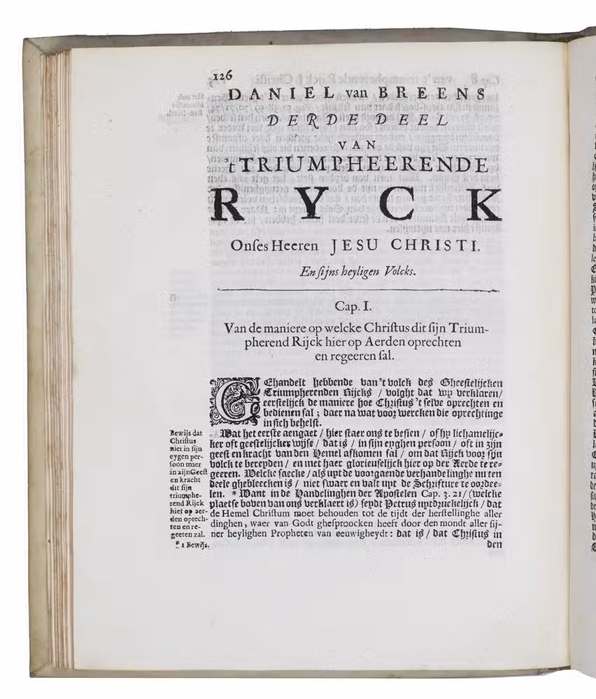 Second enlarged Dutch edition of a chiliastic work on the coming realm of Christ by Daniel van Breen (1594-1664), pupil of the Remonstrant leader Simon Episcopius and later one of the leading "Collegianten" (members of the College of the Prophets, founded in 1646) in Amsterdam. He first published the present work anonymously in 1653, in both a Latin edition under the title Tractatus de regno ecclesiae glorioso, per Christum in terris erigendo and in a Dutch edition.