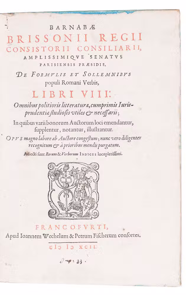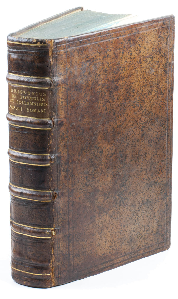 Second, revised and enlarged edition of a comprehensive compilation of Roman legal terminology, including remarks and data on the Latin language, Roman customs, religion politics and literature, by the French jurist and philologist Barnabé Brisson (1531-1591).Together with Contius, Balduinus, Cujacius, Hotmannus and Donellus, Brisson is among the group of 16th-century French jurists that brought Humanist jurisprudence to its peak. From the John Evelyn collection.