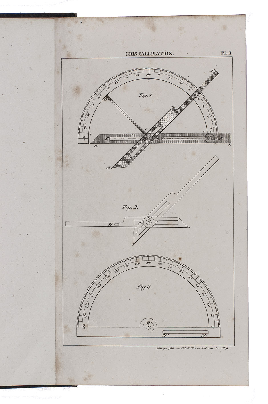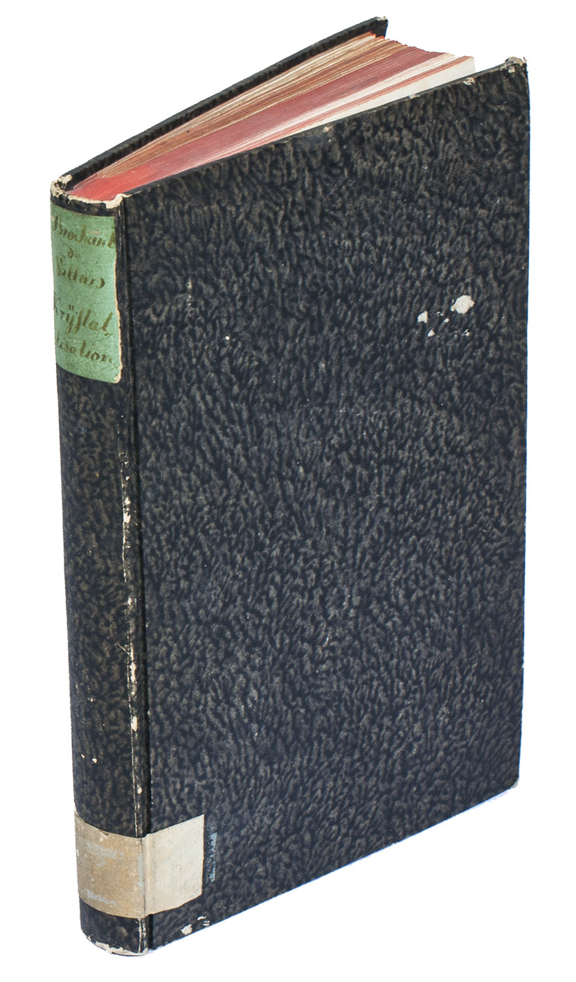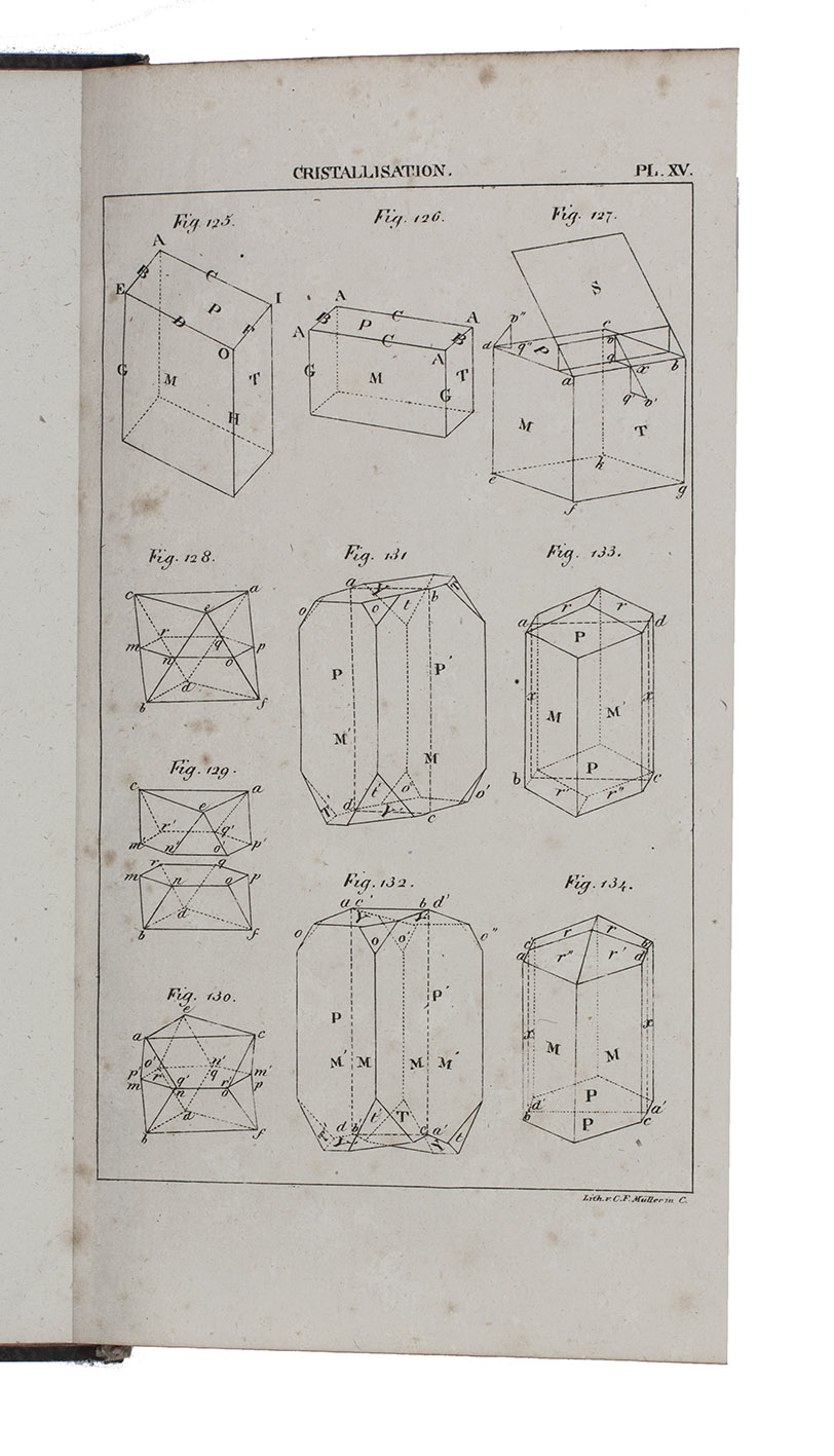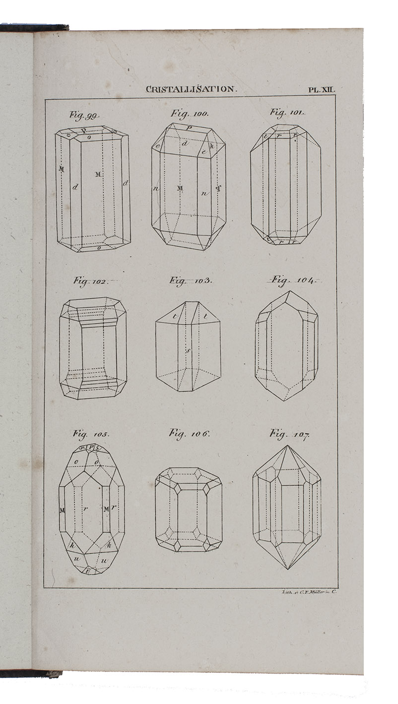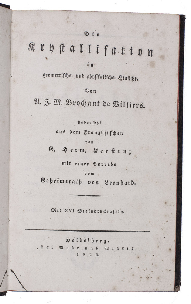 First edition of the German translation of a work on crystalization by the French mineralogist and geologist André-Jean-François-Marie Brochant de Villiers (1772-1840). It deals with the geometry of crystals, as well as their formation, different types and forms, how to measure them, how to alter forms, and much more. "Brochant warmly supported Haüy's theories of crystal structure, although his writings also aided in the diffusion in France of A.G. Werner's mineral classification and nomenclature, as well as the early crystallographic ideas of C.S. Weiss" (DSB). "It is written in such a manner as to provide the beginner with a textbook but useful information to the expert as well. The first part provides a geometriacl description of crystals based on Haüy's theories. In this Brochant has helped by the careful examination of the collection of the School of Mines. The second part theoretically describes the physical phenomenon of crystallization, which had occupies the author's studies for some time" (Schuh).