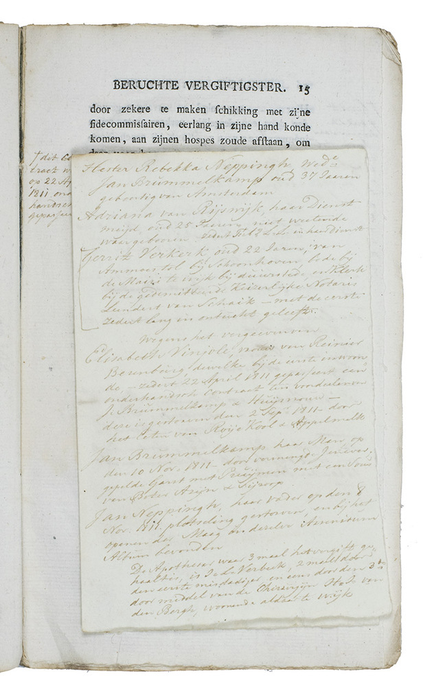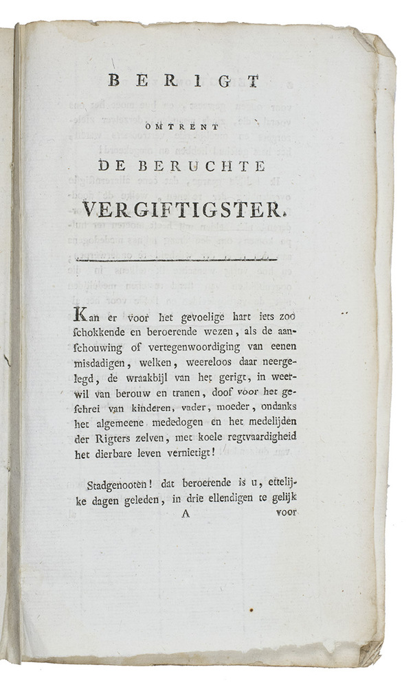 With contemporary owner's annotations and remnants of a bookplate. Binding worn at the sides. Second half of the book with a large water stain. A good, unique copy. Buijnsters, Levens van beruchte personen, p. 43; Meddens-van Borselen, 'Het leven van de gifmengster Hester Rebecca Nepping (1774-1812)', Oud-Utrecht. LXXI (1998), pp. 124-129.