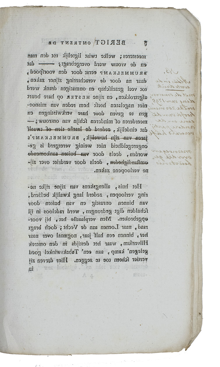 This copy of the Berigt contains several neat contemporary annotations, striking through several lines and giving improvements in the margin. It is quite possible that this copy was owned by Broers and contains his improvements for a possible second edition.