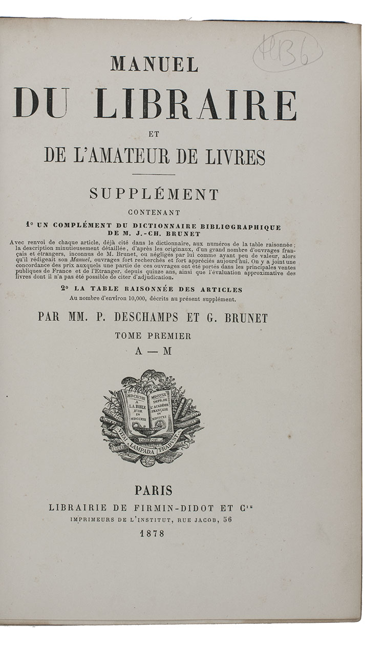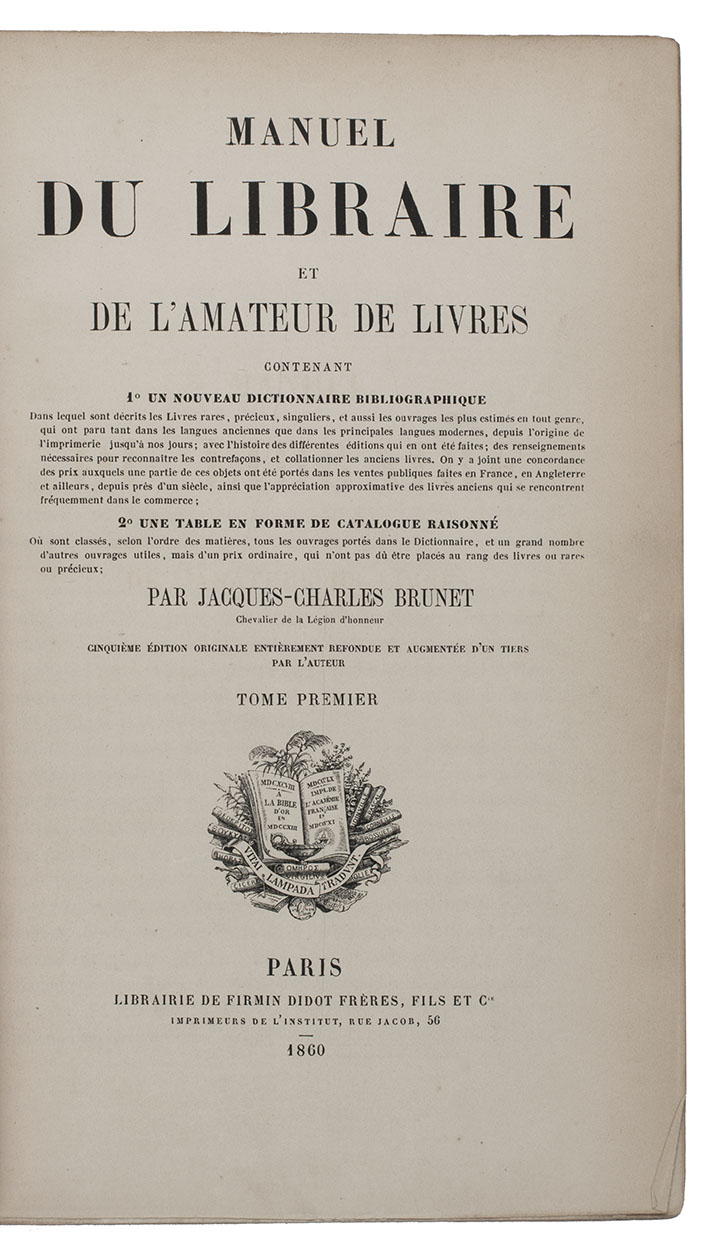 Last and best edition of this legendary work. Although obsolete from a bibliographical point of view, and not always accurate, it is still useful for its collations, learned annotations and the many very rare items described. From a sentimental point of view, this is a desirable item for every bookcollector and antiquarian bookseller.