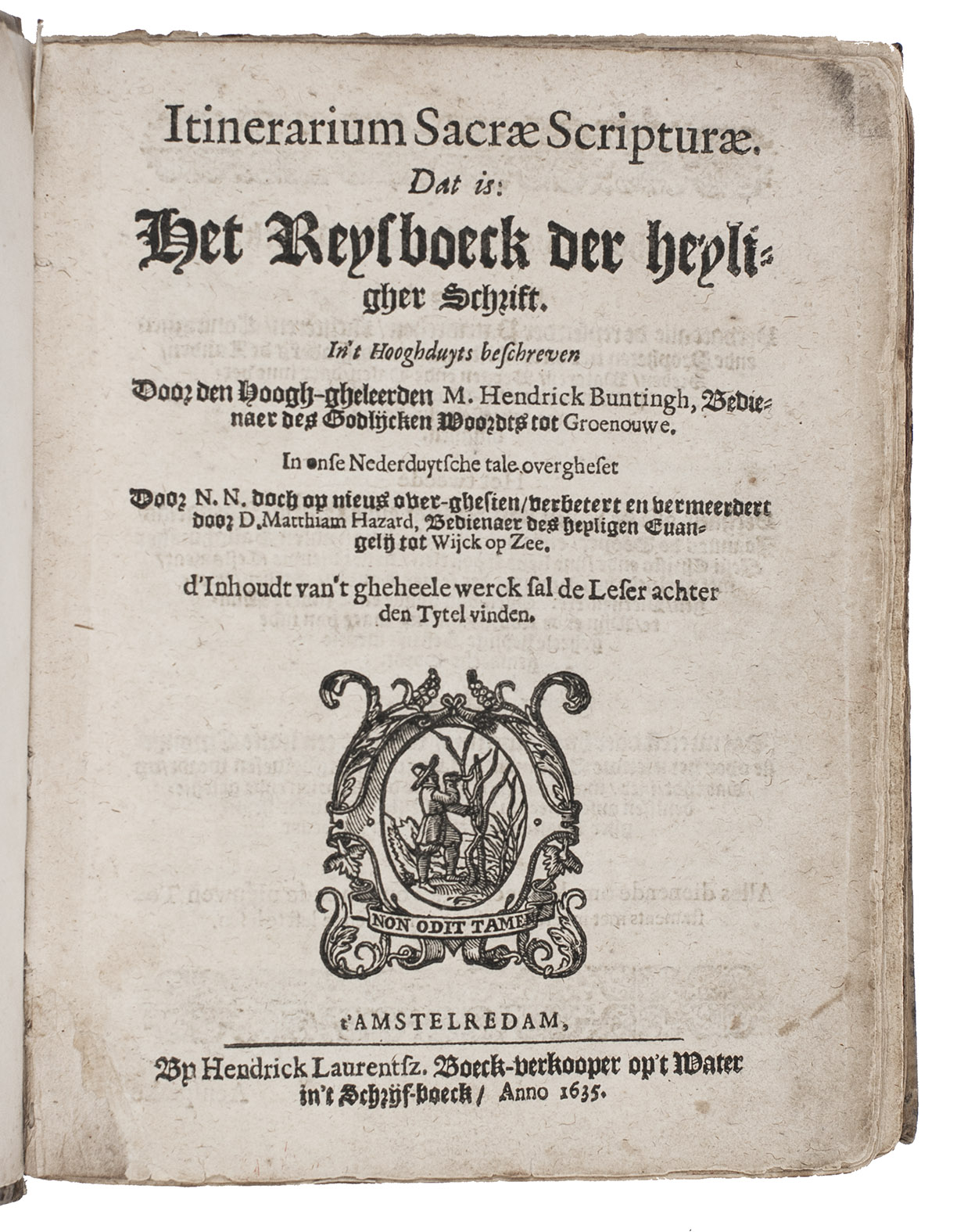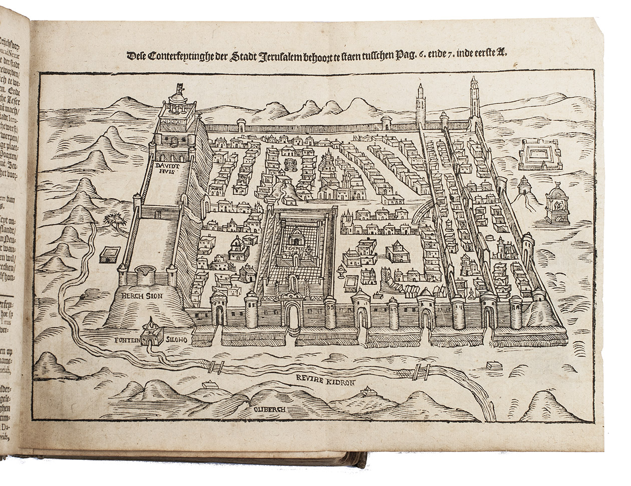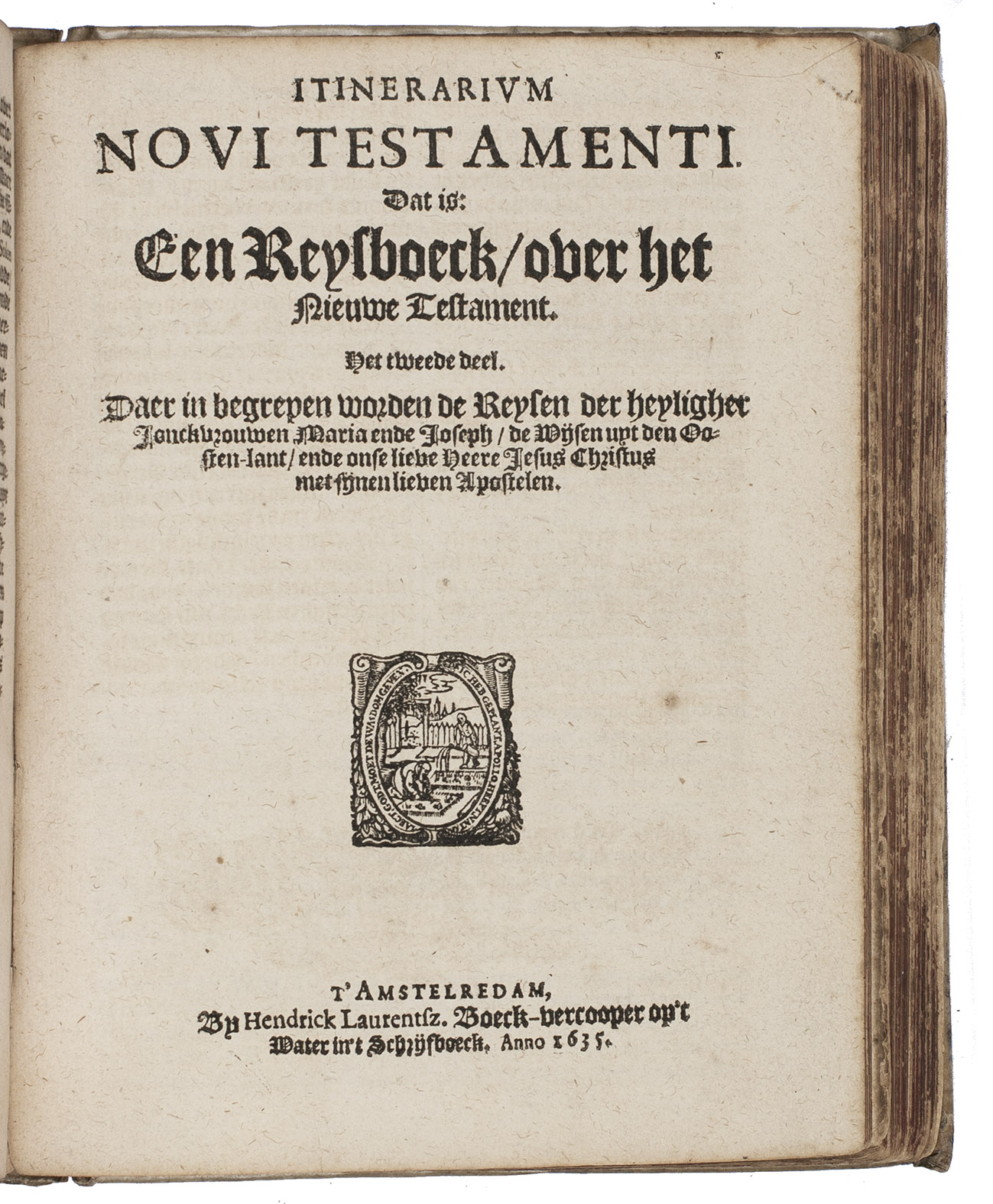 Rare eighth(?) edition of the Dutch translation of a work on Biblical travels, written by the German Protestant pastor and theologian Heinrich Bünting (1545-1606), first published in German in 1581 and translated by Matthias Hasaert (1578?-1663). The work proved extremely popular and appeared in almost 80 editions up to the 18th century. "However much a work of the study, this book could be easily taken and read as a travel book. Bünting, although he had never actually visited Palestine, produced an original work by recasting Sacred Scripture into a Reissbuch" (Noonan). The work is divided into four parts. The first deals with the travels from the Old Testament, starting with a description and a woodcut plan of Jerusalem. Two other woodcut folding plates show the Temple of Solomon and the route the Jews took from Egypt to the Holy Land. The second part explains the Biblical currencies and units of measurement. The third part resembles the first, but deals with the journeys from the New Testament. The work closes with a short theological treatise on the four Evangelists.