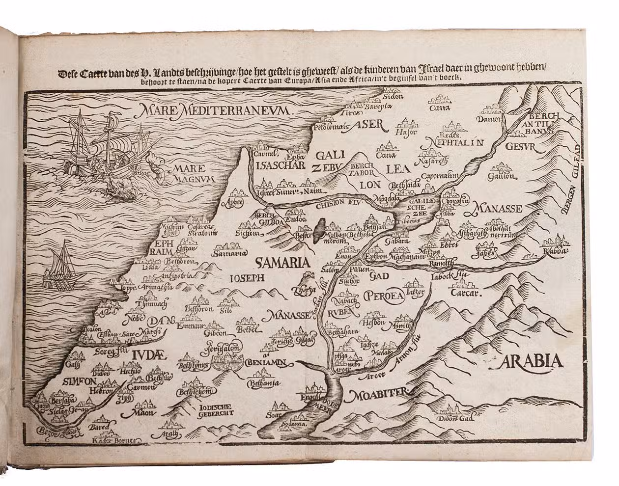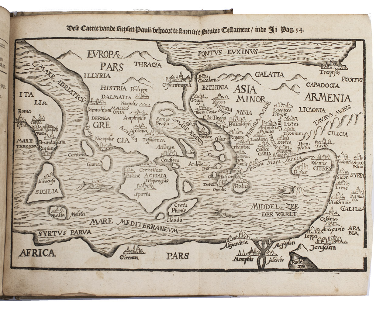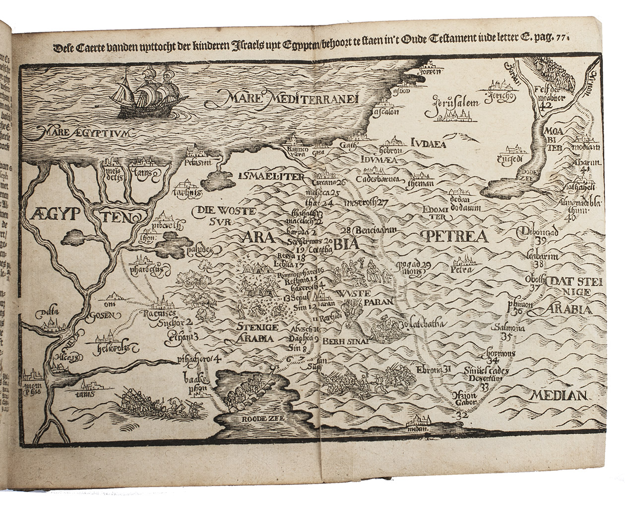 Rare eighth(?) edition of the Dutch translation of a work on Biblical travels, written by the German Protestant pastor and theologian Heinrich Bünting (1545-1606), first published in German in 1581 and translated by Matthias Hasaert (1578?-1663). The work proved extremely popular and appeared in almost 80 editions up to the 18th century. "However much a work of the study, this book could be easily taken and read as a travel book. Bünting, although he had never actually visited Palestine, produced an original work by recasting Sacred Scripture into a Reissbuch" (Noonan). The work is divided into four parts. The first deals with the travels from the Old Testament, starting with a description and a woodcut plan of Jerusalem. Two other woodcut folding plates show the Temple of Solomon and the route the Jews took from Egypt to the Holy Land. The second part explains the Biblical currencies and units of measurement. The third part resembles the first, but deals with the journeys from the New Testament. The work closes with a short theological treatise on the four Evangelists.