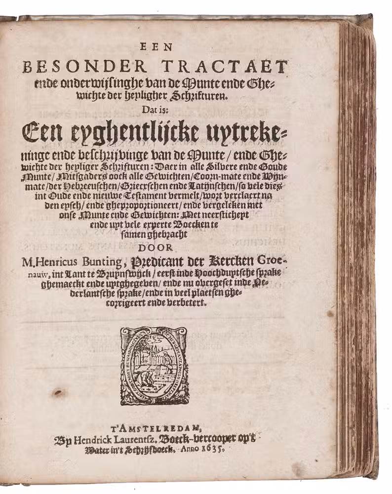 Including: BÜNTING, Heinrich. Een besonder tractaet ende onderwijsinghe van de munte ende ghewichtre der Heyligher Schrifturen... [BÜNTING, Heinrich]. Itinerarium Novi Testamenti. Dat is: een reysboeck, over het Nieuwe Testament. Het tweede deel...BÜNTING, Heinrich. Harmonia evangelistarum, dat is: eene seer schoone ende eendrachtige over-een-stemminge der heyliger vier evangelisten...Amsterdam, Hendrik Laurentsz., 1635. 4 parts in 1 volume. 4to. With 5 woodcut and 2 engraved folding maps. Contemporary vellum, modern endpapers. [16], 355, [9]; [2], 36; [4], 163, [3]; 24 pp.