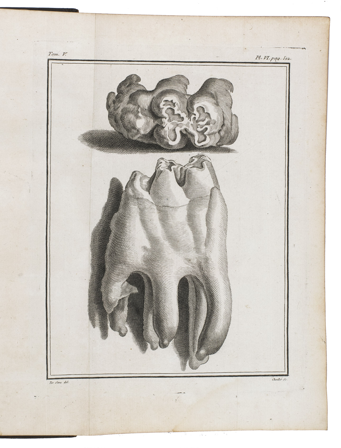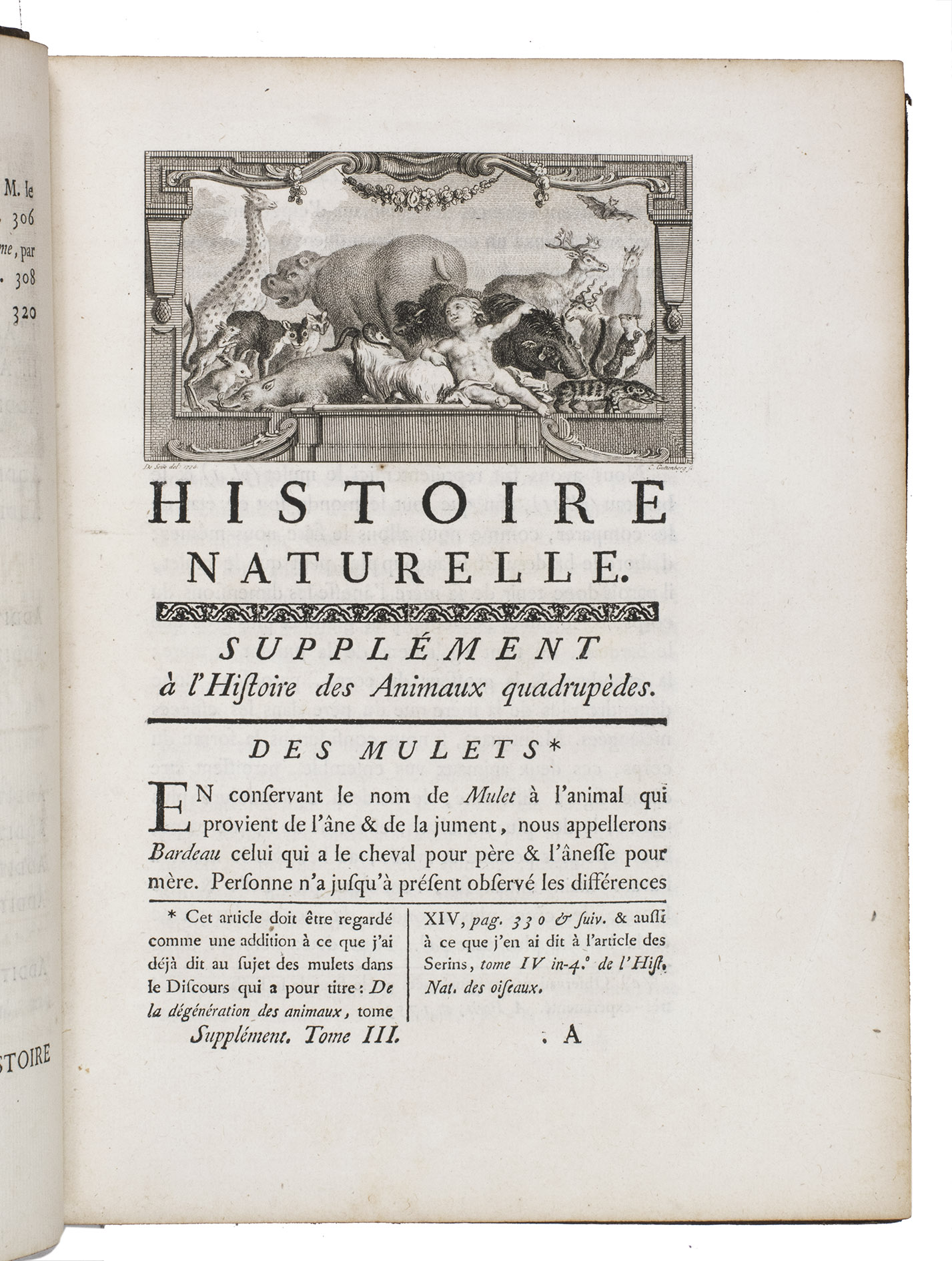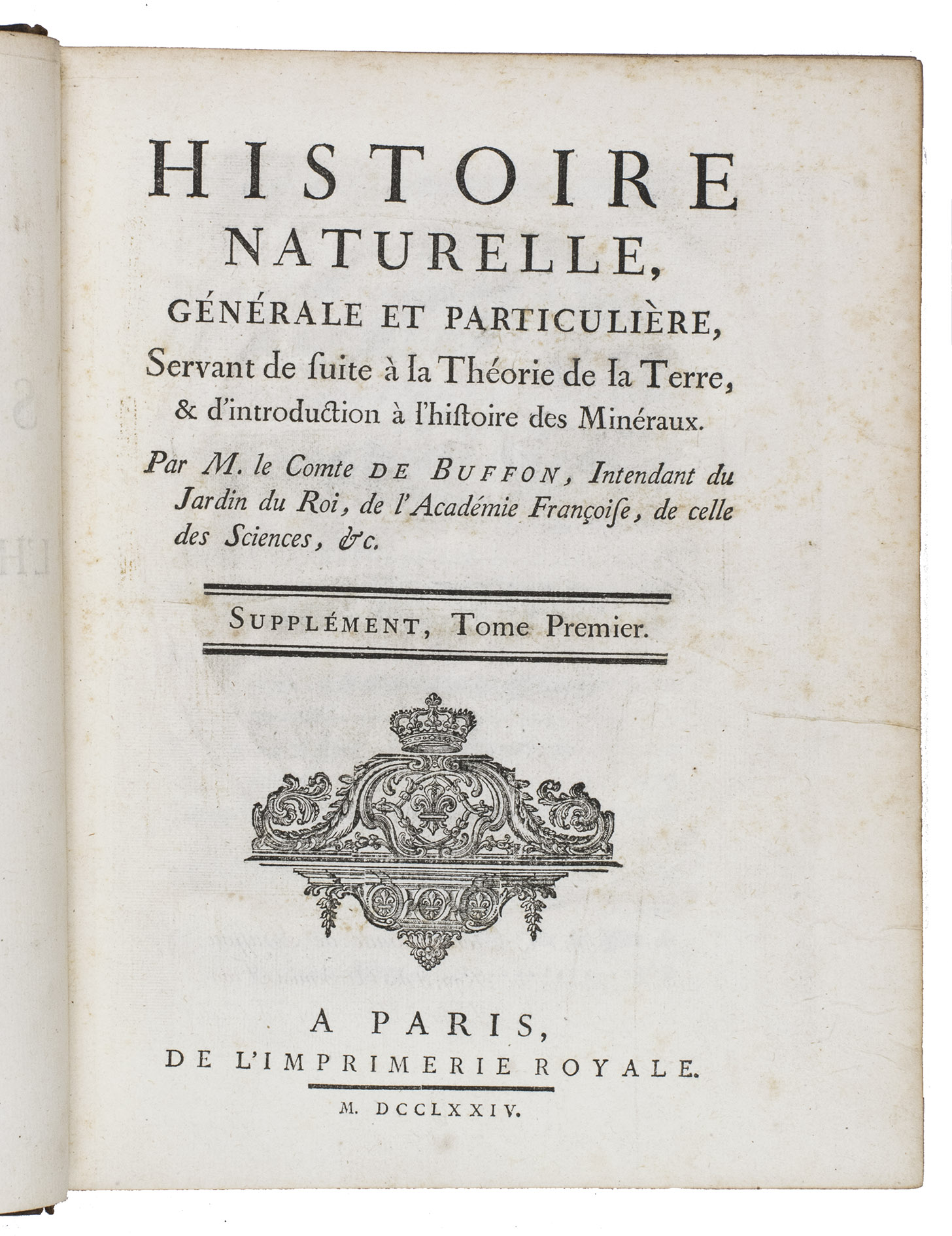 Supplements I, II and V contain additions and corrections to Buffon's essay "Théorie de la terre" in which he,'' He extrapolated the results of his experiments, . . . , in order to calculate the time required for the cooling of the earth and other planets'' (DSB). Additionally, he provides introductions to the history of mineral resources and vegetation in the first and second supplement volumes respectively . The Époques de la nature (Supplément V), presents a plutonian history of the earth. "This work is of considerable interest because it offers a history of nature, combining geology with biology, and particularly because of Buffon's attempt to establish a universal chronology'' (DSB). It also contains a great deal of mineralogical material he elaborated on in his Histoire naturelle des mineraux. Other volumes contain additions to the quadrupeds and human species section