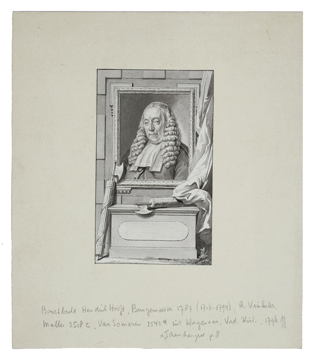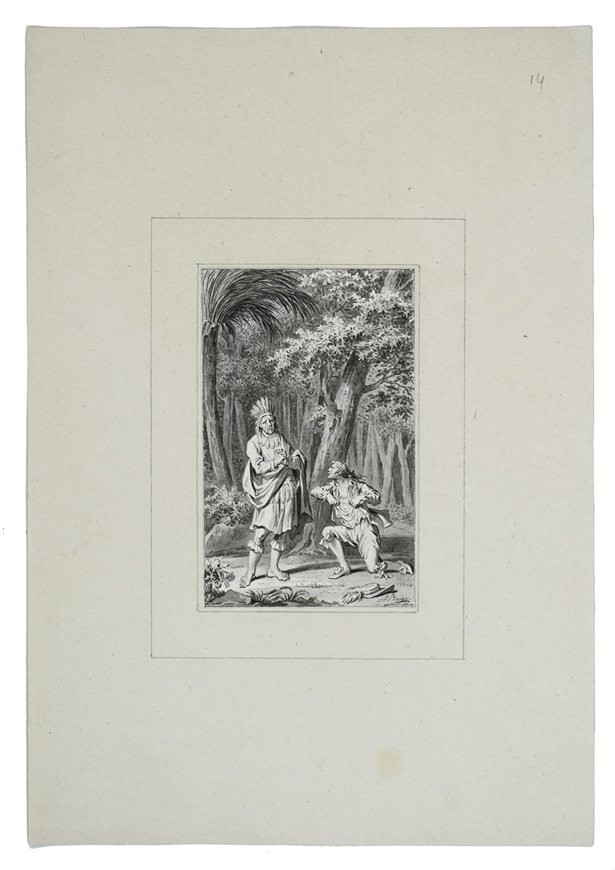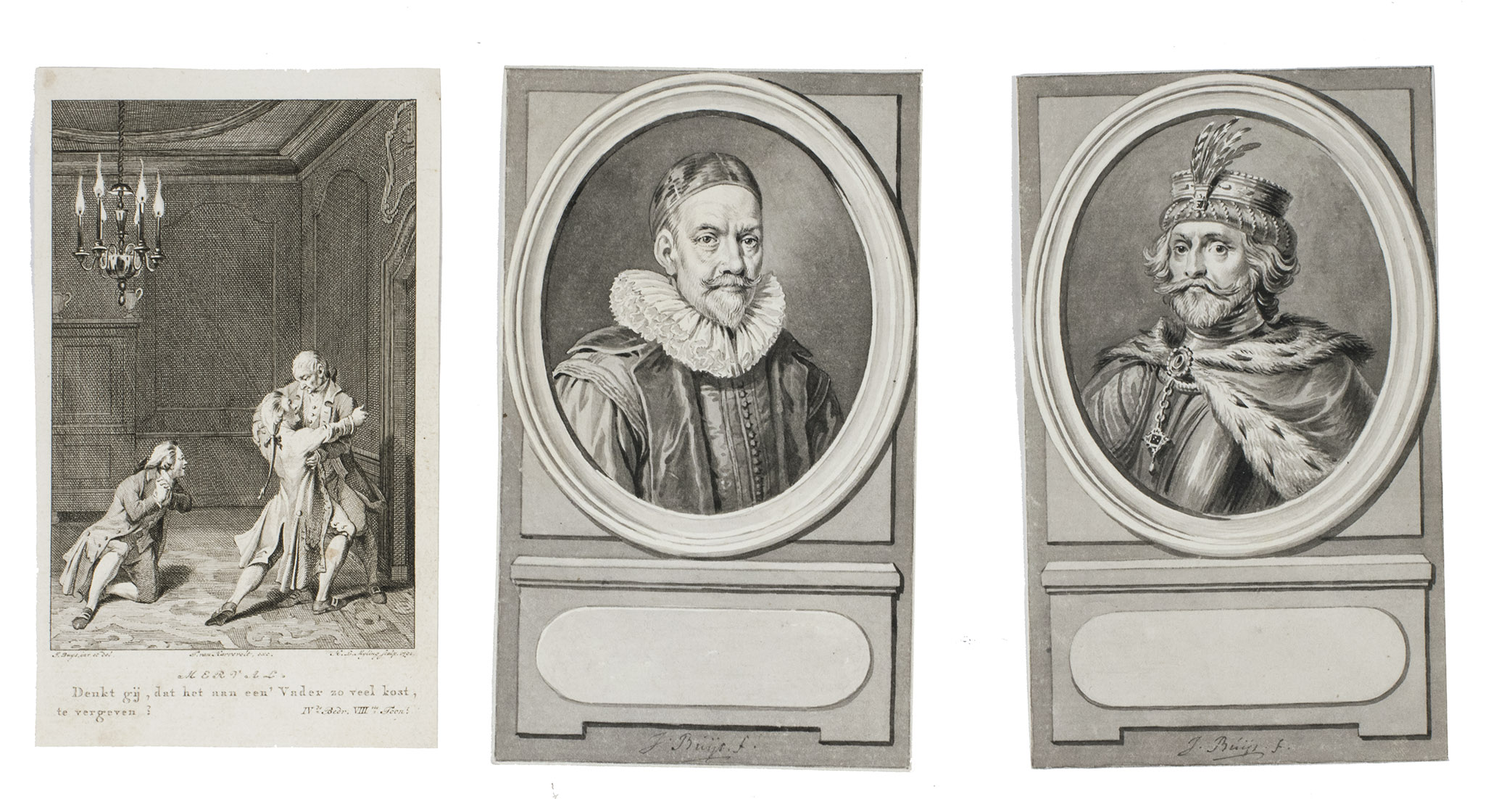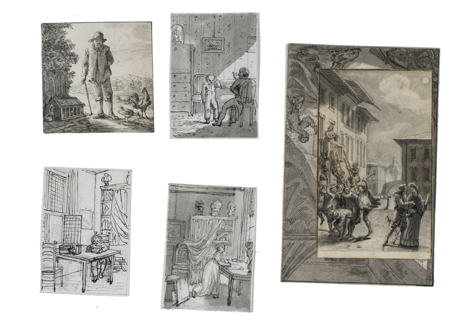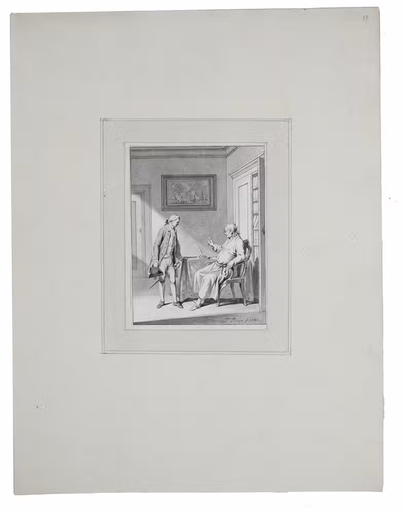 Unique collection of delicate washed pen and ink drawings by Jacobus Buijs (or Buys), one of the most important artists of the new generation of Dutch book illustrators of the second half of the 18th century. The drawings served as designs for illustrations in many works, including Jacobus Kok's encyclopaedic Vaderlandsch woordenboek, 35 vols. (Amsterdam, J. Kok & J. Allart, 1780-1796), and the play by L.S. Mercier, De valsche vriend, of de zegepraal der huwelijksliefde, translated from the French Le faux ami, apparently published as volume 2 in the three-volume series Het zedelyk tooneel (Amsterdam, A. Kroese, 1778-1779), though not described as such in the book itself. E. de la Fontaine Verwey, Illustr. letterk. werken XVIIIe eeuw, pp. 83 ff.; L. Buijnsters-Smets, "Jacobus Buijs als boekillustrator", in: Documentatieblad werkgroep achttiende eeuw, 16 (1984), pp. 91-106; Van Someren, Catalogus van portretten 2542; Muller, Portretten 1219 & 2518c; on the artist, see also Scheen I, p. 193; Waller, Biogr. woordenboek, p. 55; Wurzbach I, 1 p. 226.