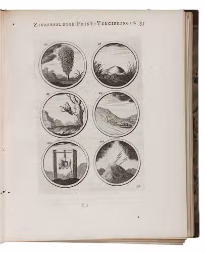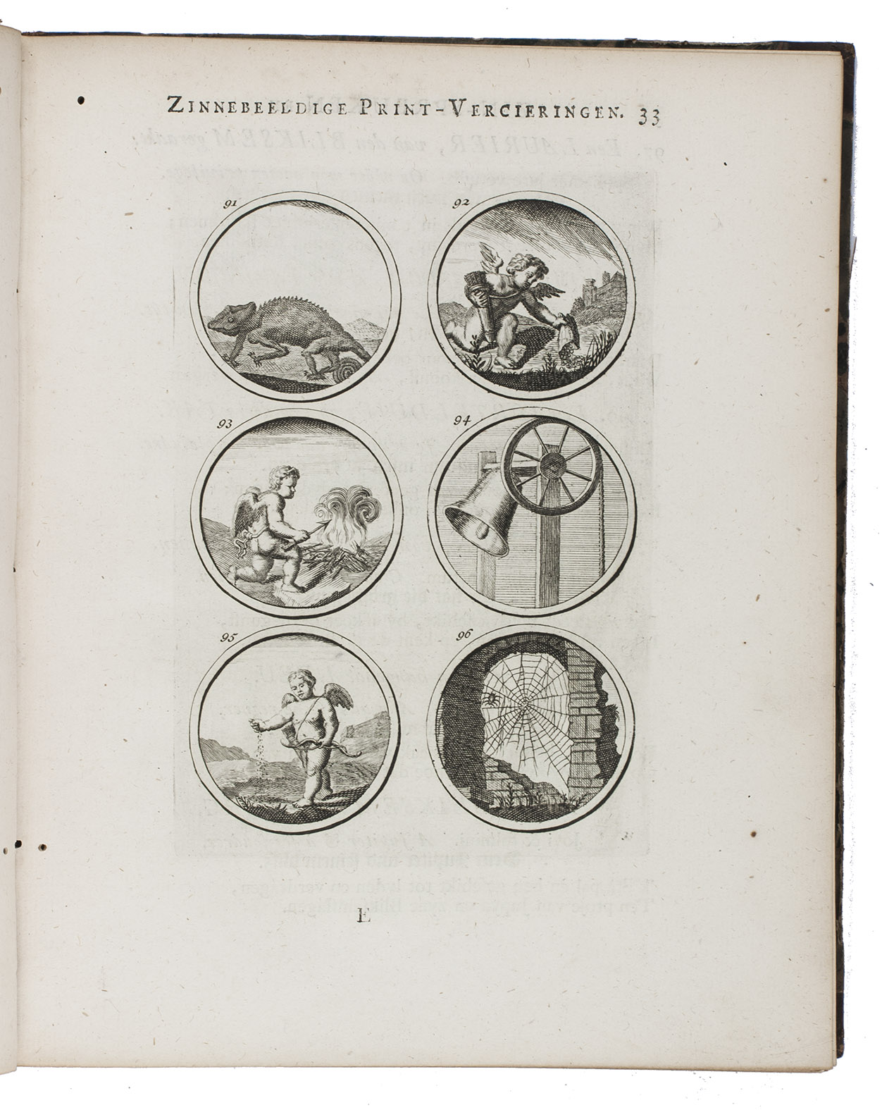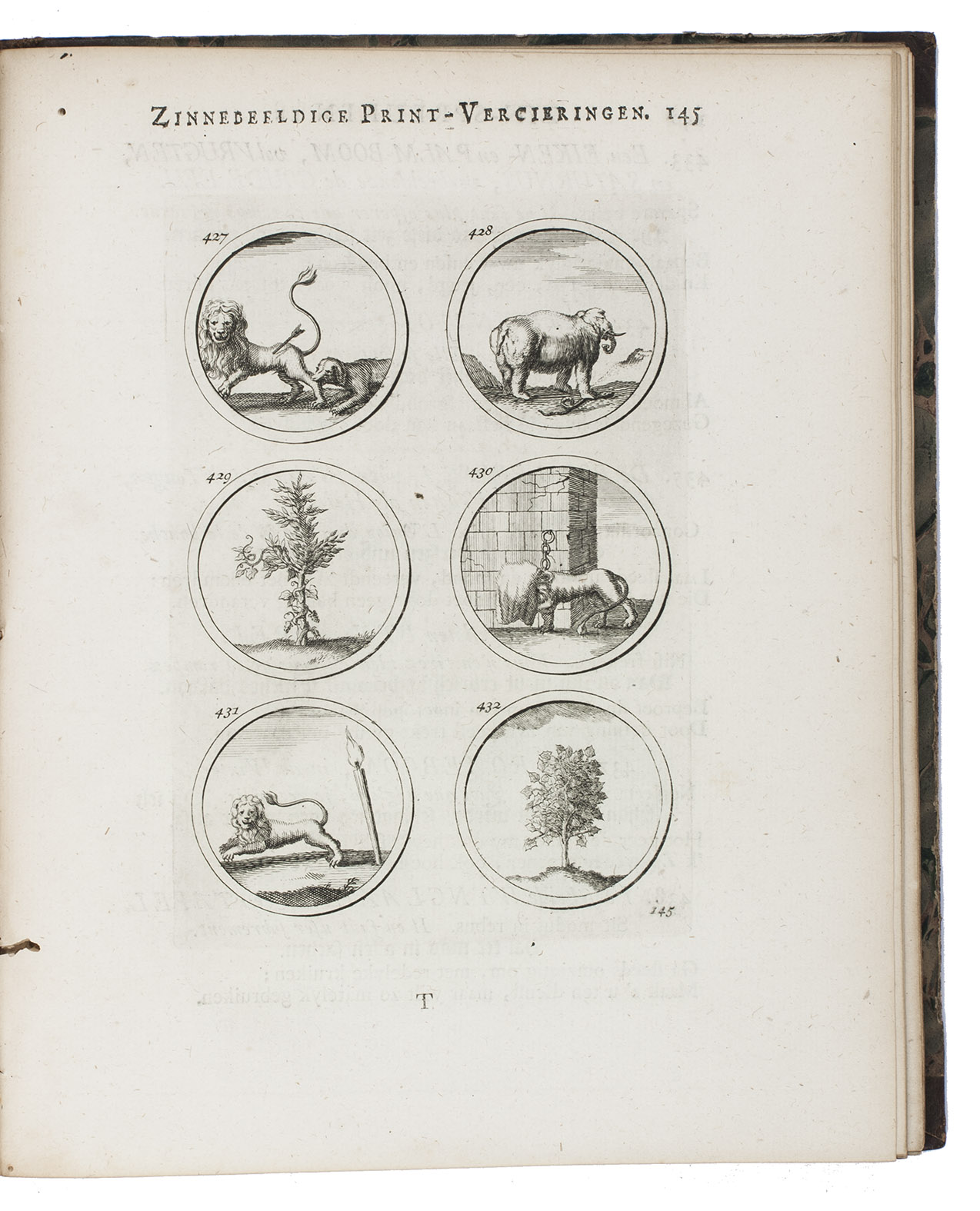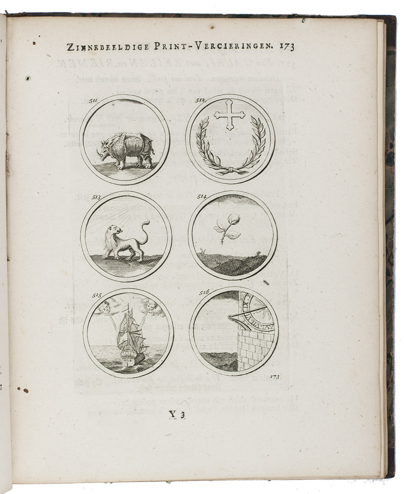 Haarlem, Johannes Marshoorn, 1743. 4to. With engraved frontispiece by J. Mulder and 840 numbered circular emblems on 140 full-page engravings in text, the facing pages to the left with captions in Dutch, short proverbial phrases in Latin, French and German, and two-line verses in Dutch by Van den Burg. 19th-century half sheepskin, gold-tooled spine. [8], 281, [1 blank], [10] pp.