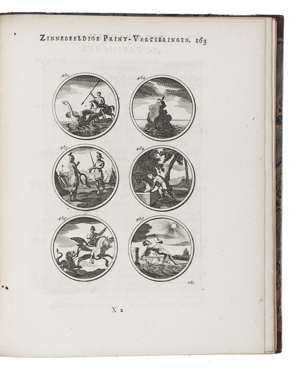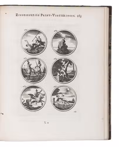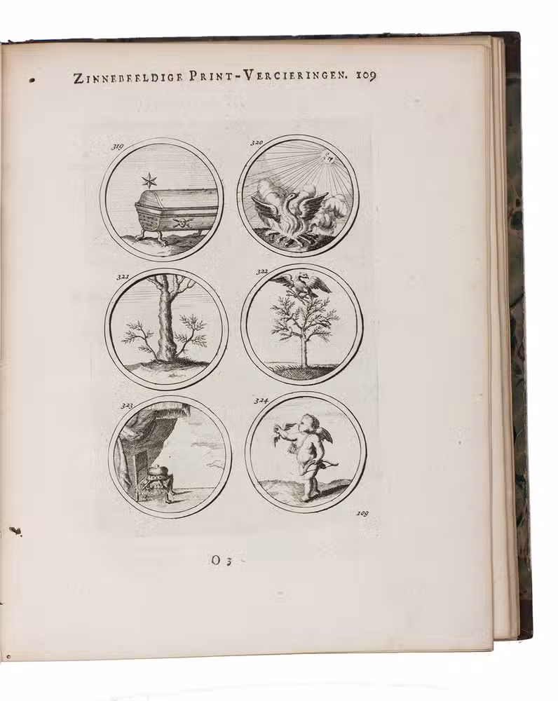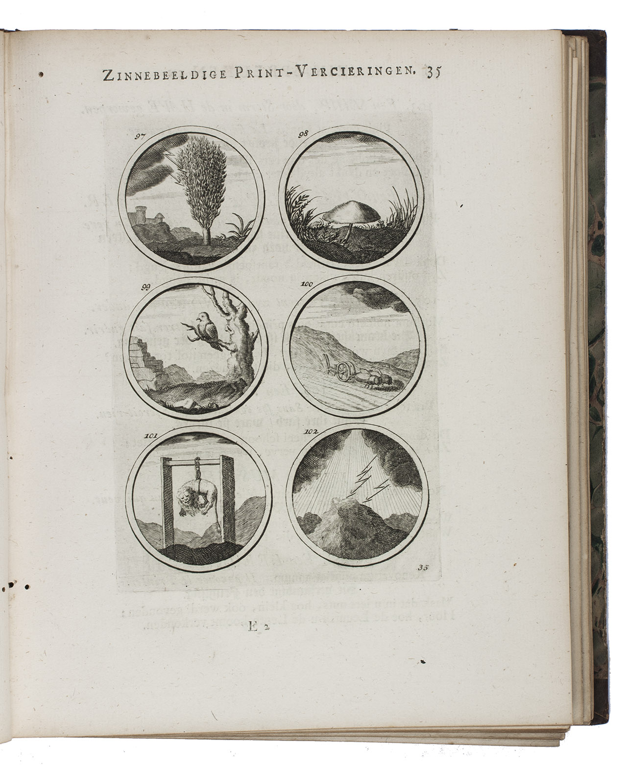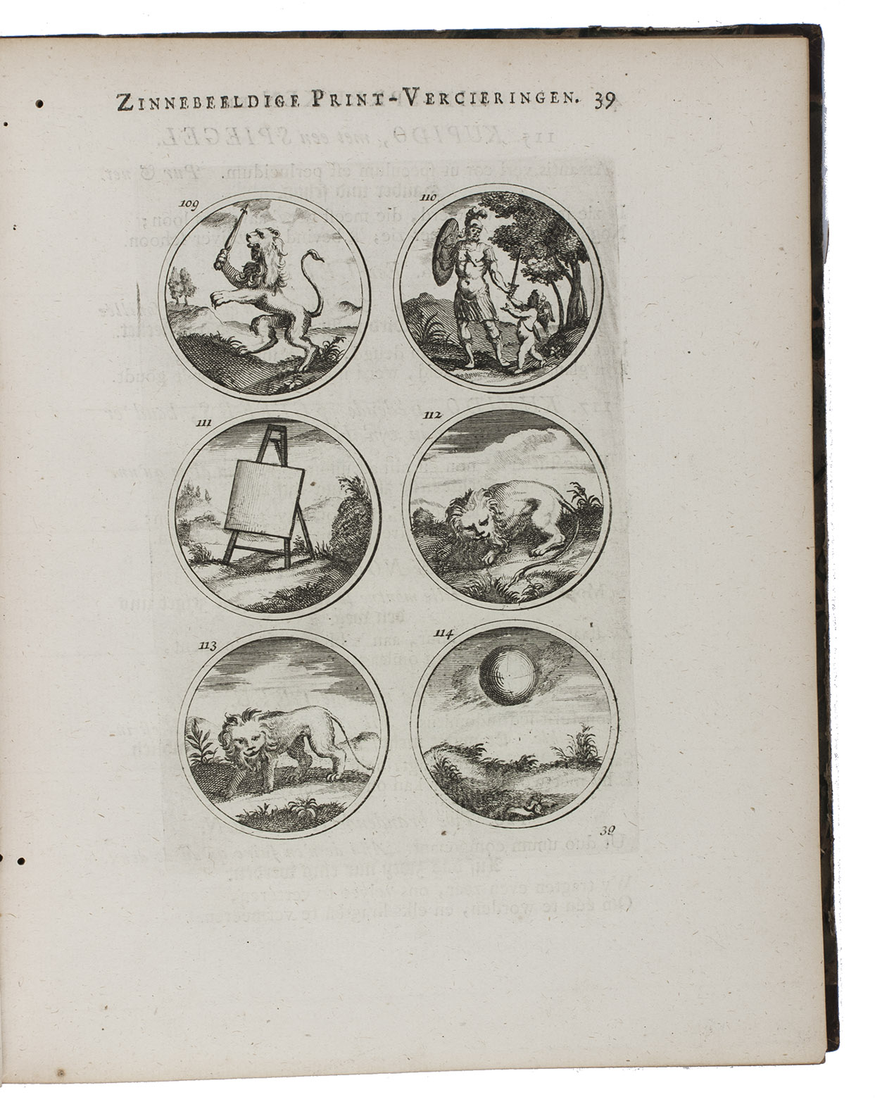 Haarlem, Johannes Marshoorn, 1743. 4to. With engraved frontispiece by J. Mulder and 840 numbered circular emblems on 140 full-page engravings in text, the facing pages to the left with captions in Dutch, short proverbial phrases in Latin, French and German, and two-line verses in Dutch by Van den Burg. 19th-century half sheepskin, gold-tooled spine. [8], 281, [1 blank], [10] pp.