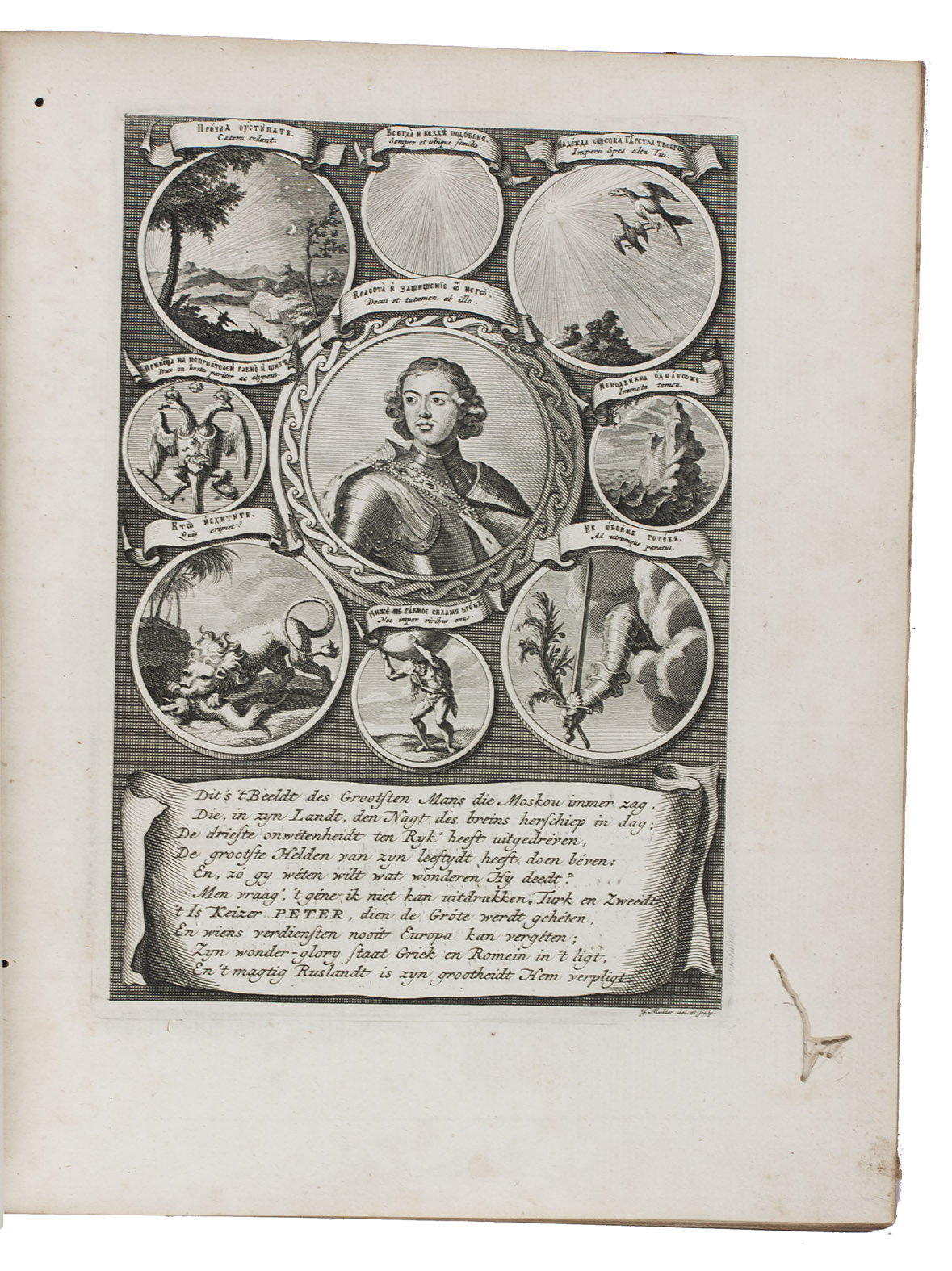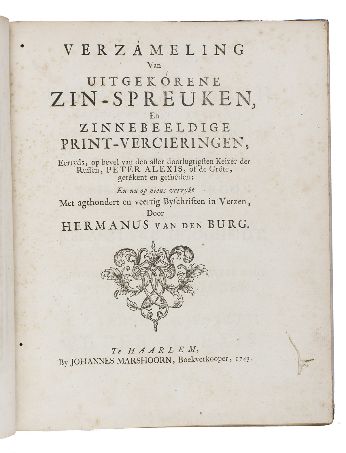 First and only edition of Van den Burg's revised edition of the first Russian emblem book. The original emblem book was published in the Netherlands in 1705 as Symbola et Emblemata, with captions in Russian, German, Dutch, etc. It was published as part of a deal by Tsar Peter the Great granting the Dutch merchant Jan Tesing the right to print books in Holland for sale in Russia. The first genuinely Russian edition was published in 1788. This edition by the Dutch poet Hermanus van den Burg (1682-1752), uses the original plates and replaces most of the captions, including the Russian, by new two-line verses in Dutch.
