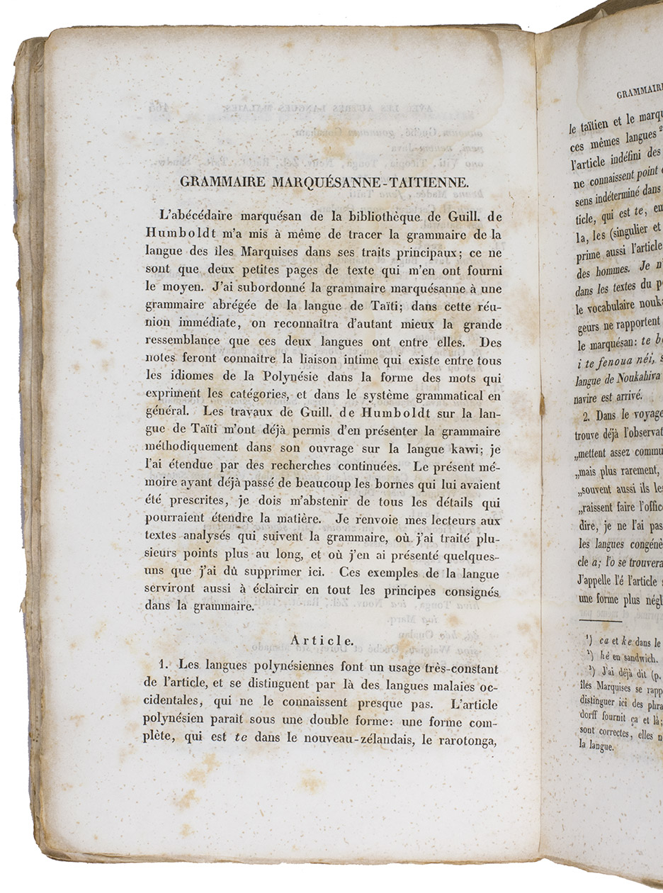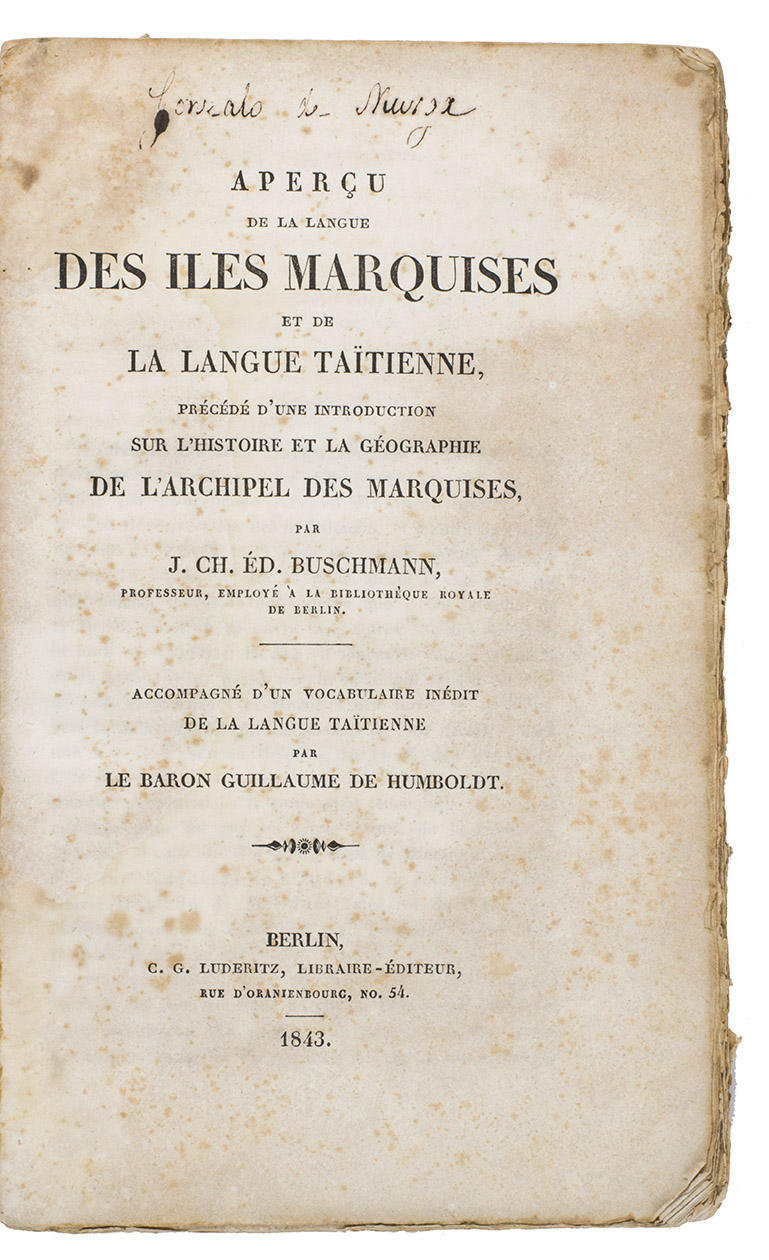 Johann Carl Eduard Buschmann (1805-1880) was a German philologist, who resided in Mexico for a few years to study the indigenous languages of Middle America and was later employed at the Alte Bibliothek in Berlin, where he focused his research on the dialects of Malaysia, Indonesia and Polynesia. His Aperçu includes a short history of the earliest voyages to the Marquesas islands and a comparison of different Polynesian dialects. The second half includes a more detailed look at the Marquesan language.