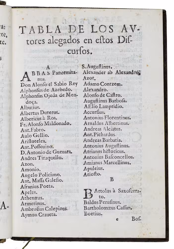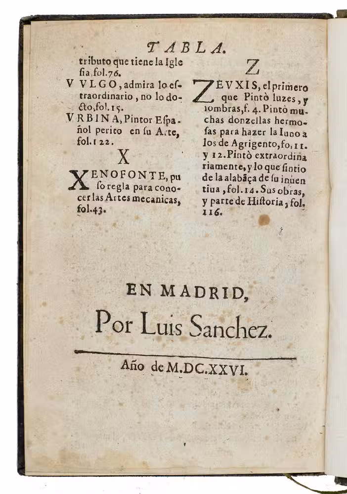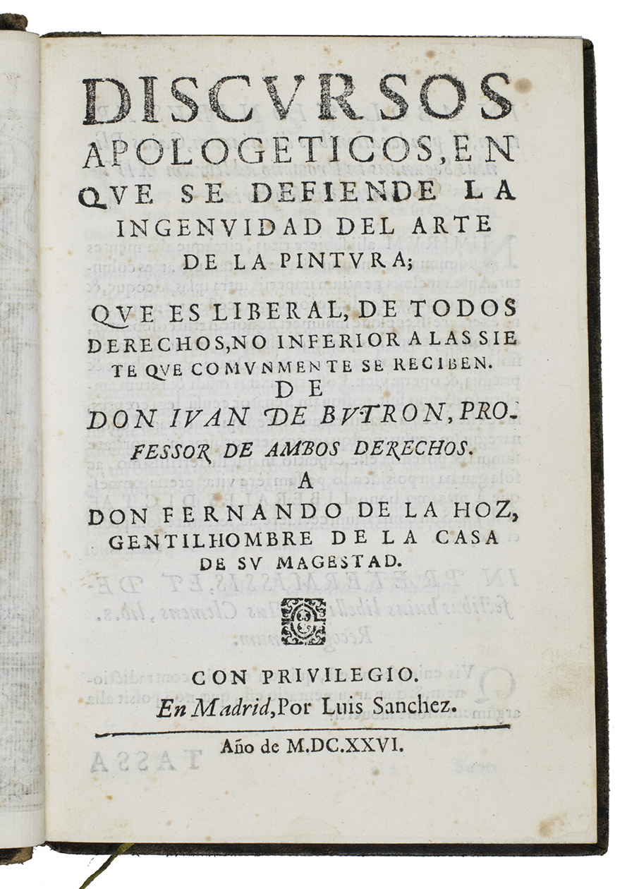 First edition, in the original Spanish, of an important treatise on the value and quality of the art of painting, containing many interesting observations and remarks on the fine arts and its relation to other liberal arts, such as dialectics, rhetoric and arithmetic, presented in 14 discourses. Juan Alonso de Butron, a jurist born in Najera dedicated his work to his mentor Don Fernando de la Hoz, "Gentilhombre de la Casa de su Magestad", dated 1 October 1626. After the dedication, prologue, a laudatory poem by Joseph de Valdivielso, a list of the authors mentioned, a summary of the discourses and other preliminaries, the main text occupies 123 pages followed by an index of 36 pp. The beautiful frontispiece was engraved by Jan Schorkens (1595-1630?), a Dutch engraver who travelled to Madrid around 1618 to work mainly for the printers and publishers there and remained apparently to his death.