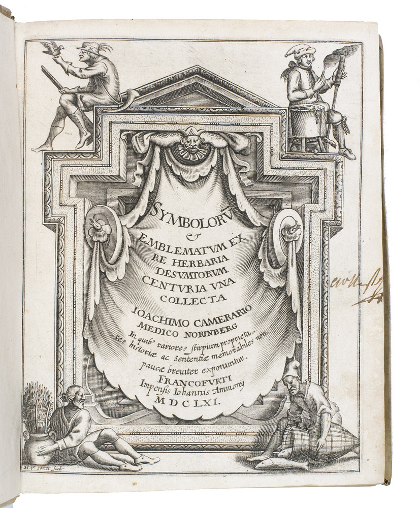 Complete collection of Camerarius' beautiful emblem book, containing 400 emblems. The present copy appears to contain a re-issue of the second complete edition (published in 1654) and here with the altered date (1661) on the title pages. Nevertheless, the present complete Symbolorum & emblematum collection is made up of the 4 volumes in 3 different editions: the first two in the 1661 re-issue, volume 3 of the 1654 second complete edition, and volume 4 in a practically unknown edition dated 1664, published by Bourgeat in Heidelberg.