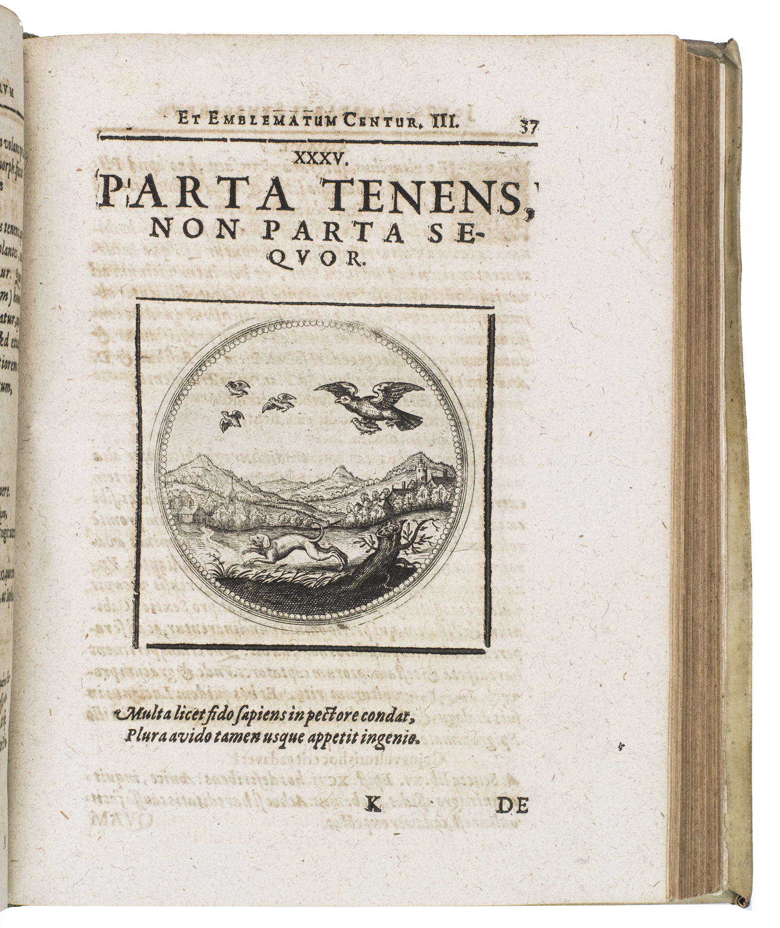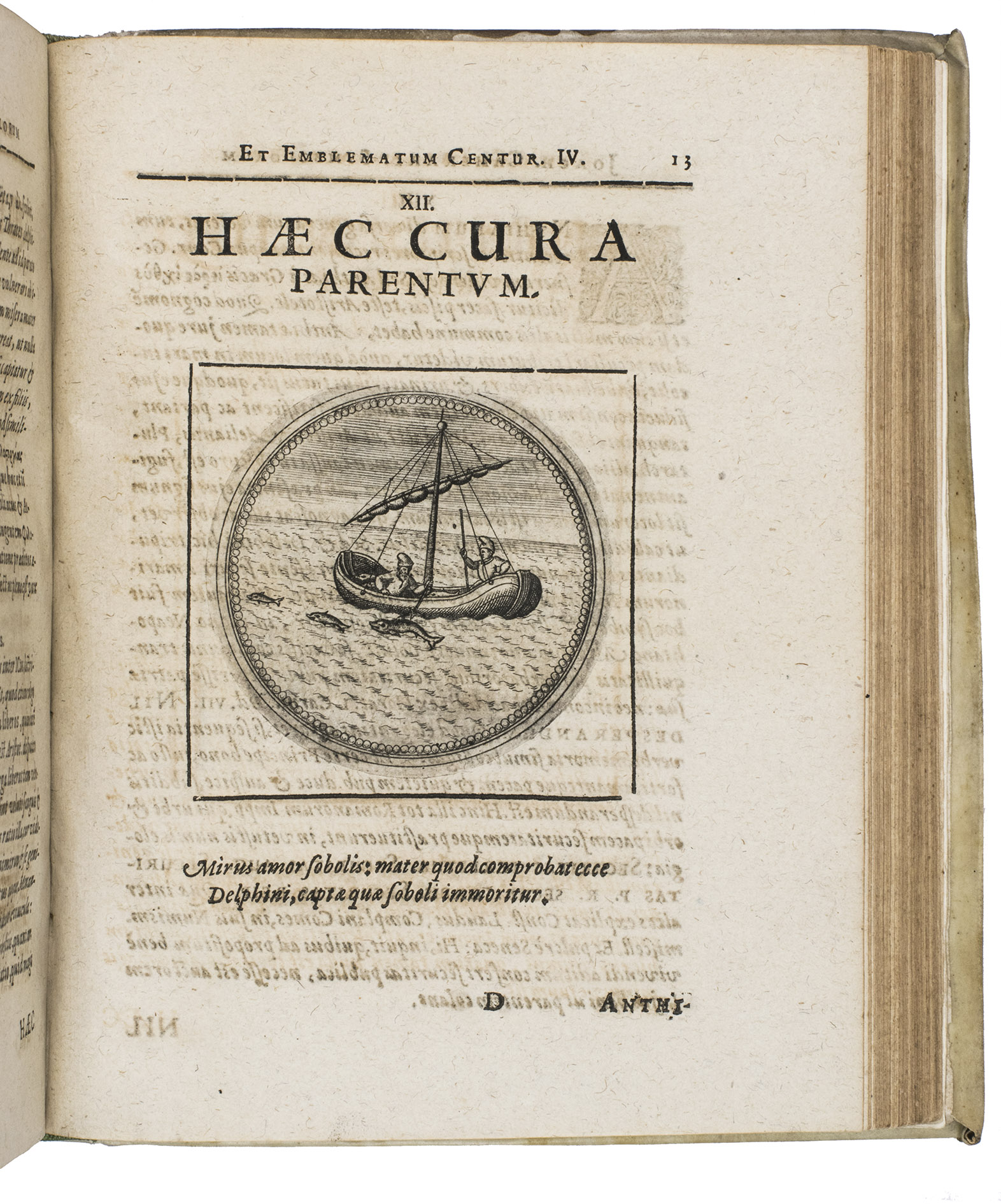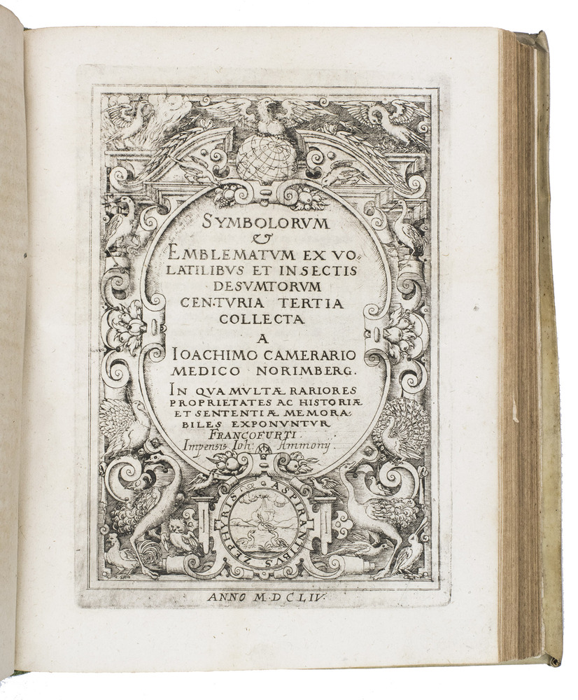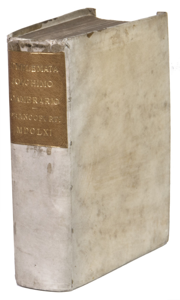 With a large armorial bookplate mounted on the front pastedown, and an illegible manuscript inscription on the engraved title page of ad 1. The binding is slightly (dust) soiled and shows a few (ink) stains, 6 leaves with marginal repair to paper, some minor browning to the top edge, slightly affecting the head margin throughout but never affecting text or emblem, some occasional light foxing and browning. Otherwise in good condition. Adams C448; Faber du Faur, 668; Folger IV, p. 350; Henkel & Schöne, Emblemata, pp. xxxviii-xxxix; Hunt, 181; Krivatsy, 2066; Landwehr, German emblem books, 167 (ad 3) and 169 (ads 1 & 2); Manning, The Emblem, p. 120; Nissen BBI 312; Nissen ZBI 792 & 793; Praz, pp. 295-296; USTC 2567143 (ad 1, 6 copies), 2567135 (ad 2, 4 copies), 2635767 (ad 3, 3 copies); 2808385 (ad 4, 2 copies); VD17 23:278138E (general), VD17 23:278133S (ad 1, 7 copies), VD17 1:078865L (ad 2, 5 copies), VD17 23:27837X (ad 3, 4 copies); Wenning, Joachim II. Camerarius. Eine Studie über sein Leben; cf. ad 4 not in VD17 or in Landwehr, German emblem books.