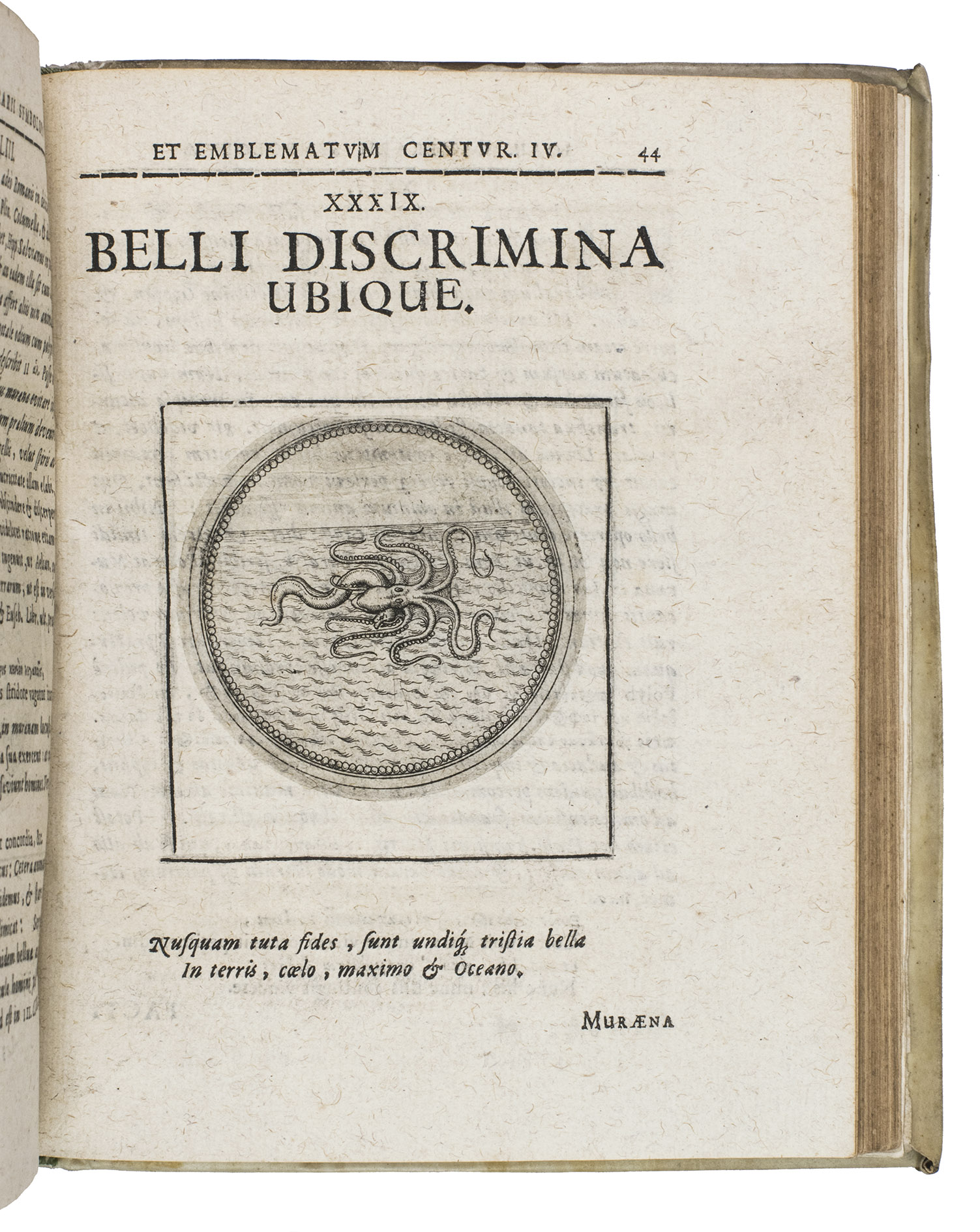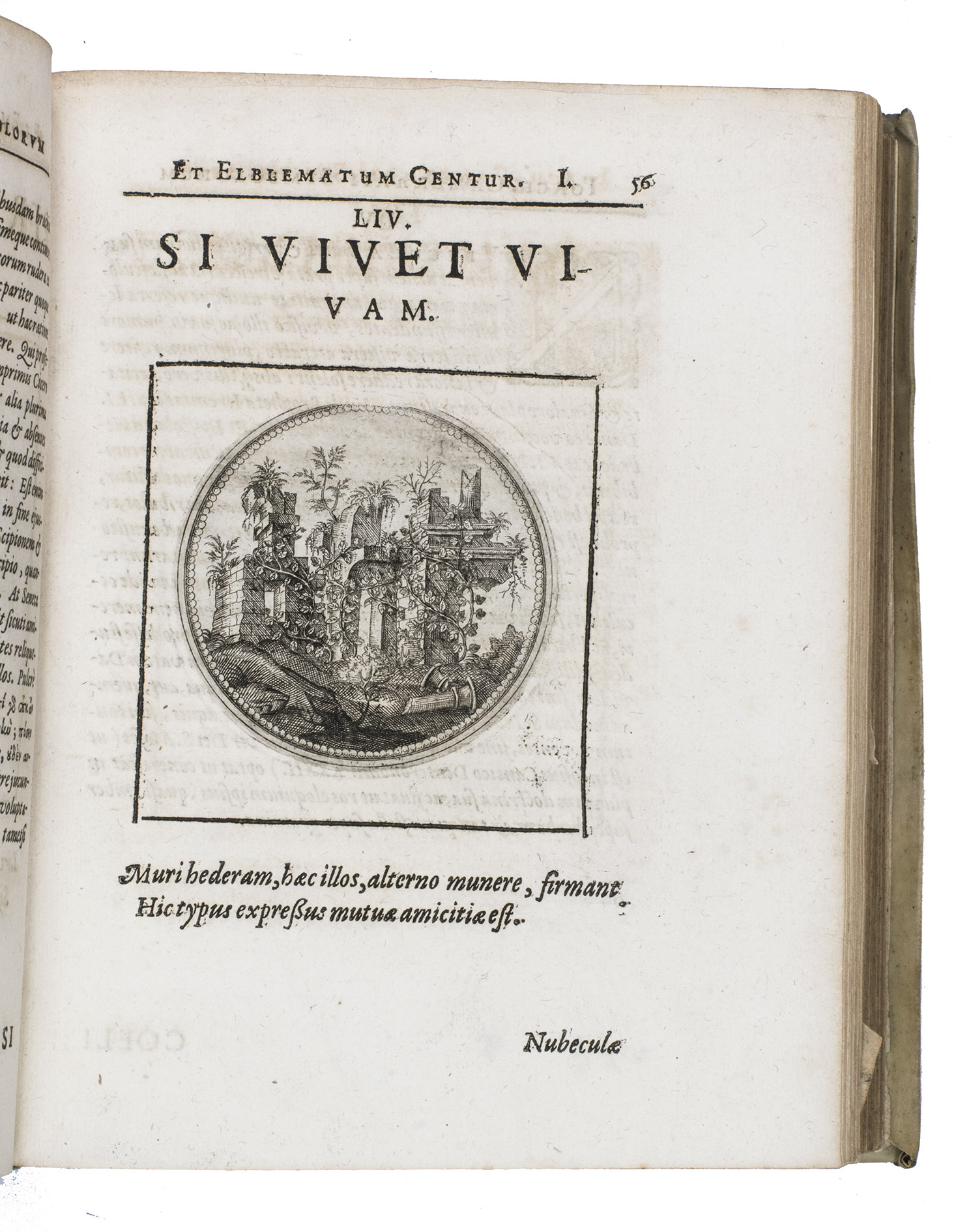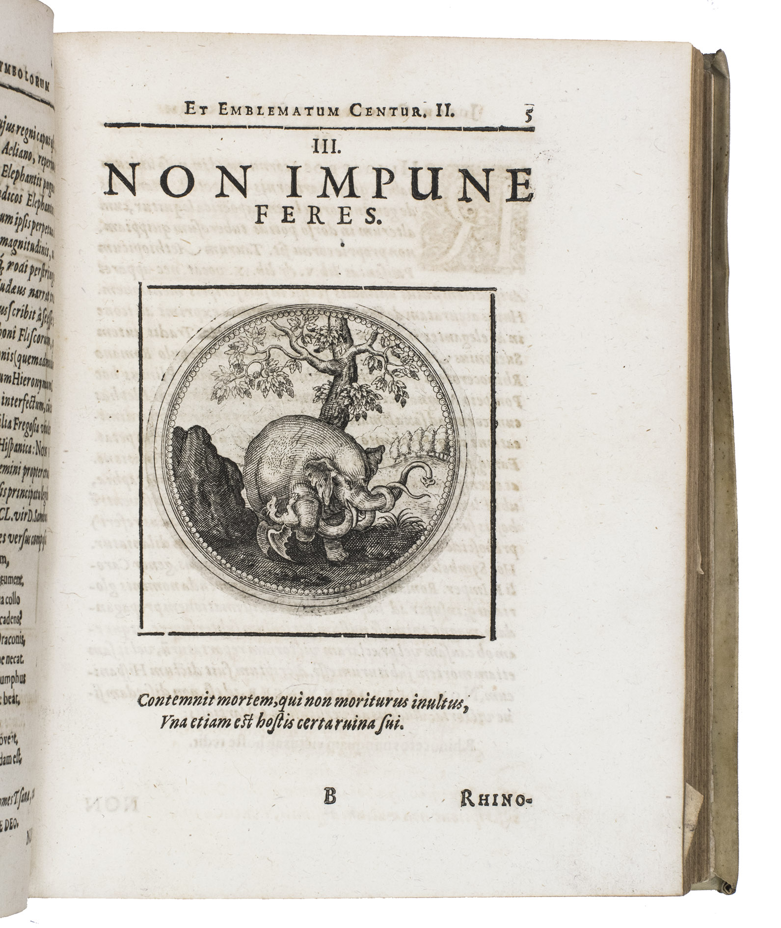 With a large armorial bookplate mounted on the front pastedown, and an illegible manuscript inscription on the engraved title page of ad 1. The binding is slightly (dust) soiled and shows a few (ink) stains, 6 leaves with marginal repair to paper, some minor browning to the top edge, slightly affecting the head margin throughout but never affecting text or emblem, some occasional light foxing and browning. Otherwise in good condition. Adams C448; Faber du Faur, 668; Folger IV, p. 350; Henkel & Schöne, Emblemata, pp. xxxviii-xxxix; Hunt, 181; Krivatsy, 2066; Landwehr, German emblem books, 167 (ad 3) and 169 (ads 1 & 2); Manning, The Emblem, p. 120; Nissen BBI 312; Nissen ZBI 792 & 793; Praz, pp. 295-296; USTC 2567143 (ad 1, 6 copies), 2567135 (ad 2, 4 copies), 2635767 (ad 3, 3 copies); 2808385 (ad 4, 2 copies); VD17 23:278138E (general), VD17 23:278133S (ad 1, 7 copies), VD17 1:078865L (ad 2, 5 copies), VD17 23:27837X (ad 3, 4 copies); Wenning, Joachim II. Camerarius. Eine Studie über sein Leben; cf. ad 4 not in VD17 or in Landwehr, German emblem books.
