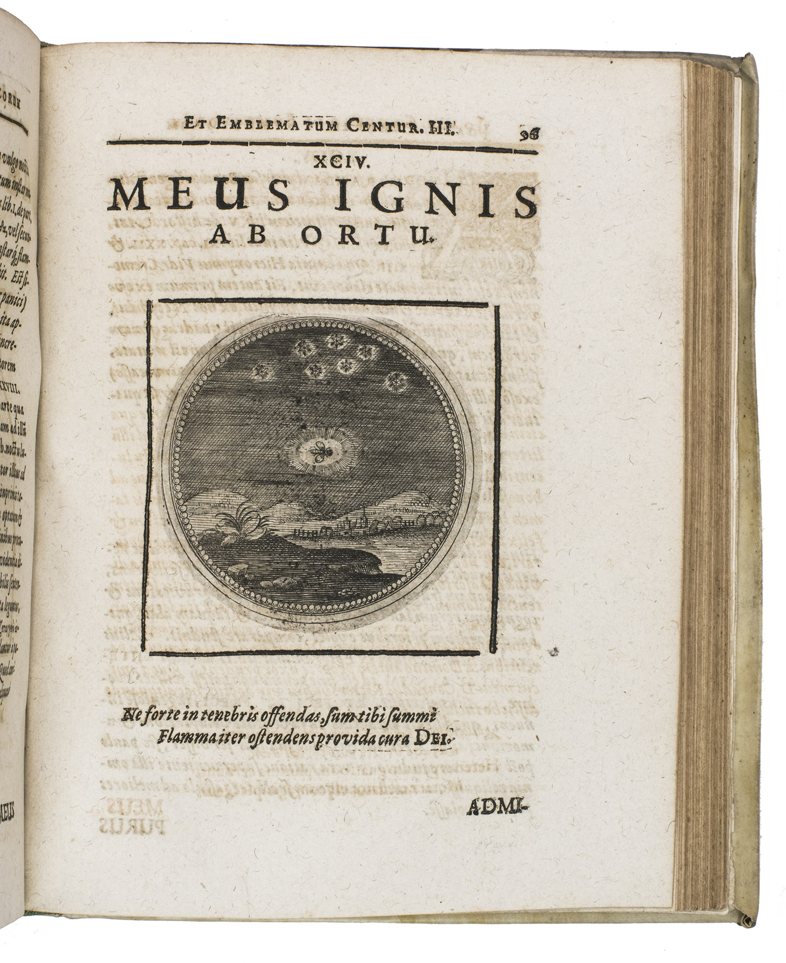 Heidelberg, Ludwig Bourgeat, 1664. 4 works in 1 volume. 4to. Each work with an engraved title page, 100 round engraved emblems (a total of 400), and numerous woodcut initials. (Near) contemporary overlapping vellum, sewn on 4 supports laced through the joints, with a beige leather title label lettered in gold on the spine. 102 (the first ll. after the title page paginated 1-6); 103, [1 blank]; 104, [1 blank]; 100, [1], [1 blank] ll.