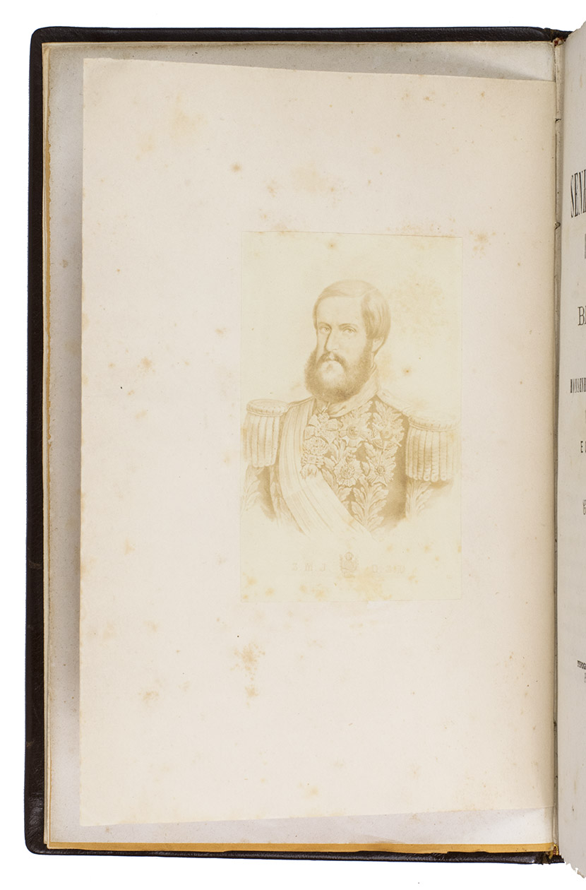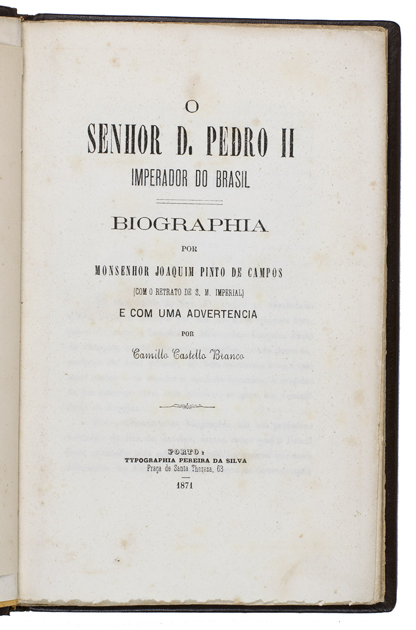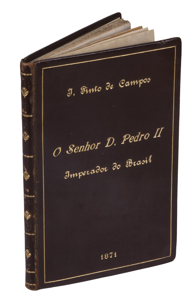 Porto, typographia Pereira da Silva, 1871. 8vo. With a small portrait (5.5 x 9 cm) of the emperor of Brazil, Dom Pedro II, pasted on a separately inserted leaf before the title-page. The original orange publisher's printed paper wrappers show the title, author and imprint information set in a decorative frame on the front wrapper and a similar frame with an ornamental centre-piece on the back wrapper. Gold-tooled calf with the author, title, and year of publication lettered in gold on the front board. Bound with the original orange printed paper wrappers. [1], [1 blank], VIII, 96, [1 blank], [1] pp.