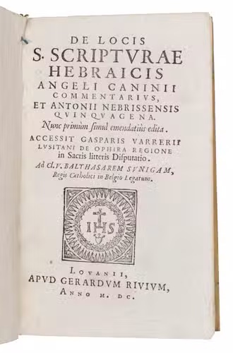 De locis s. scripturae Hebraicis Angeli Caninii commentarius et Antonii Nebrissensis quinquagena. Nunc primùm simul emendatiùs edita. Accessit Gasparis Varrerii lusitani De ophira regione in sacris litteris disputatio.