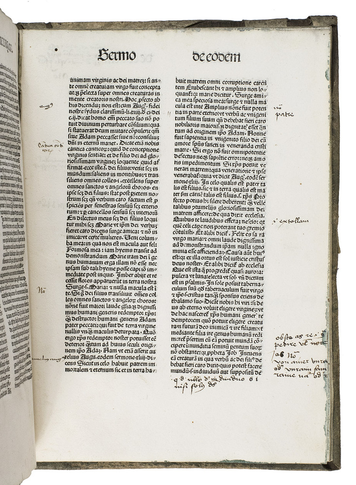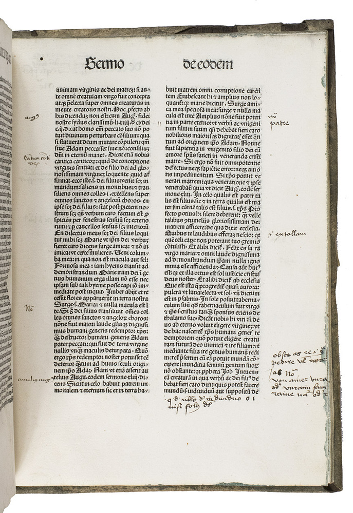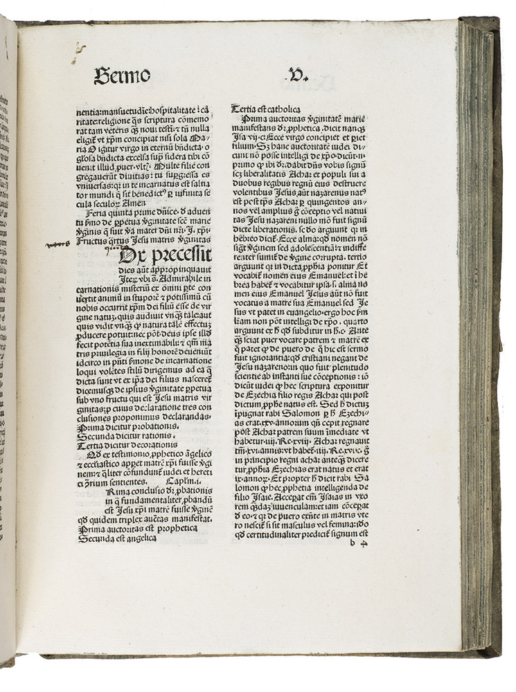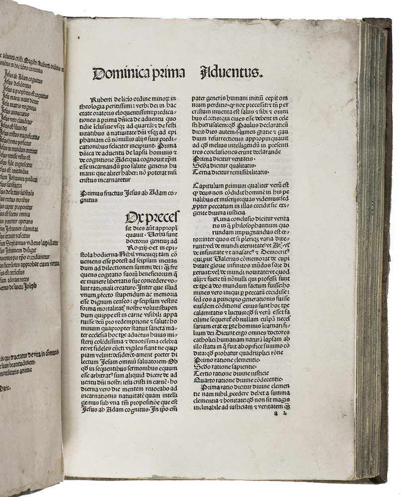 The last of six incunable editions, all in the original Latin, of a collection of about 70 sermons by the celebrated Italian Franciscan bishop and preacher, Roberto Caracciolo da Lecce (ca 1425-1495), published together with Dominico Bollanis treatise (also in the form of a sermon) defending the doctrine of the immaculate conception of the Virgin Mary, as usual in the early editions, the whole probably first published at Venice late in 1474 (Bollani dedicated his treatise to the Doge of Venice, Niccolò Marcello, who died on 1 December 1474). Caracciolo, a popular preacher and theologian, was appointed Bishop of Aquino (and later of his native Lecce, both in the Kingdom of Naples). Caracciolo, one of the most famous preachers of his time, earned the nicknames "the second Paul" and "the prince of preachers". His sermons, enlivened when he delivered them in public by his great skill as a mimic, unleashed the enthusiasm not only of the crowds but also of popes (Nicholas V, Callixtus III, Sixtus IV) and sovereigns (Cosimo de Medici, Francesco Sforza, Ferdinand II of Aragon). Fifty years of preaching earned him the reputation as a model popular pulpit orator, so that his temperamental, sometimes trivial way of preaching found many imitators. His several published collections of sermons, the first at Venice in 1472, quickly caught on with the book-buying audience of Early Modern Europe. All together they went through 80 editions from 1472 to ca. 1500: his catchy writing style made him the most printed Italian preacher of the 15th century and a best-selling author.
