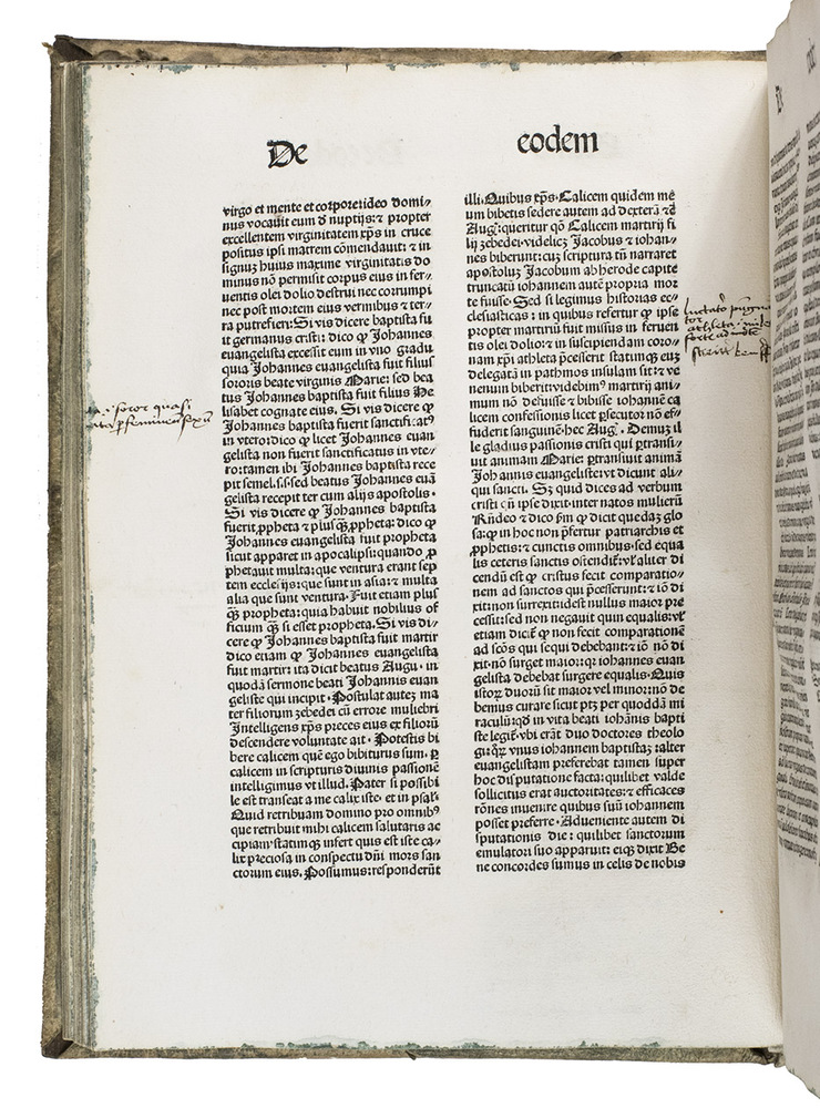 With contemporary marginal manuscript notes, most extensively in the Bollani. Although the binding workshop is said to have been active for a decade before the publication of the present edition, it bound editions of 1498 and 1500, and the present book seems likely to have been used unbound or in a temporary binding for a few years, because the binder shaved some of the manuscript notes at the head and fore-edge. The title-leaf a1 has stains at the head, and creases and tears in its gutter margin, where it has been reinforced with a paper slip. Further with occasional minor marginal wormholes, not affecting the text. Otherwise in very good condition (most leaves fine), clean and only slightly trimmed, leaving generous margins. Two or three holes in the pigskin covering the boards were probably defects already present at the time of binding and perhaps also three cuts in that of the back board. The tooling on the spine is difficult to see, but that on the boards is crisply impressed and generally in good condition. BMC p. 95; Borm, Incunabula Guelferbytana 690; BSB-Ink C113; Catalogo general de incunables en bibliotecas espanolas 1446; Collijn Katalog der Inkunabeln der Kgl. Universitäts-Bibliothek zu Uppsala 407; Goff Incunabula in American libraries³ C-142 and Suppl.; GW 6050 (87 copies); Hain 4471; Incunabula quae in bibliothecis Poloniae asservantur 1407; ISTC ic00142000; Madsen Katalog over det Kongelige Biblioteks inkunabler 1018-1020; Oates, A catalogue of the fifteenth-century printed books in the University Library Cambride 169; Ohly-Sack Inkunabelkatalog der Stadt- und Universitätsbibliothek und anderer öffentlicher Sammlungen in Frankfurt am Main 784-786; Polain Catalogue des livres imprimés au quinzième siècle des bibliothèque de Belgique 995; Proctor 405; Sack Die Inkunabeln der Universitätsbibliothek und anderer öffentlicher Sammlungen in Freiburg im Breisgau und Umgebung 914; Sajó. Soltész Catalogus incunabulorum quae in bibliothecis publicis Hungariae asservantur 906; Thienen Incunabula in Dutch libraries 1129; Voulliéme Die Inkunabeln der öffentlichen Bibliothek und der kleineren Büchersammlungen der Stadt Trier Trier 1380; Voulliéme, Die Inkunabeln der Königlichen Bibliothek und der anderen Berliner Sammlungen 2243. 2243.2; Walsh: Harvard A catalogue of the fifteenth-century printed books in the Harvard University Library 147; Yukishima Incunabula in Japanese Libraries 120; Zehnacker Catalogues régionaux des incunables des bibliothèques publiques de France XIII 620.