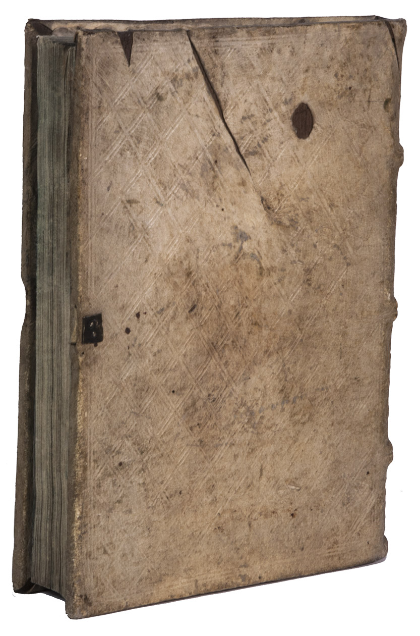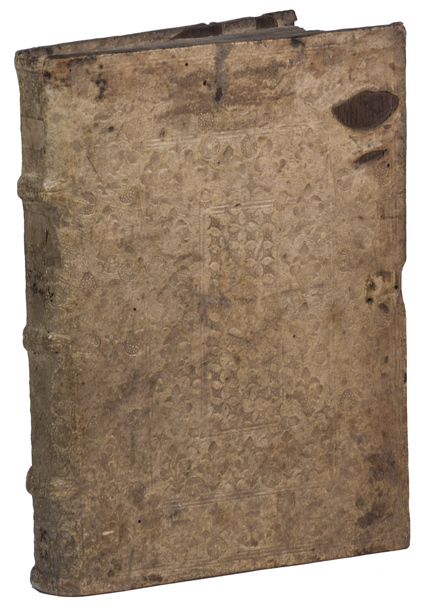 Near contemporary (ca. 1500?), richly blind-tooled pigskin over square-edge boards (Eindbanddatenbank workshop w002296, active in Bavaria ca. 1473(?)-1502). With the remains of one strap-fastening (brass anchor-plate, remnants of the alum-tawed leather strap, but catchplate and clasp lost), blue-green edges. Vellum manuscript waste used for reinforcement, showing bits of Isaias 5:8-26 from a Vulgate Bible in a large textura hand. [100], [17], [1 blank] ll.