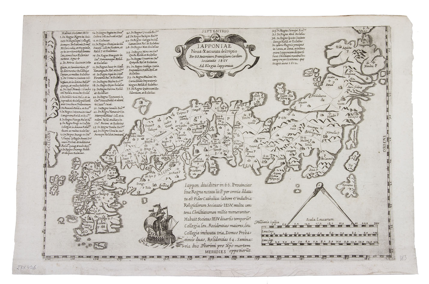 Rare map of Japan from Antonio Cardim's important report on the mission in Japan, Fasciculus e Japponicis floribus ... (Rome 1646: Nipponalia 1638, with illustrations). The map was engraved based on the map published by Bernardino Ginnaro at Naples in 1641, the earliest printed version of Moreira's map. Cardim took over the image of Japan virtually unchanged, though in his map the connection by water between the Bay of Osaka and Lake Biwa begins to widen, so that the latter appears to be a bay. The Ginnaro map is contained in the first volume of Ginnaro's work on the Jesuit mission in Asia. In copying Ginnaro's map, Cardim left out some of the decorative accessories, but one of the ships is shown here in connection with Francisco de Xavier's landing in Japan in 1549, with Xavier himself appearing at the stern! Cardim also lists 36 Jesuit settlements and marks Christian communities with a cross. The place-names are given in Portuguese form.
