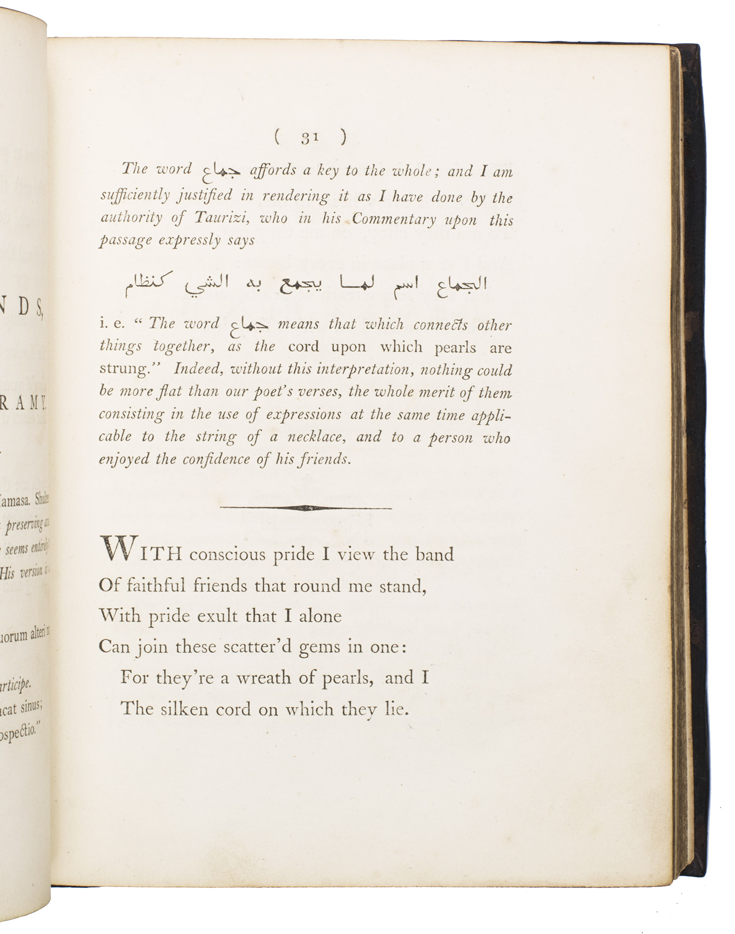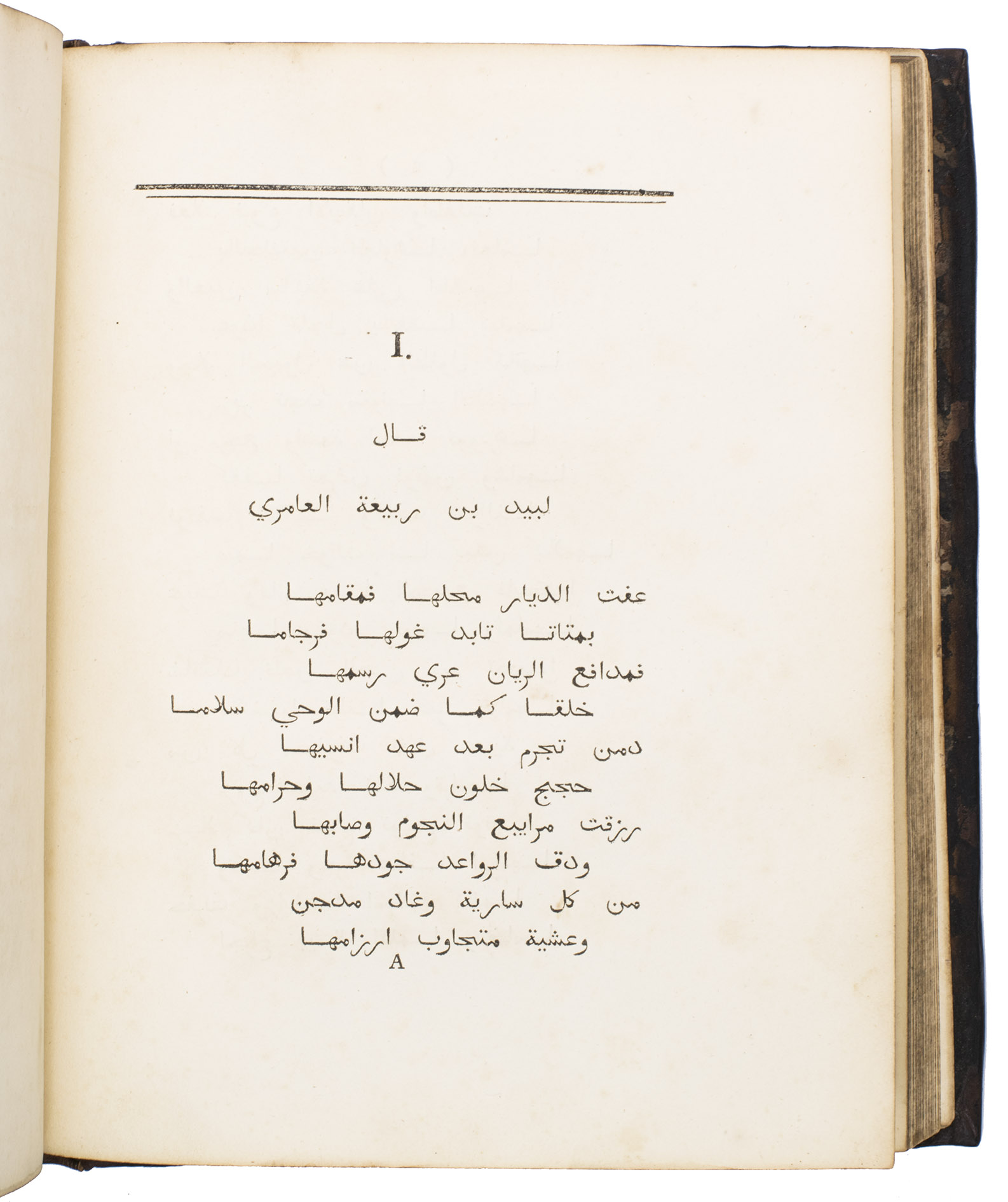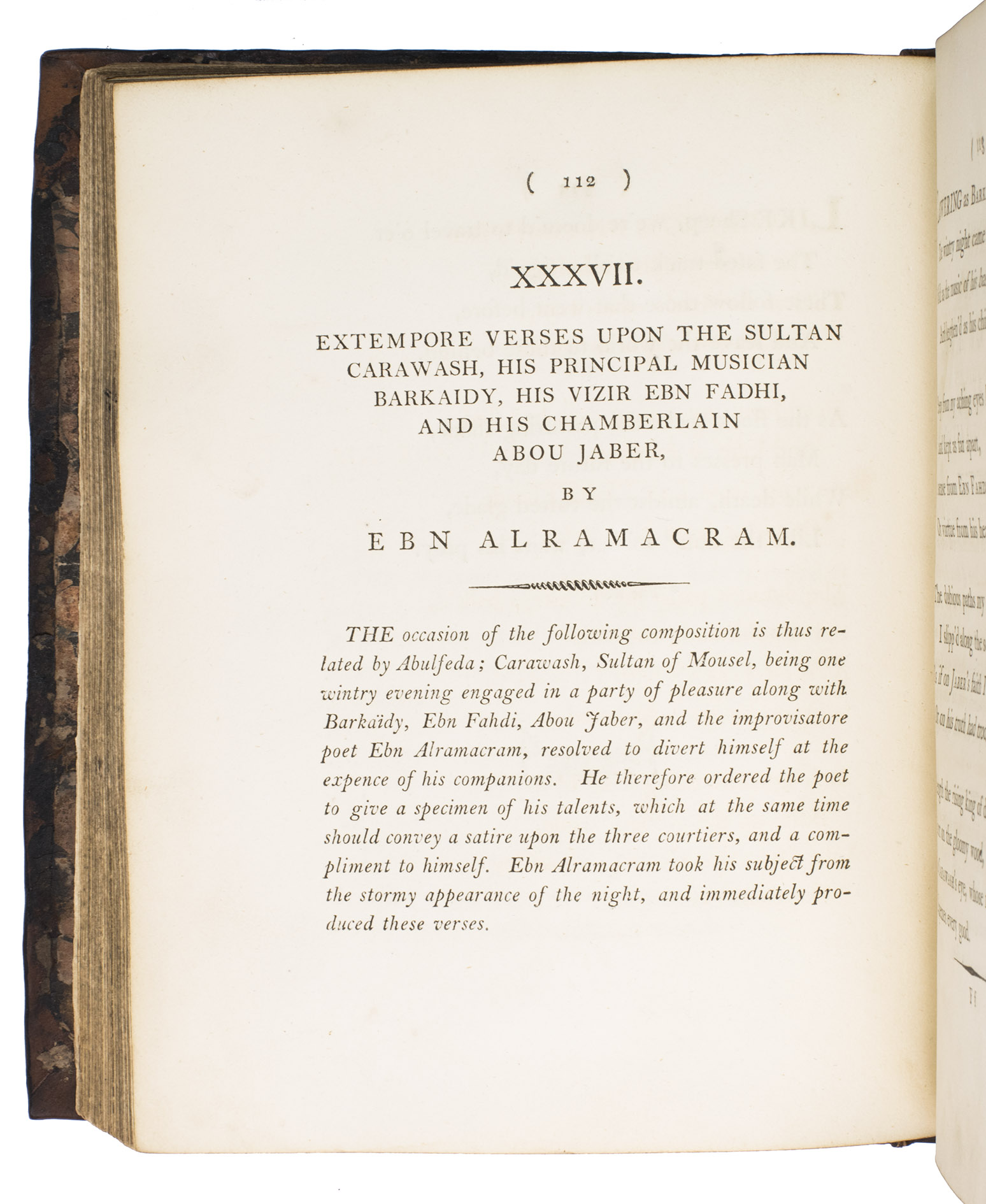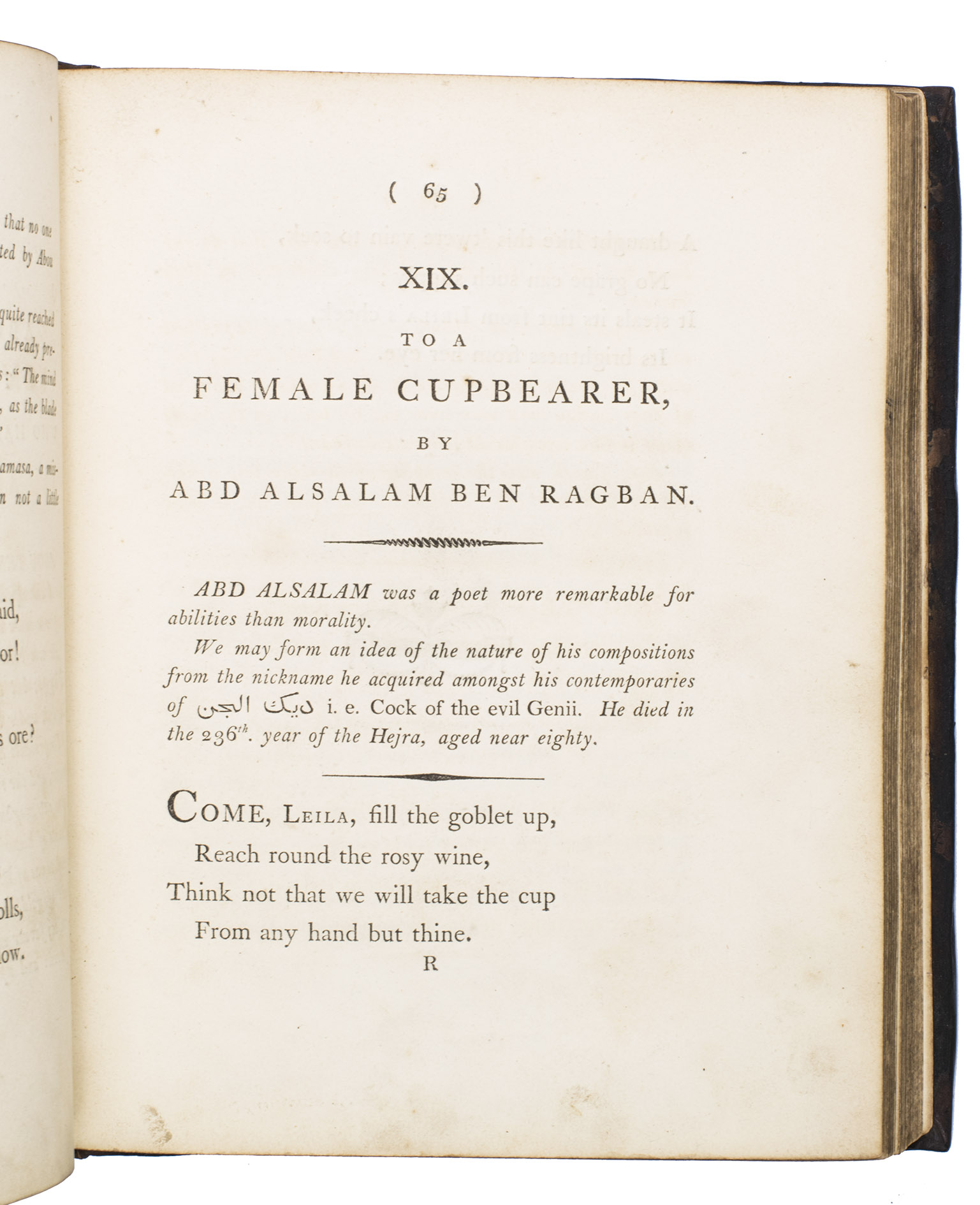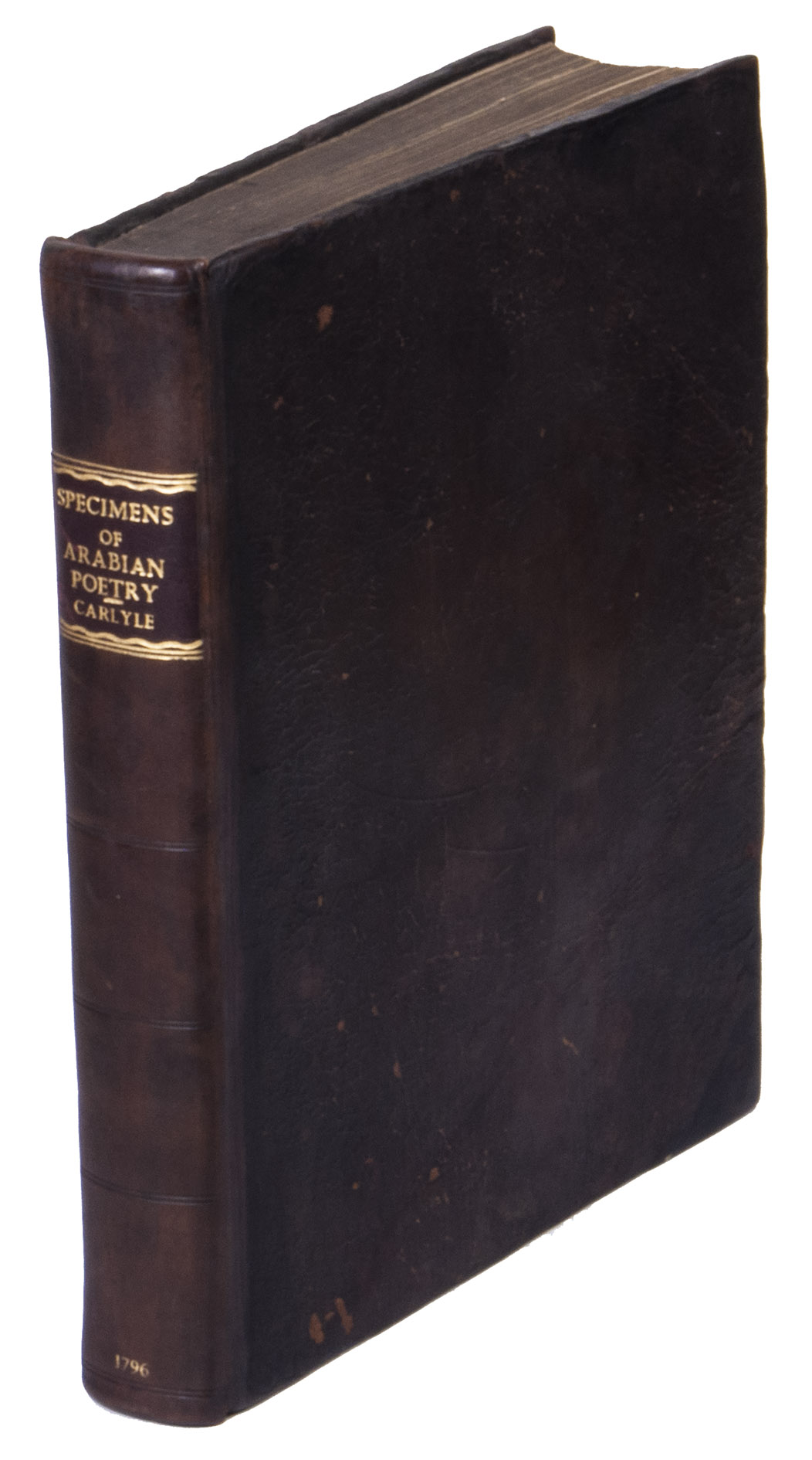 First edition of this beautiful example of Orientalist scholarship, presenting sixty early Arabic poems in their original language with English translations. This work by Orientalist Joseph Dacre Carlyle (1758-1804) enabled the English to discover the beauty of Arabic literature. The poems, which cover a wide range of topics, offer a glimpse into the rich cultural heritage of the Arab world. Carlyle was the first to translate these poems into English. His translations became quite well-known and continued to be used in other works until at least the late 19th century.