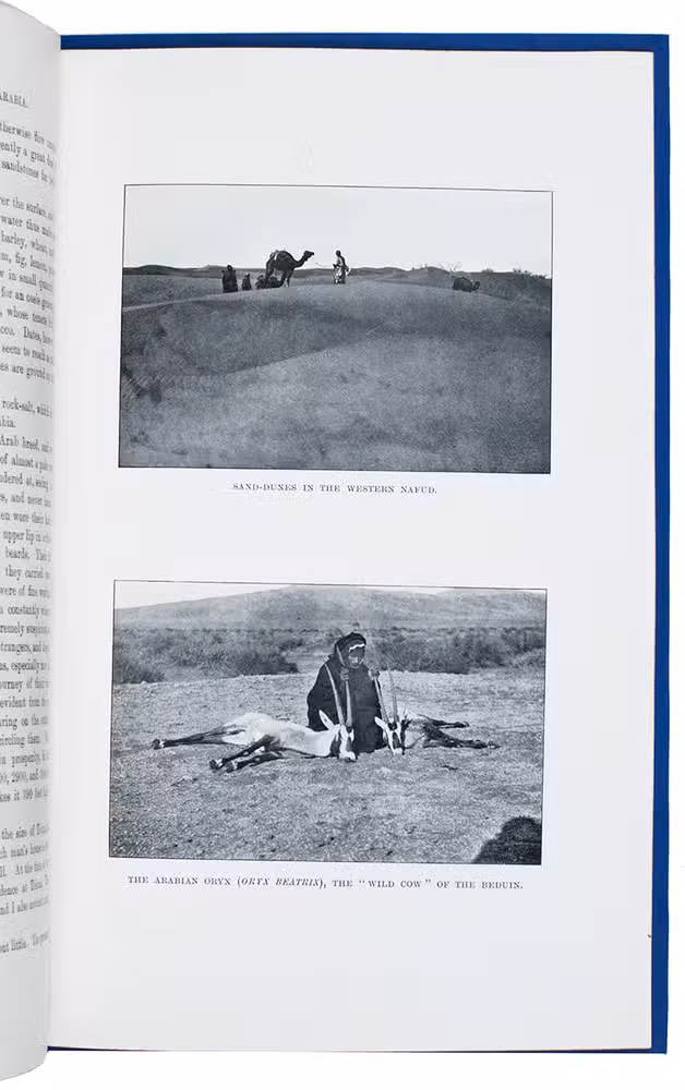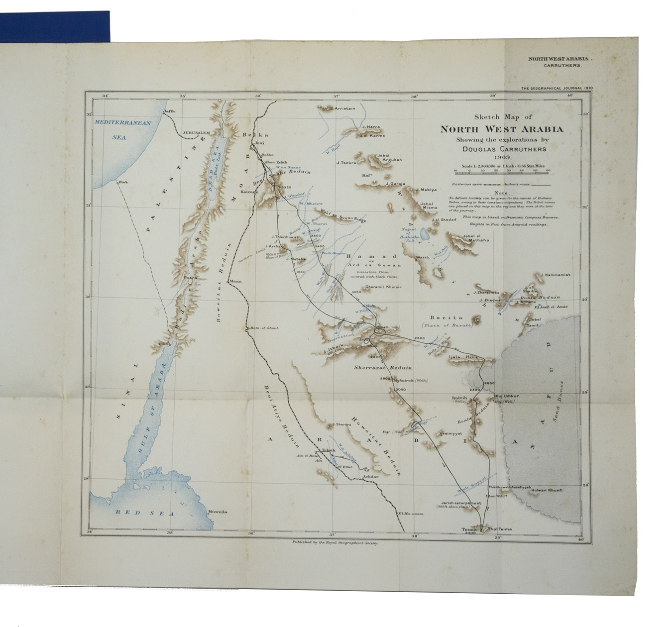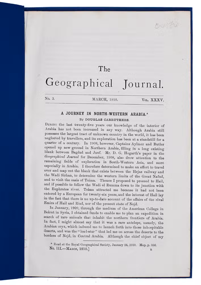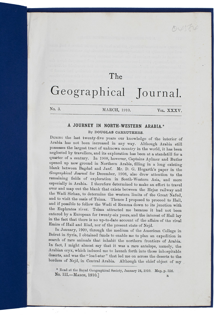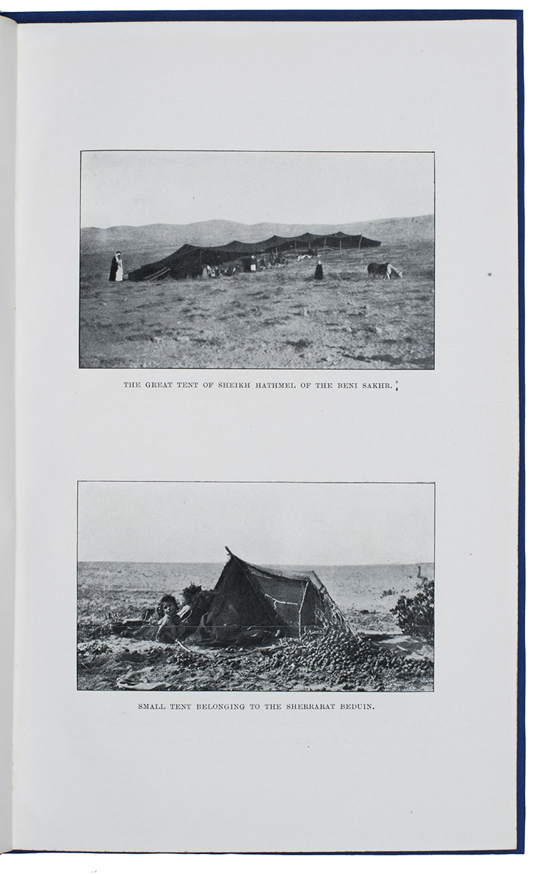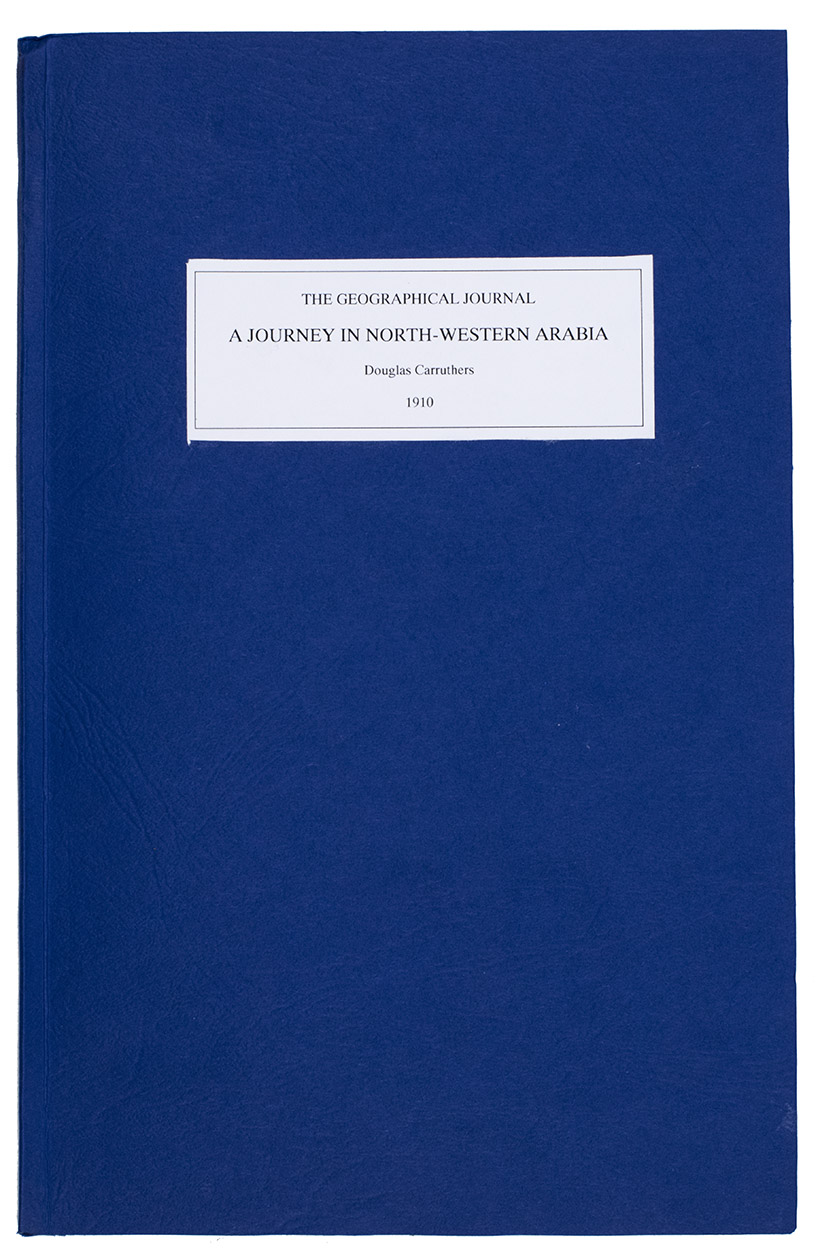 [London, W. Clowes], March 1910. 4to. With 12 black and white photographs made during the journey and a folding chromolithographed map of North-West Arabia (27x30.5 cm). Modern blue wrappers. [32] (numbered 225-248) pp.