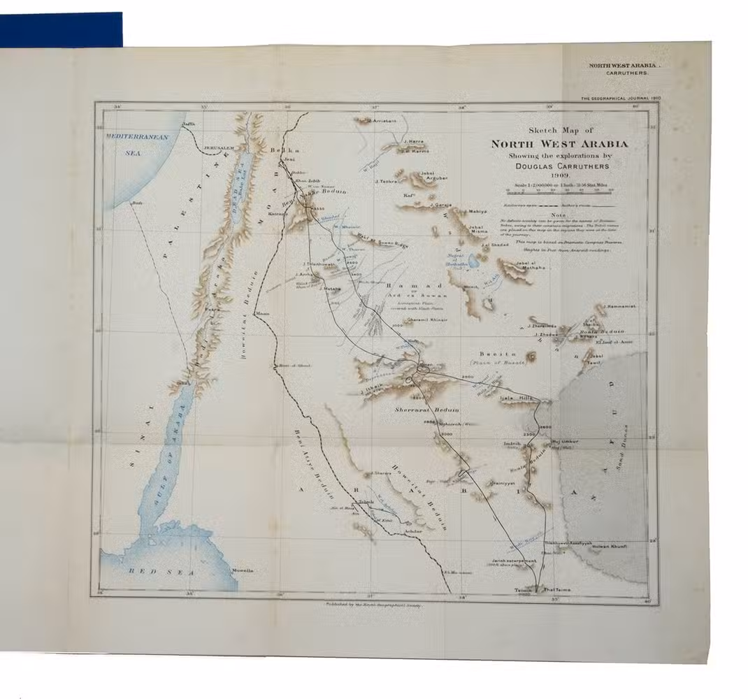 Abstract from The geographical journal, no. 3, vol. XXXV. Transcript of a presentation held at the Royal Geographical Society, January 24, 1910, by Middle-East-explorer Douglas Carruthers (1882-1962). He traveled the region that is now Jordan and north-west Saudi Arabia in an attempt to survey the land survey for latitudes and waterways. He also shows an anthropological interest by describing and depicting several Bedouin tribes, which he includes in his map. The tribal names are placed on the map in the regions where they were at the time of the journey.