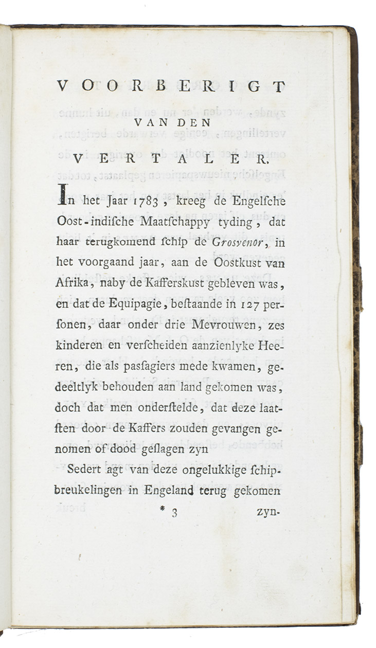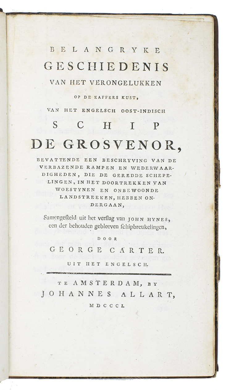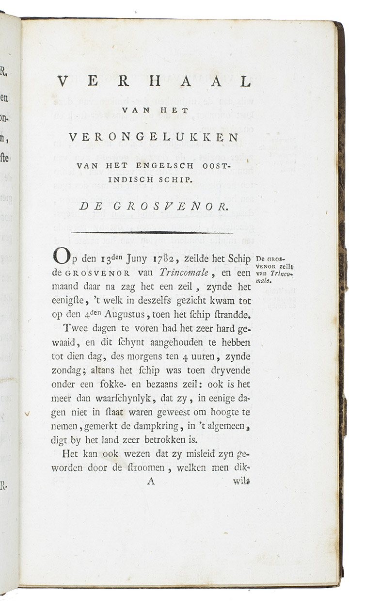 First edition of the Dutch translation of A narrative of the loss of the Grosvenor, East Indiaman, wrecked upon the coast of Caffraria ... (London, J. Murray & W. Lane, 1791). The Grosvenor, a three-masted East Indiaman, carrying a crew of 132 plus 18 passengers (12 adults and 6 children), and a cargo valued at £75,000, had left Madras in March 1782 under the command of Captain John Coxon, on her return voyage to England when she was wrecked on 4 August 1782 on the Pondoland coast of South Africa, north of the mouth of the Umzimvubu River.
