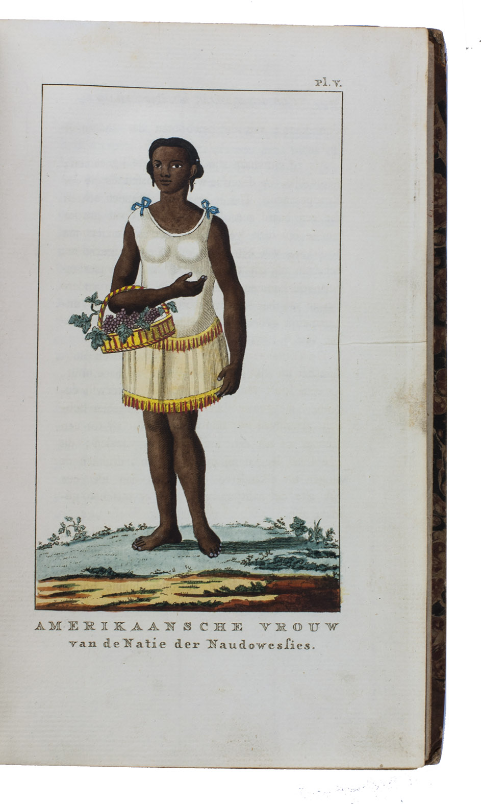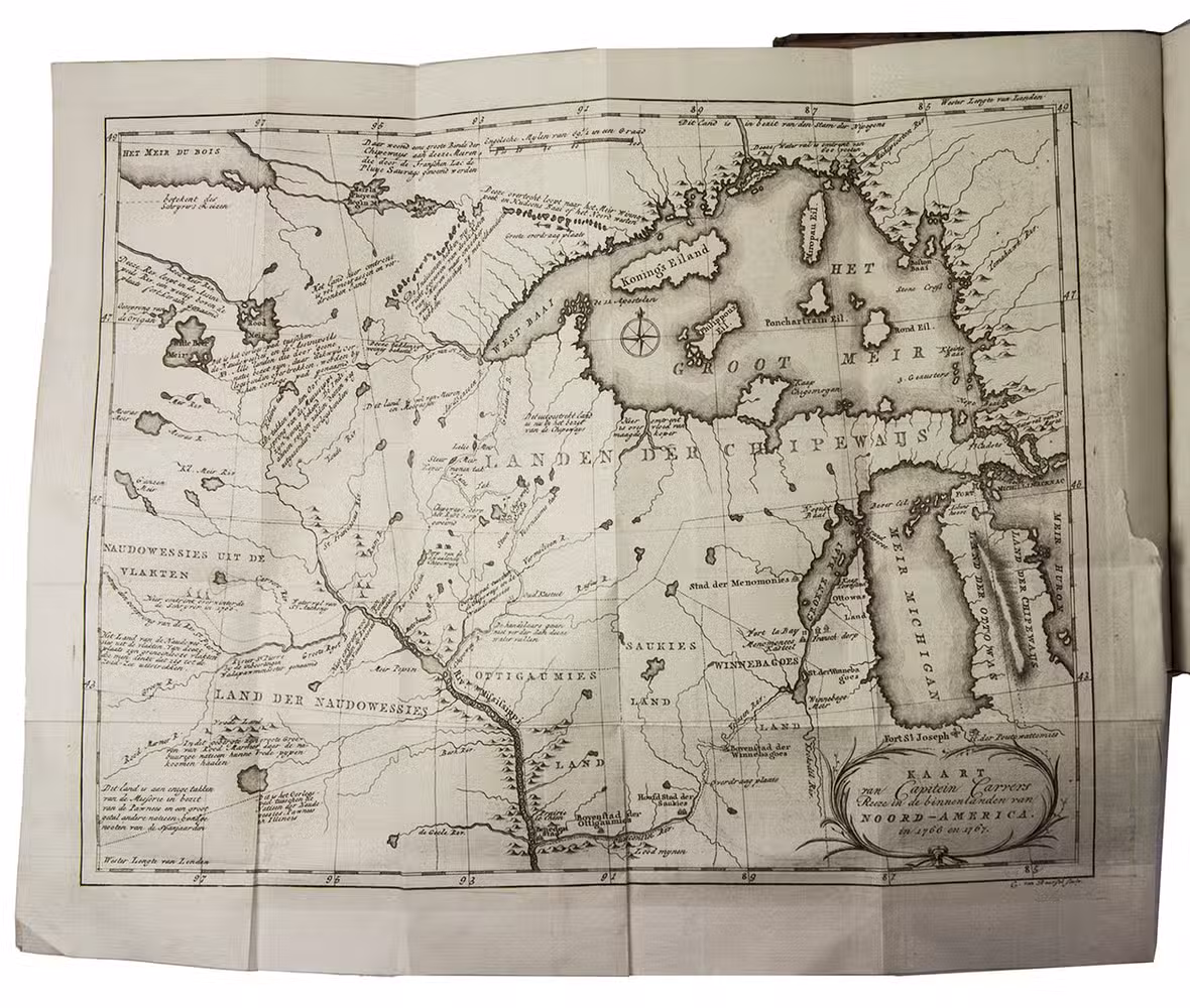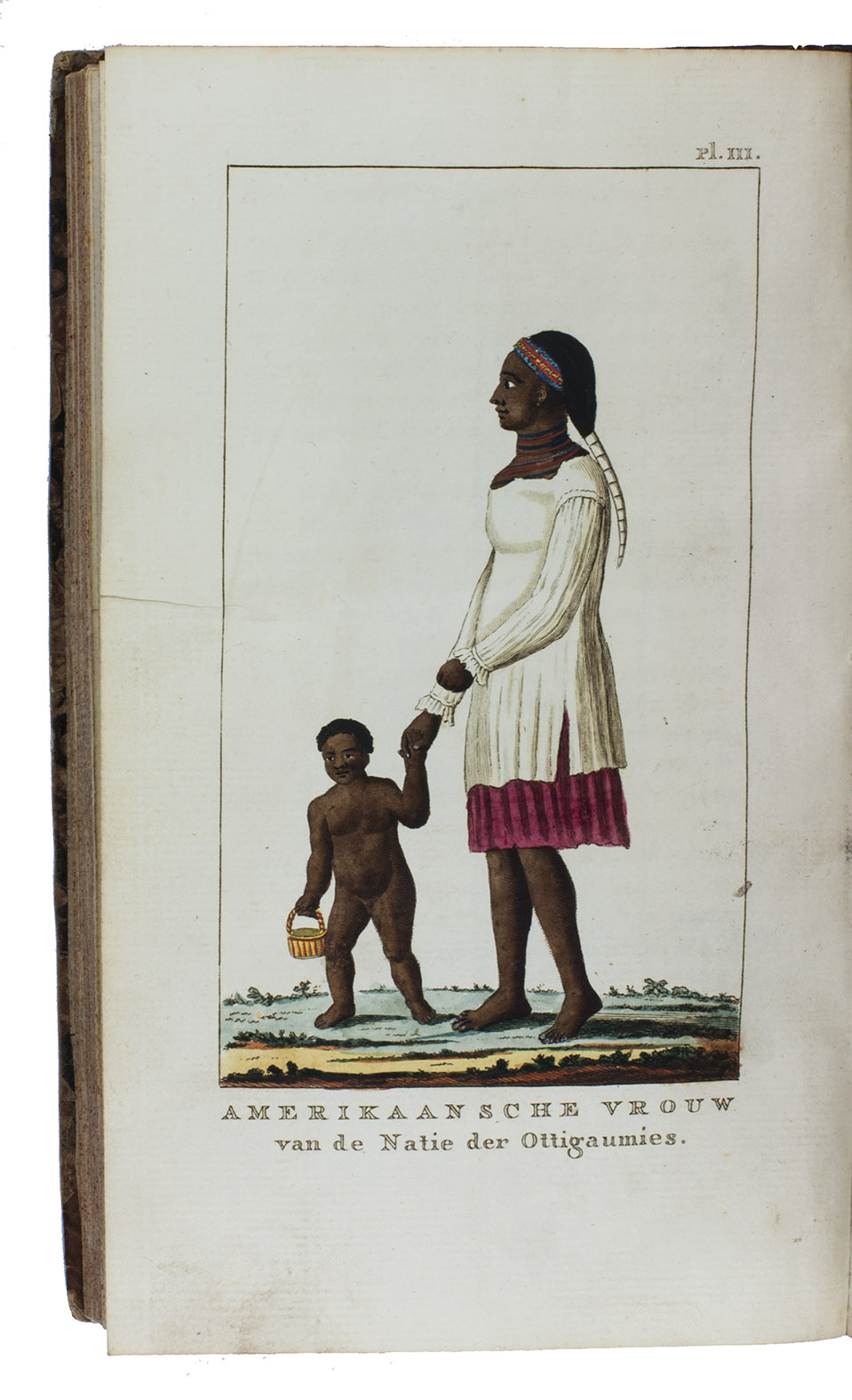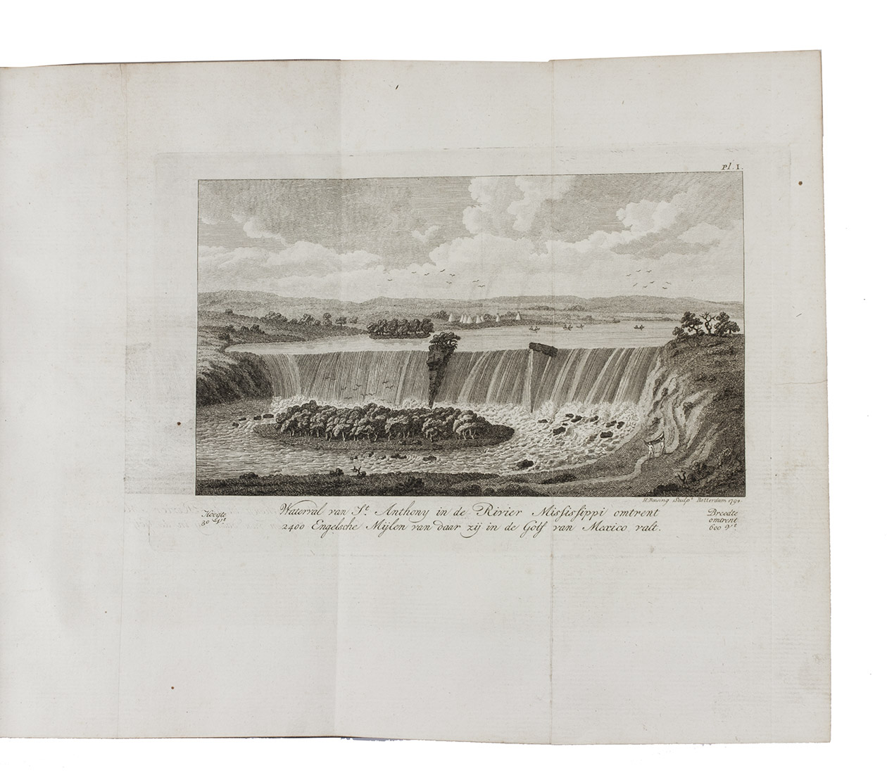 First edition of the Dutch translation of a travelogue of North America by the English-American colonial captain Jonathan Carver (1710-1780). "In 1766 Carver was employed ... to explore to the west of the Great Lake in an attempt to contact the Sioux Indians. ... After wintering with the Indians on the Ste Croix River, Carver set out to return to Mackinac, but at the mouth of the Wisconsin met Captain James Tute, in command of a party send out to explore a route to the Pacific Ocean" (Howgego). The folding map shows the midlands of North America, the folding plate the St. Anthony waterfall in the Mississippi River and the hand-coloured engravings show different native American Indians.